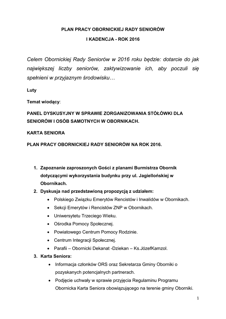 PLAN PRACY OBORNICKIEJ RADY SENIORÓW I KADENCJA - ROK 2016 Celem Obornickiej Rady Seniorów w 2016 roku będzie: dotarcie do jak największej liczby seniorów, zaktywizowanie ich, aby poczuli się spełnieni w przyjaznym środowisku… Luty Temat wiodący: PANEL DYSKUSYJNY W SPRAWIE ZORGANIZOWANIA STÓŁÓWKI DLA SENIORÓW I OSÓB SAMOTNYCH W OBORNIKACH. KARTA SENIORA PLAN PRACY OBORNICKIEJ RADY SENIORÓW NA ROK 2016. 1. Zapoznanie zaproszonych Gości z planami Burmistrza Obornik dotyczącymi wykorzystania budynku przy ul. Jagiellońskiej w Obornikach. 2. Dyskusja nad przedstawioną propozycją z udziałem: Polskiego Związku Emerytów Rencistów i Inwalidów w Obornikach. Sekcji Emerytów i Rencistów ZNP w Obornikach. Uniwersytetu Trzeciego Wieku. Ośrodka Pomocy Społecznej. Powiatowego Centrum Pomocy Rodzinie. Centrum Integracji Społecznej. Parafii – Obornicki Dekanat -Dziekan – Ks.JózefKamzol. 3. Karta Seniora: Informacja członków ORS oraz Sekretarza Gminy Oborniki o pozyskanych potencjalnych partnerach. Podjęcie uchwały w sprawie przyjęcia Regulaminu Programu Obornicka Karta Seniora obowiązującego na terenie gminy Oborniki. 1 Informacja o przewidywanym terminie podjęcia przez Radę Miejską uchwały w sprawie utworzenia „Obornickiej karty Seniora”. 4. Zapoznanie członków Rady z propozycją planu pracy na 2016 rok oraz jego przyjęcie do realizacji. Kwiecień Temat wiodący: PROFILAKTYKA I PROMOCJA ZDROWIA SENIORÓW PODSTAWOWY KURS OBSŁUGI KOMPUTERA DLA SENIORÓW UTWORZENIE STRONY INTERNETOWEJ DLA ORS 1. Informacja o aktualnym stanie opieki zdrowotnej dla osób starszych w mieście i gminie; Oddziały szpitalne po zakończeniu etapu rozbudowy Szpitala w Obornikach. Nowe oddziały, które mają być utworzone w obornickim szpitalu – opieka długoterminowa, hospicjum. Leczenie bólu i opieki paliatywnej – Poradnia Medycyny Paliatywnej w Obornikach. Utworzenie dla seniorów Poradni Geriatrycznej w Obornikach, Program „Bezpłatnych szczepień p. grypie dla seniorów”. 2. Program dot. Informatyzacji Społeczeństwa – Kurs Informatyczny – podstawa obsługi komputera na osobiste potrzeby: Zorganizowanie kursu dla seniorów przez Stowarzyszenie „Barka” Poznań. 3. Wystąpienie do Burmistrza z prośbą o stworzenie odpowiednich działań na rzecz szeroko pojętej informacji dotyczącej działalności ORS: 2 System powinien opierać się na narzędziach dostępnych dla członków ORS, uwzględniając fakt, że część członków ORS może nie obsługiwać komputera i nie ma dostępu do Internetu. Podjęcie działań na rzecz stworzenia strony internetowej: www.obornickaradaseniorow.plw celu wprowadzania i uzupełniania informacji dotyczących działania ORS. Wykonanie tematycznych „zakładek” informujących społeczeństwo o inicjatywach, działaniach, aktualnościach ORS dotyczących seniorów. Sprzężenie niektórych zakładek ze stroną www Urzędu Miejskiego w Obornikach oraz Starostwem Powiatowym. Ustalenie obiegu przekazywania informacji o działalności ORS do administratora strony www.obornickaradaseniorow.plw formie zredagowanego tekstu celem zamieszczenia na stronie. Podjęcie działań mających na celu upowszechnienie w środowisku seniorów strony www.obornickaradaseniorow.ploraz dążenie do skonsolidowania informacji dotyczących seniorów pod jednym adresem w Internecie. Czerwiec Temat wiodący: INTEGRACJA PODMIOTÓW, KTÓRE DZIAŁAJĄ NA RZECZ OBORNICKICH SENIORÓW. PROMOCJA POZYTYWNEGO WIZERUNKU SENIORA 1. Zintegrowanie prac podmiotów działających w Obornikach na rzecz seniorów w celu: Zebrania danych o organizacjach i instytucjach zajmujących się sprawami seniorów, o realizowanych przez nie programach i projektach. 3 Zacieśnienia współpracy z organizacjami i instytucjami zajmującymi się sprawami seniorów w zakresie planowanych działań oraz wymiany informacji poprzez m.in. organizowanie wspólnych spotkań i narad: OPS, PCPR, UTW, OOK, OCS, CRO, ZNP, PZERiI, (Przewodniczący) Młodzieżowa Rada Miejska, Obornickie Parafie, Spółdzielnia Mieszkaniowa Stowarzyszenia: Ludzki Gest, CIS, Rada Sołtysów. Wypracowania wspólnego modelu działań i dotarcie do maksymalnie dużej liczby seniorów w Obornikach. Zbierania i gromadzenia informacji na temat potrzeb obornickich seniorów, które wykorzystane będą w pracach Burmistrza, Rady Miejskiej, Starostwa Powiatowego oraz ORS. Nawiązania współpracy z radami seniorów działającymi w innych miastach. 2. Promocja pozytywnego wizerunku seniora, przełamywanie stereotypów na temat seniorów i starości oraz budowanie ich autorytetu; Promowanie i preferowanie działań senioralnych w organizacjach pozarządowych przy współudziale samorządu. Udział członków ORS w Komisjach Rady Miejskiej i Starostwa Powiatowego. 3. Kontynuacja prac i wyszukiwanie nowych narzędzi dotarcia do maksymalnie dużej liczby obornickich seniorów z informacją o działaniach ORS: Opracowanie i wydawanie informatorów w formie ulotek, umieszczanie ogłoszeń na stronie UM, ORS oraz w biuletynie Nasze Oborniki. Systematyczne informowanie na stronach ORS o wszelkich wydarzeniach kulturalnych (afisze). LIPIEC – SIERPIEŃ PRZERWA URLOPOWA Wrzesień Temat wiodący: 4 WSPÓŁPRACA MIĘDZYPOKOLENIOWA - Konkurs Plastyczny dla szkół podstawowych i gimnazjów. AKTYWNOŚĆ FIZYCZNA OBORNICKICH SENIORÓW 1. Konkurs Plastyczny „Co mógłbym zrobić dla seniora w moim środowisku” na stałe wpisany w plany szkół na terenie miasta i gminy. 2. Opracowanie przez Komisję Oświaty i Spraw Społecznych przy UM w Obornikach regulaminu konkursu określającego: Cel konkursu, warunki uczestnictwa, nagrody i wyróżnienia. Termin realizacji, skład komisji konkursowej. Środki na nagrody - zabezpieczenie z budżetu gminy. 3. Podjęcie działań w celu utworzenia Klubu Sportowego "Senior" skupiającego seniorów zawodników i seniorów trenerów: W ramach tego klubu, mogłaby nastąpić koordynacja działa
