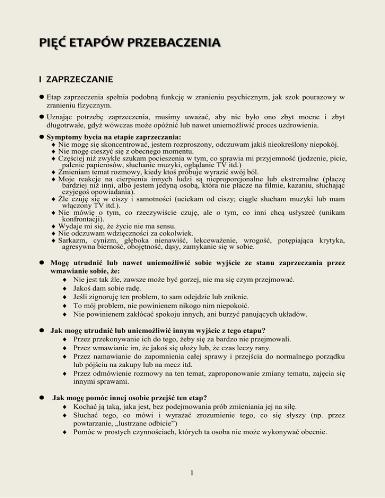 PIĘĆ ETAPÓW PRZEBACZENIA I ZAPRZECZANIE Etap zaprzeczenia spełnia podobną funkcję w zranieniu psychicznym, jak szok pourazowy w zranieniu fizycznym. Uznając potrzebę zaprzeczenia, musimy uważać, aby nie było ono zbyt mocne i zbyt długotrwałe, gdyż wówczas może opóźnić lub nawet uniemożliwić proces uzdrowienia. Symptomy bycia na etapie zaprzeczania: Nie mogę się skoncentrować, jestem rozproszony, odczuwam jakiś nieokreślony niepokój. Nie mogę cieszyć się z obecnego momentu. Częściej niż zwykle szukam pocieszenia w tym, co sprawia mi przyjemność (jedzenie, picie, palenie papierosów, słuchanie muzyki, oglądanie TV itd.) Zmieniam temat rozmowy, kiedy ktoś próbuje wyrazić swój ból. Moje reakcje na cierpienia innych ludzi są nieproporcjonalne lub ekstremalne (płaczę bardziej niż inni, albo jestem jedyną osobą, która nie płacze na filmie, kazaniu, słuchając czyjegoś opowiadania). Źle czuję się w ciszy i samotności (uciekam od ciszy; ciągle słucham muzyki lub mam włączony TV itd.). Nie mówię o tym, co rzeczywiście czuję, ale o tym, co inni chcą usłyszeć (unikam konfrontacji). Wydaje mi się, że życie nie ma sensu. Nie odczuwam wdzięczności za cokolwiek. Sarkazm, cynizm, głęboka nienawiść, lekceważenie, wrogość, potępiająca krytyka, agresywna bierność, obojętność, dąsy, zamykanie się w sobie. Mogę utrudnić lub nawet uniemożliwić sobie wyjście ze stanu zaprzeczania przez wmawianie sobie, że: Nie jest tak źle, zawsze może być gorzej, nie ma się czym przejmować. Jakoś dam sobie radę. Jeśli zignoruję ten problem, to sam odejdzie lub zniknie. To mój problem, nie powinienem nikogo nim niepokoić. Nie powinienem zakłócać spokoju innych, ani burzyć panujących układów. Jak mogę utrudnić lub uniemożliwić innym wyjście z tego etapu? Przez przekonywanie ich do tego, żeby się za bardzo nie przejmowali. Przez wmawianie im, że jakoś się ułoży lub, że czas leczy rany. Przez namawianie do zapomnienia całej sprawy i przejścia do normalnego porządku lub pójściu na zakupy lub na mecz itd. Przez odmówienie rozmowy na ten temat, zaproponowanie zmiany tematu, zajęcia się innymi sprawami. Jak mogę pomóc innej osobie przejść ten etap? Kochać ją taką, jaka jest, bez podejmowania prób zmieniania jej na siłę. Słuchać tego, co mówi i wyrażać zrozumienie tego, co się słyszy (np. przez powtarzanie, „lustrzane odbicie”) Pomóc w prostych czynnościach, których ta osoba nie może wykonywać obecnie. 1 Jak mogę pomóc sobie? Pozwolić sobie trwać w tym stanie tak długo, jak długo potrzebuję, czyli do momentu, kiedy czuję się wystarczająco kochany, aby zmierzyć się z cierpieniem, lub przynajmniej spojrzeć na swoje zranienie. Przebywać częściej w miejscu, gdzie czuję się „u siebie”, gdzie mógłbym być sobą, z osobami, które mnie kochają i w pełni akceptują. Rozmyślać nad miłością Boga, otwierać się na Jego miłość (patrz niżej). Unikać ludzi, którzy na siłę chcą mnie wyrwać z tego stanu, którym się wydaje, że wiedzą, co potrzebuję lub co powinienem zrobić. ĆWICZENIE 1 Poznawanie zranień, które Jezus chce teraz uleczyć. 1. Poproś Ducha Świętego o prowadzenie i ukazanie zranienia, które Jezus pragnie uleczyć. 2. Uświadom sobie swoje obecne uczucia i skoncentruj się na nich. 3. Mówiąc Jezusowi o tym uczuciu obserwuj, jakie wspomnienie pojawia się w twojej wyobraźni. 4. Zastanów się nad tym, w jaki sposób te doświadczenia zraniły cię. ĆWICZENIE 2 Pomoc w przekroczeniu etapu zaprzeczania. 1. Powiedz Chrystusowi o swoich uczuciach. (Łk24,13-24). O którym wydarzeniu, albo przeżyciu z mojego życia myślę, że lepiej by było, żeby w ogóle nie zaistniało, albo żeby przebiegło inaczej? Jaki brak odczuwam w swoim życiu? Czego potrzebuję, abym własne życie odczuwał jako doskonałe? Za czym tęsknię? Co mnie niepokoi? Czego się lękam? Jakie lęki mają największy wpływ na moje życie? Za czyje osiągnięcie lub sukces najtrudniej jest mi dziękować Bogu? 2. Wsłuchaj się poprzez Pismo św. w uczucia Chrystusa, w Jego reakcję (Łk24,25-27). Który fragment Pisma św. zacytowałby mi Jezus, gdyby szedł ze mną do Emaus? Przeczytaj ten fragment dwa, trzy razy i z zamkniętymi oczami spróbuj wyobrazić sobie jego treść i przeżyć ją. 3. Wprowadź w życie natchnienie, którego udzielił ci Jezus (Łk24,32-35). ĆWICZENIE 3 Lokalizacja problemu. 1. Gdyby teraz zadzwonił telefon, czyjego głosu najbardziej nie chciałbym usłyszeć w słuchawce? 2. Z kim najbardziej nie chciałbym się znaleźć na jednej łodzi ratunkowej? 3. Z kim najbardziej nie chciałbym mieszkać na bezludnej wyspie? 4. Za co (jaki element lub okres mojego życia) jestem najmniej wdzięczny? 2 II GNIEW I ZŁOŚĆ Podobnie jak ból fizyczny informuje nas o tym, że dzieje się coś niedobrego z naszym ciałem, tak samo przykre emocje (np. złość, smutek) informują nas o tym, że dzieje się coś niedobrego w naszej psychice. W sytuacji, kiedy zostaliśmy skrzywdzeni, nie powinniśmy przebaczać, dopóki nie uznamy własnych emocji i nie przyjrzymy się im dokładnie. Złość, jak i gniew są emocjami, które mogą nam pomóc zlokalizować nasze zranienie. Dopiero, gdy poznamy własne zranienie będziemy mogli podjąć właściwą decyzję o tym, co jest potrzebne do jego uleczenia. Gdybyśmy jedynie stłumili swoją złość lub ją rozładowali, stracilibyśmy tę szansę. W analizie naszych emocji dobrze jest odróżnić złość od gniewu. ZŁOŚĆ: jest wyrazem naszego rozczarowania. Towarzyszy jej wrogie nastawienie do tego, który tą złość wywołał. Jest niezależna od tego, czy spotykamy obiektywne zło, czy dobro. Po zniknięciu przyczyny, złość ciągle nas męczy. Oślepia. Jest źródłem energii niszczącej, także samo niszczącej. GNIEW: jest reakcją na napotkane zło. Ujawnia uwrażliwienie na niespra