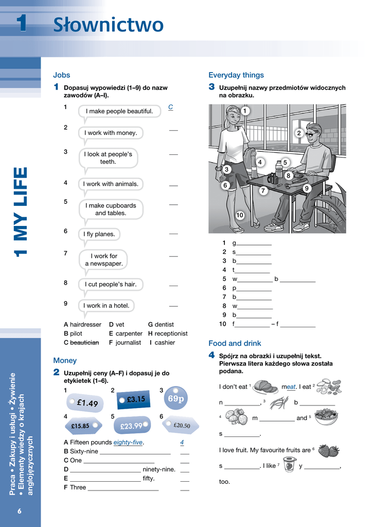 1 Słownictwo Jobs Everyday things 1 3 Dopasuj wypowiedzi (1–9) do nazw zawodów (A–I). 1 C I make people beautiful. 2 1 I work with money. 3 2 I look at people’s teeth. 1 MY LIFE 4 I work with animals. 5 I make cupboards and tables. 6 2 5 8 6 9 7 10 I fly planes. 7 I work for a newspaper. 8 I cut people’s hair. 9 I work in a hotel. D vet G dentist E carpenter H receptionist F journalist I cashier Uzupełnij ceny (A–F) i dopasuj je do etykietek (1–6). 1 2 3 £3.15 £1.49 4 5 £15.85 1 2 3 4 5 6 7 8 9 10 b –f Spójrz na obrazki i uzupełnij tekst. Pierwsza litera każdego słowa została podana. meat. I eat 2 I don’t eat 1 69p 6 £23.99 g s b t w p b w b f Food and drink 4 Money Praca • Zakupy i usługi • Żywienie • Elementy wiedzy o krajach anglojęzycznych 4 3 A hairdresser B pilot C beautician 6 Uzupełnij nazwy przedmiotów widocznych na obrazku. 4 £20.50 A Fifteen pounds eighty-five. 4 B Sixty-nine C One D ninety-nine. E fifty. F Three ,3 n s m b and 5 . I love fruit. My favourite fruits are 6 s too. . I like 7 y , Rozdział 1 Gramatyka Present simple and present continuous 1 Uzupełnij tekst czasownikami z nawiasów w odpowiedniej formie. Whose…?, genitive ’s and s’, possessive adjectives, possessive pronouns 3 This is my mums / mum’s book. Those are my goggles / goggles’. Hey! That towel is my / mine. Where are Heather and Sally? These towels are their / theirs. 5 Where’s Fiona? This is her / she belt. 6 Who’s / Whose is this radio? 1 2 3 4 My mum is a teacher. She usually 1 (work) works at a school, but today she 2 (teach) a boy at his house. She 3 (give) him lessons twice a week. My dad is a pilot, but he 4 (not fly) a plane today. Today, he and Mum 5 2 (fly) to Washington to visit my aunt. Uzupełnij dialog wyrazami z ramki w odpowiedniej formie. Countable and uncountable nouns with some, any and no 4 he give • write • look • not do • help • talk • you do • you want Ben: Hi, Laura. How are you? a summer job. My uncle has got a restaurant. 2 me to ask him about work there for you? Laura: Great. Thanks. What about you? What 3 Ben: Uzupełnij zdania, używając There is, There isn’t, There are lub There aren’t. 1 There are some bananas. 2 any mushrooms. some olive oil. 3 any vinegar. 4 no cream. 5 any peas. 6 some strawberries. 7 no nuts. 8 Laura: Hi, Ben. I’m OK. I 1 ’m looking for Ben: Wybierz poprawne odpowiedzi. 5 Wybierz poprawne odpowiedzi. Czasem więcej niż jedna opcja jest poprawna. 1 every day? 2 Me? At the moment, I 4 my dad. He’s a journalist. Right now he 5 a story about the 3 Is there any / some / a beef? Are there no / some / any pears? There is no / some / any cake. school holidays and what students do in their free time. It’s great. He I take their photos. Laura: Great. 7 No, he 8 I haven’t got some / any / no yoghurt. 5 There is some / no / any lettuce. 6 There isn’t no / any / some cream. 7 We’ve got some / any / no olive oil. you money for that? Ben: 4 to people and 6 ! 8 I want a / some / any vinegar. 7 Miniegzamin Poziom podstawowy Słuchanie 2 How much does the girl pay for her shopping? Wybór wielokrotny 1 A W parach wykonajcie polecenie i odpowiedzcie na pytania a–b. C £40.30 Write down as many jobs as you can in two minutes. £13.40 £14.30 3 What do Jim and Katie decide to buy? A a Which three jobs would you like to do? b Which job would you never want to do? 2 B B C 4 Where are the speakers? Przeczytaj wskazówkę egzaminacyjną. Spójrz na pytania w ćwiczeniu 3 i spróbuj przewidzieć, jakie informacje usłyszysz. A B Wskazówka egzaminacyjna Zanim wysłuchasz nagrania, zapoznaj się z zadaniem i spróbuj przewidzieć, jakiego rodzaju informacje usłyszysz. Na przykład: C • jeśli zadanie polega na wybraniu jednego z kilku rysunków, nazwij po angielsku to, co na nich widzisz, • jeśli w odpowiedziach znajdują się liczby (daty, godziny), przeczytaj je sobie cicho, • jeśli pytanie dotyczy miejsca, w którym znajdują się mówiące osoby, zastanów się, jakie wyrażenia można tam usłyszeć. 5 The speaker is talking about A his school. B someone’s hobby. C going shopping. Zadanie egzaminacyjne 3 2 Usłyszysz dwukrotnie pięć tekstów. Na podstawie informacji zawartych w nagraniu wybierz właściwą odpowiedź. 1 Which job does the man do? A B Funkcje językowe Dobieranie reakcji do nagranych wypowiedzi Zadanie egzaminacyjne 4 3 Usłyszysz dwukrotnie cztery wypowiedzi. Do każdej z nich dobierz właściwą reakcję A–E. Jedna reakcja została podana dodatkowo. 1 C 8 2 3 4 A I’m sorry, we haven’t got any at the moment. B There are some peaches and some yoghurt, but no bread. C I'd like to work for a newspaper. D She’s an engineer. E This one’s £35, but that smaller one is only £15. Rozdział 1 Czytanie Środki językowe Dobieranie zdań do tekstów Dobieranie wyrazów z ramki do luk 5 Zadanie egzaminacyjne W parach odpowiedzcie na pytanie. Where would you like to do work experience? Why? 7 Zadanie egzaminacyjne 6 Przeczytaj informacje na temat trzech ofert praktyk zawodowych dla uczniów (A–C) oraz pytania ich dotyczące. Do każdego pytania dopasuj właściwą ofertę. Jedna oferta pasuje do dwóch pytań. Which work experience programme is best for 1 pupils with a passion for technology? 2 girls who want to be business leaders? 3 those who live in two specific parts of the UK? 4 someone who wants a chance to do something creative? WORK EXPERIENCE OFFERS A YourTV offers work experience in international news, sports news, and art and music programmes. If you have a passion for film and TV, this programme is for you! You support a team of journalists: do general office work, answer phone calls and emails, and help with projects. The experience can help you understand different roles in the media. At the end you get a chance to make your own short programme! Przeczytaj tekst. Spośród wyrazów podanych w ramce wybierz te, które poprawnie uzupełniają l