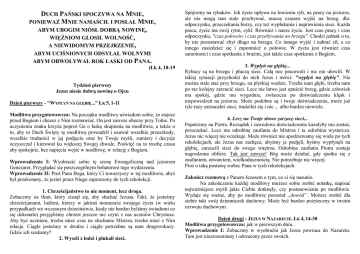 DUCH PAŃSKI SPOCZYWA NA MNIE, PONIEWAŻ MNIE NAMAŚCIŁ I POSŁAŁ MNIE, ABYM UBOGIM NIÓSŁ DOBRĄ NOWINĘ, WIĘŹNIOM GŁOSIŁ WOLNOŚĆ, A NIEWIDOMYM PRZEJRZENIE, ABYM UCIŚNIONYCH ODSYŁAŁ WOLNYMI ABYM OBWOŁYWAŁ ROK ŁASKI OD PANA. (Łk 4, 18-19 Tydzień pierwszy Jezus niesie dobrą nowinę o Ojcu Dzień pierwszy - "WYPŁYŃ NA GŁĘBIĘ..." ŁK 5, 1-11 Modlitwa przygotowawcza: Na początku modlitwy uświadom sobie, że stajesz przed Bogiem i chcesz z Nim rozmawiać. On jest zawsze obecny przy Tobie. Po uczynieniu znaku krzyża poproś Go o łaskę skupienia na modlitwie, a także o to, aby to Duch Święty tę modlitwę prowadził i usuwał wszelkie przeszkody, wszelkie trudności w jej podjęciu oraz by Twoje myśli, zamiary i decyzje oczyszczał i kierował ku większej Swojej chwale. Poświęć na to trochę czasu aby spokojnie, bez napięcia wejść w modlitwę, w relację z Bogiem. Wprowadzenie I: Wyobrazić sobie tę scenę Ewangeliczną nad jeziorem Genezaret. Przyglądać się poszczególnym bohaterom tego wydarzenia. Wprowadzenie II: Proś Pana Boga, który Ci towarzyszy w tej modlitwie, abyś był przekonany, że jesteś przez Niego zaproszony do tych rekolekcji. 1. Chrześcijaństwo to nie moment, lecz droga. Zobaczmy na tłum, który cisnął się, aby słuchać Jezusa. Fakt, że jesteśmy chrześcijanami, ludźmi, którzy w jakimś momencie swojego życia (w wielu przypadkach we wczesnym dzieciństwie, kiedy nie bardzo byliśmy świadomi co się dokonało) przyjęliśmy chrzest jeszcze nie czyni z nas uczniów Chrystusa. Aby być uczniem, trzeba mieć czas na słuchanie Mistrza, trzeba mieć z Nim relacje. Ciągle jesteśmy w drodze i ciągle potrzebne są nam drogowskazy. Gdzie ich szukamy? 2. Wyszli z łodzi i płukali sieci. Spójrzmy na rybaków. Ich życie upływa na łowieniu ryb, na pracy na jeziorze, ale nie mogą tam stale przebywać, muszą czasem wyjść na brzeg, dla: odpoczynku, przeczekania burzy, czy też wypłukania i naprawienia sieci. Każda praca, życie ma swój rytm, cykl. Również i nasze życie. Jest czas pracy i czas odpoczynku, "czas połowów i czas przebywania na brzegu". Chodzi jednak o to, by nie pozostawać zbyt długo na brzegu. Co innego wyjść i nabrać sił, a co innego zasiedzieć się i zapomnieć o połowie. W życiu jest również czas samotności i czas spotkania z braćmi, jest także czas spotkania z Bogiem. 3. Wypłyń na głębię... Rybacy są na brzegu i płuczą sieci. Całą noc pracowali i nic nie ułowili. W takiej sytuacji przychodzi do nich Jezus i mówi: "wypłyń na głębię". Nie można stale stać przy brzegu, na płytkiej wodzie. Trzeba nam głębi, trzeba nam po raz kolejny zarzucić sieci. Lecz nie łatwo jest opuścić brzeg, gdzie człowiek ma spokój, gdzie mu wygodnie, zwłaszcza po doświadczeniu klęsk i niepowodzeń na jeziorze. Może podobne są i twoje doświadczenia, może już tyle razy zarzucałeś sieci, trudziłeś się i nic ... albo bardzo niewiele. 4. Lecz na Twoje słowo zarzucę sieci... Popatrzmy na Piotra. Rozsądek i zawodowe doświadczenie kazałyby mu zostać, przeczekać. Lecz ma odrobinę zaufania do Mistrza i ta odrobina wystarcza. Jezus nic więcej nie oczekuje. Może również nie spodziewamy się wiele po tych rekolekcjach, ale Jezus nas zachęca, abyśmy je podjęli, byśmy wypłynęli na głębię, zarzucili sieci do swego wnętrza. Odrobina zaufania Piotra zostaje nagrodzona obficie. Tak jest zawsze! Bóg może działać, gdy spotka się z zaufaniem, otwarciem, wielkodusznością. Nie potrzebuje nic więcej. Proś o taką postawę wobec Pana w tych rekolekcjach. Zakończ rozmową z Panem Jezusem o tym, co ci się nasunie. Na zakończenie każdej modlitwy możesz sobie zrobić notatkę, napisać najważniejsze myśli jakie Ciebie dotknęły, czy postanowienia po modlitwie. Wydaje się ważne, aby po modlitwie pozostał „dowód”. Możesz zrobić dla siebie taki swój dzienniczek duchowy. Może być bardzo pożyteczny w twoim rozwoju duchowym. Dzień drugi - JEZUS W NAZARECIE. ŁK 4, 14-30 Modlitwa przygotowawcza: jak w pierwszym dniu. Wprowadzenie I: Zobaczmy w wyobraźni jak Jezus powraca do Nazaretu. Tam jest niezrozumiany i odrzucony przez swoich. Wprowadzenie II: Proś o poznanie największego daru Bożego dla nas jakim jest sam Jezus Chrystus. Bóg, który przychodzi jako Miłość jest odrzucony. Jezus jest odrzucony, nie zrozumiany, Jego słowa i postawa są przekręcane. Człowiek w historii nie rozumie Boga, bo zamyka się na Miłość, nie przyjmuje Miłości i Jej nie dowierza. Współczesny człowiek chce rozumieć Boga - a Boga należy przyjąć i pokochać. Nazarejczycy chcieli zrozumieć Jezusa. Bóg powraca, jest niestrudzonym głosicielem miłości. Jaki jest mój Bóg? Gdy patrzę na Jezusa - czy nie czynię podobnie jak Nazarejczycy: wyśmiewam, odrzucam, chcę strącić Go w przepaść. Święty Franciszek, powiedział kiedyś: miłość nie jest kochana. Współczesny człowiek chce Boga zrozumieć a nie pokochać. To błąd! Proś o łaskę otwarcia na Boga, o łaskę przyjęcia Jego i Jego Miłości. Dzień trzeci - MODLITWA CHRZEŚCIJANINA. ŁK 11, 2-4. 9-13 Modlitwa przygotowawcza: jak w pierwszym dniu. Wprowadzenie I: Zobaczyć Jezusa, który modli się na osobności i który naucza uczniów jak się modlić. Wprowadzenie II: Prosić o łaskę poznania i doświadczenia Boga, jako Ojca, którego objawia Jezus; Ojca, który troszczy się o potrzebującego człowieka, troszczy się o mnie; Ojca, który obdarowuje mnie dobrymi darami. 1. Jezus na modlitwie. "Gdy Jezus przebywał w jakimś miejscu na modlitwie..." W Ewangeliach widzimy, że Jezus wybierał miejsca na spotkanie ze swoim Ojcem, miejsca na modlitwę. Zobacz na swoje miejsca modlitwy. Zobaczmy jak Jezus dzieli swój czas. Można powiedzieć o trzech czasach Jezusa: czas dla Ojca – na modlitwie; czas dla misji – idzie pośród ludzi, by przekazać to, co otrzymał na modlitwie; czas dl