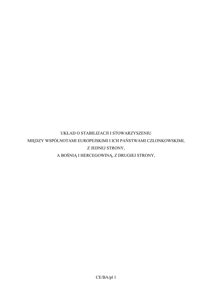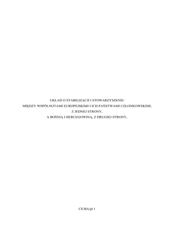 UKŁAD O STABILIZACJI I STOWARZYSZENIU MIĘDZY WSPÓLNOTAMI EUROPEJSKIMI I ICH PAŃSTWAMI CZŁONKOWSKIMI, Z JEDNEJ STRONY, A BOŚNIĄ I HERCEGOWINĄ, Z DRUGIEJ STRONY, CE/BA/pl 1 KRÓLESTWO BELGII, REPUBLIKA BUŁGARII, REPUBLIKA CZESKA, KRÓLESTWO DANII, REPUBLIKA FEDERALNA NIEMIEC, REPUBLIKA ESTOŃSKA, IRLANDIA, REPUBLIKA GRECKA, KRÓLESTWO HISZPANII, REPUBLIKA FRANCUSKA, REPUBLIKA WŁOSKA, REPUBLIKA CYPRYJSKA, REPUBLIKA ŁOTEWSKA, CE/BA/pl 3 REPUBLIKA LITEWSKA, WIELKIE KSIĘSTWO LUKSEMBURGA, REPUBLIKA WĘGIERSKA, MALTA, KRÓLESTWO NIDERLANDÓW, REPUBLIKA AUSTRII, RZECZPOSPOLITA POLSKA, REPUBLIKA PORTUGALSKA, RUMUNIA, REPUBLIKA SŁOWENII, REPUBLIKA SŁOWACKA, REPUBLIKA FINLANDII, KRÓLESTWO SZWECJI, ZJEDNOCZONE KRÓLESTWO WIELKIEJ BRYTANII I IRLANDII PÓŁNOCNEJ, CE/BA/pl 4 Umawiające się Strony Traktatu ustanawiającego Wspólnotę Europejską i Traktatu ustanawiającego Europejską Wspólnotę Energii Atomowej oraz Traktatu o Unii Europejskiej, zwane dalej „państwami członkowskimi” oraz WSPÓLNOTA EUROPEJSKA i EUROPEJSKA WSPÓLNOTA ENERGII ATOMOWEJ, zwane dalej „Wspólnotą”, z jednej strony, oraz BOŚNIA I HERCEGOWINA, z drugiej strony, zwane dalej "Stronami" UWZGLĘDNIAJĄC silne więzi między stronami i podzielane przez nie wartości, ich wolę wzmocnienia tych więzi i ustanowienia bliskich i długotrwałych stosunków opartych na zasadzie wzajemności i wspólnoty interesów, które powinny umożliwić Bośni i Hercegowinie dalsze zacieśnienie i zintensyfikowanie relacji ze Wspólnotą, CE/BA/pl 5 UWZGLĘDNIAJĄC znaczenie niniejszego układu, w ramach procesu stabilizacji i stowarzyszenia z państwami Europy Południowo-Wschodniej, w tworzeniu i konsolidowaniu stabilnego ładu europejskiego w oparciu o współpracę, której filarem jest Unia Europejska oraz w ramach paktu stabilizacji, UWZGLĘDNIAJĄC gotowość Unii Europejskiej do włączenia Bośni i Hercegowiny w jak największym stopniu do głównego politycznego i gospodarczego nurtu Europy oraz status tego kraju jako potencjalnego kandydata do członkostwa w UE na podstawie Traktatu o Unii Europejskiej (zwanego dalej "Traktatem UE") oraz po spełnieniu kryteriów określonych przez Radę Europejską w czerwcu 1993 r., jak również przesłanek określonych w ramach procesu stabilizacji i stowarzyszenia, przy czym koniecznym warunkiem jest tutaj pomyślne wdrożeniu niniejszego układu, zwłaszcza w zakresie współpracy regionalnej, UWZGLĘDNIAJĄC partnerstwo europejskie z Bośnią i Hercegowiną, określające priorytety działań służących wsparciu wysiłków Bośni i Hercegowiny na rzecz zbliżenia się do Unii Europejskiej, UWZGLĘDNIAJĄC zobowiązania Stron do przyczyniania się wszelkimi sposobami do stabilizacji politycznej, gospodarczej i instytucjonalnej Bośni i Hercegowiny oraz całego regionu, poprzez umacnianie społeczeństwa obywatelskiego i demokratyzację, rozwój instytucjonalny oraz reformę administracji publicznej, integrację handlu regionalnego oraz wzmożoną współpracę gospodarczą, jak również poprzez współpracę w wielu dziedzinach, w tym w obszarze wymiaru sprawiedliwości i spraw wewnętrznych, oraz wzmacniania bezpieczeństwa na szczeblu krajowym i regionalnym, CE/BA/pl 6 UWZGLĘDNIAJĄC zobowiązanie Stron do poszerzania swobód politycznych i gospodarczych jako głównej podstawy niniejszego układu, jak również ich zobowiązanie do przestrzegania praw człowieka i zasad państwa prawa, w tym praw osób należących do mniejszości narodowych oraz zasad demokracji, poprzez system wielopartyjny z wolnymi i uczciwymi wyborami, UWZGLĘDNIAJĄC zobowiązania Stron do pełnej realizacji wszystkich zasad i postanowień Karty NZ, OBWE, w szczególności Aktu końcowego Konferencji Bezpieczeństwa i Współpracy w Europie (zwanego dalej „Aktem końcowym z Helsinek”), dokumentów zawierających wnioski z Konferencji w Madrycie i Wiedniu, Karty paryskiej dla nowej Europy, jak również do przestrzegania zobowiązań wynikających z układu pokojowego z Dayton/Paryża oraz Paktu stabilizacji dla Europy Południowo-Wschodniej, w celu przyczyniania się do stabilizacji regionalnej i współpracy między państwami w tym regionie, UWZGLĘDNIAJĄC zobowiązania Stron do przestrzegania zasad gospodarki wolnorynkowej oraz gotowość Wspólnoty do wspierania reform gospodarczych w Bośni i Hercegowinie, jak również zobowiązanie Stron do przestrzegania zasad zrównoważonego rozwoju, UWZGLĘDNIAJĄC zobowiązania Stron do przestrzegania zasady wolnego handlu, w poszanowaniu praw i obowiązków wynikających z członkowstwa w WTO oraz do realizacji tych praw i obowiązków w sposób przejrzysty i niedyskryminujący, CE/BA/pl 7 UWZGLĘDNIAJĄC wolę Stron do dalszego umacniania regularnego dialogu politycznego w dziedzinie zagadnień o znaczeniu dwustronnym lub międzynarodowym będących przedmiotem ich wspólnego zainteresowania, w tym aspektów regionalnych, uwzględniając wspólną politykę zagraniczną i bezpieczeństwa (WPZiB) Unii Europejskiej, UWZGLĘDNIAJĄC zobowiązania Stron do zwalczania przestępczości zorganizowanej i zacieśnienia współpracy w walce z terroryzmem na podstawie deklaracji wydanej przez konferencję europejską w dniu 20 października 2001 r., W PRZEKONANIU, że układ o stabilizacji i stowarzyszeniu (zwany dalej „niniejszym układem”) stworzy nowy klimat dla stosunków gospodarczych między Stronami, a przede wszystkim dla rozwoju handlu i inwestycji, mających kluczowe znaczenie dla restrukturyzacji i modernizacji gospodarki Bośni i Hercegowiny, MAJĄC NA UWADZE zobowiązanie Bośni i Hercegowiny do zbliżenia swojego ustawodawstwa we właściwych sektorach do prawodawstwa Wspólnoty oraz do jego skutecznego wdrażania, UWZGLĘDNIAJĄC gotowość Wspólnoty do zapewniania zdecydowanego wsparcia przy wdrażaniu reform oraz do wykorzystania w tym celu wszystkich dostępnych kompleksowych, indykatywnych i wieloletnich instrumentów wspó