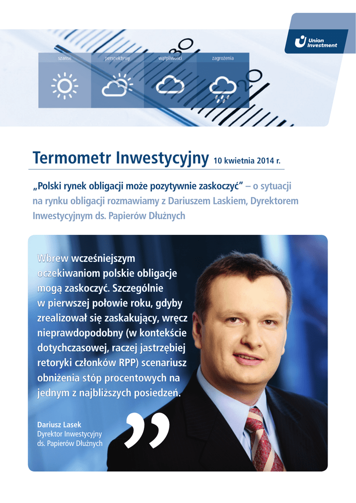Termometr Inwestycyjny 10 kwietnia 2014 r. „Polski rynek obligacji może pozytywnie zaskoczyć” – o sytuacji na rynku obligacji rozmawiamy z Dariuszem Laskiem, Dyrektorem Inwestycyjnym ds. Papierów Dłużnych Wbrew wcześniejszym oczekiwaniom polskie obligacje mogą zaskoczyć. Szczególnie w pierwszej połowie roku, gdyby zrealizował się zaskakujący, wręcz nieprawdopodobny (w kontekście dotychczasowej, raczej jastrzębiej retoryki członków RPP) scenariusz obniżenia stóp procentowych na jednym z najbliższych posiedzeń. Dariusz Lasek Dyrektor Inwestycyjny ds. Papierów Dłużnych Zgodnie z fazą cyklu koniunkturalnego obecny rok nie jest optymalny, jeżeli chodzi o inwestowanie w obligacje skarbowe. Dotychczasowa kondycja polskiego rynku długu zdaje się temu przeczyć? To prawda. Po zawirowaniach związanych ze zmianami w OFE w ostatnim czasie polski rynek obligacji zachowuje się dość spokojnie, wręcz pozytywnie. Rentowność 10-letnich obligacji skarbowych spadła z ok. 4,29% na początku kwietnia do poziomu ok. 4,1%. Otoczenie makroekonomiczne w dalszym ciągu nie sprzyja obligacjom, jednak z uwagi na wiele pomniejszych czynników zainteresowanie inwestorów polskimi papierami jest duże. Czy ten pozytywny trend ma szanse się utrzymać? Wbrew wcześniejszym oczekiwaniom – tak. Szczególnie w pierwszej połowie roku, gdyby zrealizował się zaskakujący, wręcz nieprawdopodobny (w kontekście dotychczasowej, raczej jastrzębiej retoryki członków RPP) scenariusz obniżenia stóp procentowych na jednym z najbliższych posiedzeń. Stałoby się to silnym sygnałem wspierającym, bo obecnie rynek nie wycenia takiego rozwoju wypadków. W tym kontekście rodzi się nawet pytanie, czy nie jest to jedna z ostatnich w tym roku okazji, by zarobić na obligacjach. W drugiej połowie roku, wraz ze zbliżaniem się do nieuchronnych podwyżek stóp procentowych w Polsce, sentyment może okazać się już bowiem nieco gorszy. A jeśli nie Polska, to…? Które jeszcze rynki warto brać pod uwagę? W regionie Nowej Europy całkiem dobrze prezentują się obligacje tureckie, węgierskie czy rumuńskie, choć trzeba pamiętać, że szczególnie w Turcji inwestowanie jest obarczone dużym ryzykiem, głównie politycznym. Jeśli jednak inwestor ma większą tolerancję na wahania cen papierów i nieco dłuższy horyzont inwestycyjny, może rozważyć dywersyfikację swojego portfela z uwzględnieniem tych rynków. Spoglądając na Stary Kontynent nieco szerzej, można zauważyć, że na ostatnim posiedzeniu Europejski Bank Centralny pozostawił stopy procentowe na niezmienionym poziomie. Czy ta zachowawczość może mieć jakieś implikacje dla gospodarki i rynków? Rzeczywiście, zarząd banku centralnego strefy euro po raz kolejny pozostał przy stwierdzeniu, iż „ma możliwości i nie zawaha się ich użyć”. Jednak – na co warto zwrócić uwagę – EBC zaczyna dostrzegać ryzyko, że w pewnym momencie zapowiedzi obniżek stóp mogą przestać działać na inwestorów. Szczególnie że stopa referencyjna w strefie euro wynosi obecnie 0,25% i pole manewru jest niewielkie. Skąd wniosek, że EBC może się zdecydować na jakiś poważniejszy ruch? EBC zasygnalizował, że rozważa możliwość wsparcia gospodarki europejskiej poprzez program luzowania ilościowego. Trudno powiedzieć, czy jest to realne już w najbliższej perspektywie, ponieważ prezes Mario Draghi mógł tylko sondować rynki. Z pewnością jednak osłabienie euro względem głównych walut okazałoby się korzystne. Obniżyłoby bowiem ryzyko deflacji i poprawiło konkurencyjność krajów eurolandu, co podtrzymałoby wciąż delikatne ożywienie gospodarcze. Dlaczego EBC zwleka z decyzją? Prawdą jest, że w obecnej sytuacji, gdy ożywienie w strefie euro nie jest jeszcze silne i trwałe, EBC powinien działać bardziej zdecydowanie i agresywniej. Jednak Europa, w przeciwieństwie do Japonii, nie ma doświadczeń z deflacją. Być może stąd ta zachowawcza polityka i wiara Maria Draghiego, że gospodarka wyjdzie na prostą o własnych siłach. Na to wszystko nakłada się przyjęty w Europie sposób prowadzenia polityki pieniężnej. Na czym on polega? Banki centralne w Europie działają asymetrycznie. Postępują bardzo stanowczo, gdy inflacja jest powyżej celu, jednak gdy znajduje się poniżej, ich ruchy nie są tak zdecydowane. Przykładowo jeśli cel inflacyjny NBP wynosi 2,5%, a inflacja przekroczy ten poziom – niezależnie od dopuszczalnego przedziału wahań, który wynosi +/-1 punkt procentowy – to RPP natychmiast podnosi stopy procentowe, by obniżać inflację. Z drugiej strony, gdy inflacja pozostaje poniżej celu, rada nie jest skora do tego, by obniżać stopy i starać się przywrócić poziom inflacji do zakładanego celu. Bank centralny np. Japonii ma zgoła inne podejście. Gdy inflacja zbliża się do zera, niezwłocznie wykorzystuje on wszelkie dostępne narzędzia, by podbić inflację i nie pozwolić gospodarce popaść w stagnację. Czy poza obniżką stóp i programem luzowania ilościowego EBC może zrobić coś jeszcze, by pomóc europejskiej gospodarce? EBC ma w zanadrzu narzędzia w postaci m.in. operacji LTRO, które polegają na udzielaniu bankom komercyjnym pod zastaw obligacji nisko oprocentowanych pożyczek w celu pobudzenia akcji kredytowej, a tym samym zwiększenia konsumpcji. Do tej pory raczej średnio się to udawało, bo pieniądze wracały na depozyt do EBC. Należy jednak pamiętać, że EBC zapowiada takie transakcje, a rynek się ich spodziewa. Masz pytania? ☎ 800 567 662 (22) 449 03 33 (od poniedziałku do piątku, od 8.00 do 18.00) [email protected] @ www.doradcy.unionklub.pl