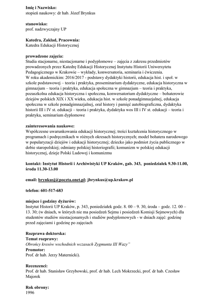 Imię i Nazwisko: stopień naukowy: dr hab. Józef Brynkus stanowisko: prof. nadzwyczajny UP Katedra, Zakład, Pracownia: Katedra Edukacji Historycznej prowadzone zajęcia: Studia stacjonarne, niestacjonarne i podyplomowe – zajęcia z zakresu przedmiotów prowadzonych przez Katedrę Edukacji Historycznej Instytutu Historii Uniwersytetu Pedagogicznego w Krakowie – wykłady, konwersatoria, seminaria i ćwiczenia. W roku akademickim: 2016/2017 - podstawy dydaktyki historii, edukacja hist. i społ. w szkole podstawowej – teoria i praktyka, proseminarium dydaktyczne, edukacja historyczna w gimnazjum – teoria i praktyka, edukacja społeczna w gimnazjum – teoria i praktyka, pozaszkolna edukacja historyczna i społeczna, konwersatorium dydaktyczne – bohaterowie dziejów polskich XIX i XX wieku, edukacja hist. w szkole ponadgimnazjalnej, edukacja społeczna w szkole ponadgimnazjalnej, oral history i pamięć autobiograficzna, dydaktyka historii III i IV st. edukacji – teoria i praktyka, dydaktyka wos III i IV st. edukacji – teoria i praktyka, seminarium dyplomowe zainteresowania naukowe: Współczesne uwarunkowania edukacji historycznej; treści kształcenia historycznego w programach i podręcznikach w różnych okresach historycznych; model bohatera narodowego w popularyzacji dziejów i edukacji historycznej; dziecko jako podmiot życia publicznego w dobie staropolskiej; odmiany polskiej historiografii; komunizm w polskiej edukacji historycznej, dzieje Polski Ludowej i komunizmu kontakt: Instytut Historii i Archiwistyki UP Kraków, gab. 343, poniedziałek 9.30-11.00, środa 11.30-13.00 email: [email protected]; [email protected] telefon: 601-517-683 miejsce i godziny dyżurów: Instytut Historii UP Kraków, p. 343, poniedziałek godz. 8. 00 – 9. 30, środa – godz. 12. 00 – 13. 30; (w dniach, w których nie ma posiedzeń Sejmu i posiedzeń Komisji Sejmowych) dla studentów studiów niestacjonarnych i studiów podyplomowych - w dniach zajęć: godzinę przed zajęciami i godzinę po zajęciach Rozprawa doktorska: Temat rozprawy: Obrońcy kresów wschodnich wczasach Zygmunta III Wazy” Promotor: Prof. dr hab. Jerzy Maternicki). Recenzenci: Prof. dr hab. Stanisław Grzybowski, prof. dr hab. Lech Mokrzecki, prof. dr hab. Czesław Majorek Rok obrony: 1996 Rozprawa habilitacyjna: Temat rozprawy: habilitacja otrzymana za całokształt dorobku, jako główne osiągnięcie przedstawiona została rozprawa: Komunistyczna ideologizacja a szkolna edukacja historyczna w Polsce (1944 - 1989), wyd. Antykwa, Kraków 2013, ss. 504. Recenzenci wydawniczy: Prof. dr hab. Barbara Jakubowska-Wagner, Prof. dr hab. Hanna Wójcik-Łagan Recenzenci do kolokwium habilitacyjnego: Prof. dr hab. Barbara Jakubowska-Wagner, Prof. dr hab. Jacek Chrobaczyński, dr hab. prof. UWr Grażyna Pańko Rok obrony: 2014 granty i prace badawcze: 2014/2015 - współkoordynator grantu – wraz z dr Agnieszką Chłosta-Sikorską: „Żołnierze Niezłomni” Ziemi Olkuskiej – historia i pamięć, realizowanego w ramach projektu MEN: „Uniwersytet Młodych Wynalazców” 1997 - Grant w programie „Partnerzy w kształceniu nauczycieli edukacji obywatelskiej” – przyznany przez Centrum Edukacji Obywatelskiej w Warszawie członkostwo w stowarzyszeniach i instytucjach naukowych: - Polskie Towarzystwo Historyczne - Polsko-Czeskie Towarzystwo Naukowe - Wspólna Polsko-Czeska Komisji ds. Podręczników współpraca międzynarodowa oraz międzyinstytucjonalna: - od 2015 członek Polsko-Czeskiego Towarzystwa Naukowego, w ramach którego jestem członkiem Wspólnej Polsko-Czeskiej Komisji ds. Podręczników zajmującej się analizą i oceną wizji polskiej historii w szkolnym kursie w edukacji historycznej w Czechach - od 2014 w ramach Ogólnopolskiego Seminarium Historyczno-Dydaktycznego, na którym przedstawicie uczelni wyższych z Polski przedstawiają i omawiają podejmowane przez doktorantów prace doktorskie - od 1998 roku współpraca ze Stałą Wspólną Polsko-Czeską Komisją Nauk Humanistycznych w związku z realizacją problematyki wzajemnych historycznych polsko - czeskich relacji w polskich i czeskich podręcznikach historii udział w konferencjach naukowych krajowych i zagranicznych: Wykaz referatów wygłoszonych na konferencjach 1. 2. Józef Brynkus, Miejsca pamięci narodowej, konferencja podsumowująca projekt „Pamięć śladów, śladami pamięci – miejsca pamięci narodowej na ziemi olkuskiej”, organizowana przez Powiatową i Miejską Bibliotekę Publiczną w Olkuszu, 2015. 11. 27Józef Brynkus, Homo sovieticus – człowiek zniewolony, Ogólnopolska konferencja: Pułkownik Kukliński zwycięska misja, Wiązowna k/Otwocka, 2015.11. 07 Józef Brynkus, Komunistyczna ideologizacja początków państwa polskiego w propagandzie i edukacji historycznej, ogólnopolska konferencja naukowa: Spór o początki państwa polskiego. Historiografia. 3. 4. 5. 6. 7. 8. 9. 10. 11. 12. 13. 14. 15. 16. 17. 18. 19. Tradycja. Mit. Propaganda, ogólnopolska konferencja organizowana Przez IH UJ i TNDWH UJ, Kraków, 2015. 04. 16-17. Józef Brynkus, Model dydaktycznej analizy podręczników szkolnych – koncepcja, kryteria, narzędzia badawcze, międzynarodowa konferencja naukowa: Pogranicze polsko-czeskie – 70 lat doświadczeń (1945-2015, Polanica - Zdrój, 2015. 03. 26-27 Józef Brynkus: Indywidualne i zbiorowe perspektywy (aspekty) pamięci o Polsce Ludowej zawarte w pomnikach i ich miejsce we współczesnej przestrzeni publicznej, konferencja: Pamięć miejsca. Miejsce Pamięci, międzynarodowa konferencja, organizowana przez Instytut Historii UP Kraków, 2014. 12. 1112. Józef Brynkus, Gimnazjum w Wadowicach od reformy Janusza Jędrzejewicza do 1939 r., sesja naukowa organizowana przez Stowarzyszenie Absolwentów Liceum Ogólnokształcącego w Wadowicach, Wadowice, 2014. 10. 24, Józef Brynkus, Funkcje rodzinne kobiety i mężczyzny w programie ideowym polskich komunistów w latach 80. XX wieku, międzynarodowa ko