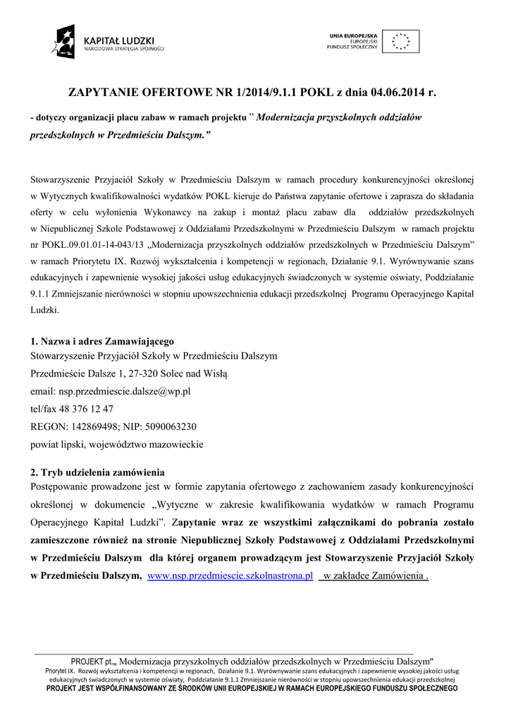 ZAPYTANIE OFERTOWE NR 1/2014/9.1.1 POKL z dnia 04.06.2014 r. - dotyczy organizacji placu zabaw w ramach projektu ” Modernizacja przyszkolnych oddziałów przedszkolnych w Przedmieściu Dalszym.” Stowarzyszenie Przyjaciół Szkoły w Przedmieściu Dalszym w ramach procedury konkurencyjności określonej w Wytycznych kwalifikowalności wydatków POKL kieruje do Państwa zapytanie ofertowe i zaprasza do składania oferty w celu wyłonienia Wykonawcy na zakup i montaż placu zabaw dla oddziałów przedszkolnych w Niepublicznej Szkole Podstawowej z Oddziałami Przedszkolnymi w Przedmieściu Dalszym w ramach projektu nr POKL.09.01.01-14-043/13 „Modernizacja przyszkolnych oddziałów przedszkolnych w Przedmieściu Dalszym” w ramach Priorytetu IX. Rozwój wykształcenia i kompetencji w regionach, Działanie 9.1. Wyrównywanie szans edukacyjnych i zapewnienie wysokiej jakości usług edukacyjnych świadczonych w systemie oświaty, Poddziałanie 9.1.1 Zmniejszanie nierówności w stopniu upowszechnienia edukacji przedszkolnej Programu Operacyjnego Kapitał Ludzki. 1. Nazwa i adres Zamawiającego Stowarzyszenie Przyjaciół Szkoły w Przedmieściu Dalszym Przedmieście Dalsze 1, 27-320 Solec nad Wisłą email: [email protected] tel/fax 48 376 12 47 REGON: 142869498; NIP: 5090063230 powiat lipski, województwo mazowieckie 2. Tryb udzielenia zamówienia Postępowanie prowadzone jest w formie zapytania ofertowego z zachowaniem zasady konkurencyjności określonej w dokumencie „Wytyczne w zakresie kwalifikowania wydatków w ramach Programu Operacyjnego Kapitał Ludzki”. Zapytanie wraz ze wszystkimi załącznikami do pobrania zostało zamieszczone również na stronie Niepublicznej Szkoły Podstawowej z Oddziałami Przedszkolnymi w Przedmieściu Dalszym dla której organem prowadzącym jest Stowarzyszenie Przyjaciół Szkoły w Przedmieściu Dalszym, www.nsp.przedmiescie.szkolnastrona.pl w zakładce Zamówienia . PROJEKT pt.„ Modernizacja przyszkolnych oddziałów przedszkolnych w Przedmieściu Dalszym” Priorytet IX. Rozwój wykształcenia i kompetencji w regionach, Działanie 9.1. Wyrównywanie szans edukacyjnych i zapewnienie wysokiej jakości usług edukacyjnych świadczonych w systemie oświaty, Poddziałanie 9.1.1 Zmniejszanie nierówności w stopniu upowszechnienia edukacji przedszkolnej PROJEKT JEST WSPÓŁFINANSOWANY ZE ŚRODKÓW UNII EUROPEJSKIEJ W RAMACH EUROPEJSKIEGO FUNDUSZU SPOŁECZNEGO 2.1 Tryb zamówienia: w związku z zasadą konkurencyjności – zapytanie ofertowe 3. Opis przedmiotu zapytania ofertowego Przedmiotem zapytania ofertowego jest zakup wyposażenia i montaż placu zabaw dla oddziałów przedszkolnych przy Niepublicznej Szkole Podstawowej z Oddziałami Przedszkolnymi w Przedmieściu Dalszym w ramach projektu pt. „Modernizacja przyszkolnych oddziałów przedszkolnych w Przedmieściu Dalszym”, projekt nr POKL.09.01.0114-043/13 w ramach Priorytetu IX. Rozwój wykształcenia i kompetencji w regionach, Działanie 9.1. Wyrównywanie szans edukacyjnych i zapewnienie wysokiej jakości usług edukacyjnych świadczonych w systemie oświaty, Poddziałanie 9.1.1 Zmniejszanie nierówności w stopniu upowszechnienia edukacji przedszkolnej Programu Operacyjnego Kapitał Ludzki. 3.1.Szczegółowy opis przedmiotu zamówienia uwzględniający rodzaj i ilość asortymentu stanowiącego przedmiot zapytania ofertowego zawarto w załącznikach do niniejszego zapytania. 3.2.Wszystkie materiały powinny być fabrycznie nowe, tzn. że żadna część składająca się na dany materiał nie może być wcześniej używana oraz winna posiadać niezbędne certyfikaty bezpieczeństwa. Towary składane lub o bardziej skomplikowanej budowie powinny posiadać instrukcje użytkowania w języku polskim oraz ostrzeżenie o zagrożeniach. Dostawa wraz z montażem będzie obejmować fabrycznie nowe artykuły, które zostały szczegółowo opisane w załącznikach do niniejszego zapytania ofertowego. Zamawiający dopuszcza w przypadku braku określonego asortymentu przedstawienie w ofercie zbliżonego pod względem zastosowania i wykonania. 3.3. Zamawiający wymaga od wykonawcy dostarczenia własnym transportem zakupionych towarów łącznie z rozładowaniem, rozpakowaniem, montażem na koszt własny i ryzyko, w godzinach i dniach pracy wskazanych przez Zamawiającego. 3.4. Wykonawcy są zobowiązani do dostarczenia urządzeń i sprzętu zgodnych, pod względem jakości, estetyki, funkcjonalności i bezpieczeństwa z opisem zawartym w załącznikach do niniejszego zapytania 4.Termin realizacji zamówienia Wymagany termin wykonania zamówienia – do 31 lipca 2014 r. 5.Miejsce i termin złożenia oferty Oferty należy składać w sekretariacie Niepublicznej Szkoły Podstawowej z Oddziałami Przedszkolnymi w Przedmieściu Dalszym, Przedmieście Dalsze 1, 27 – 320 Solec nad Wisłą PROJEKT pt.„ Modernizacja przyszkolnych oddziałów przedszkolnych w Przedmieściu Dalszym” Priorytet IX. Rozwój wykształcenia i kompetencji w regionach, Działanie 9.1. Wyrównywanie szans edukacyjnych i zapewnienie wysokiej jakości usług edukacyjnych świadczonych w systemie oświaty, Poddziałanie 9.1.1 Zmniejszanie nierówności w stopniu upowszechnienia edukacji przedszkolnej PROJEKT JEST WSPÓŁFINANSOWANY ZE ŚRODKÓW UNII EUROPEJSKIEJ W RAMACH EUROPEJSKIEGO FUNDUSZU SPOŁECZNEGO do dnia 16 czerwca 2014 roku, do godziny 12:00. 6.Warunki płatności Rozliczenie transakcji następować będzie przelewem na konto wskazane na fakturze i/ lub rachunku, w ciągu 30 dni od dnia otrzymania prawidłowo wystawionej faktury/ rachunku przez Wykonawcę. Podstawą do wystawienia faktury będzie protokół odbioru zamówienia, podpisany przez Zamawiającego 7.Sposób przygotowania oferty 7.1. Oferta powinna być sporządzona na formularzu oferty stanowiącym załącznik nr 2 do niniejszego zapytania w formie pisemnej, w języku polskim, poprawki winny być naniesione czytelnie oraz opatrzone podpisem osoby uprawnionej