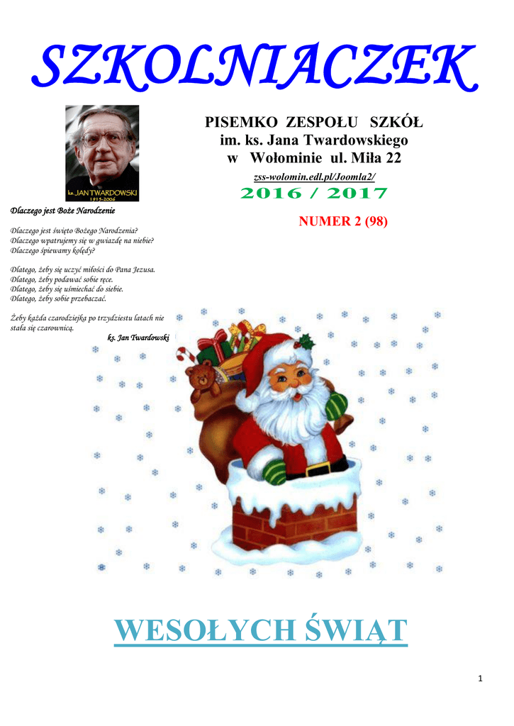 SZKOLNIACZEK PISEMKO ZESPOŁU SZKÓŁ im. ks. Jana Twardowskiego w Wołominie ul. Miła 22 zss-wolomin.edl.pl/Joomla2/ 2016 / 2017 Dlaczego jest Boże Narodzenie Dlaczego jest święto Bożego Narodzenia? Dlaczego wpatrujemy się w gwiazdę na niebie? Dlaczego śpiewamy kolędy? NUMER 2 (98) Dlatego, żeby się uczyć miłości do Pana Jezusa. Dlatego, żeby podawać sobie ręce. Dlatego, żeby się uśmiechać do siebie. Dlatego, żeby sobie przebaczać. Żeby każda czarodziejka po trzydziestu latach nie stała się czarownicą. ks. Jan Twardowski WESOŁYCH ŚWIĄT 1 "Wiersz staroświecki" Pomódlmy się w Noc Betlejemską, W Noc Szczęśliwego Rozwiązania, By wszystko się nam rozplątało, Węzły, konflikty, powikłania. Oby się wszystkie trudne sprawy Porozkręcały jak supełki, Własne ambicje i urazy Zaczęły śmieszyć jak kukiełki. Oby w nas paskudne jędze Pozamieniały się w owieczki, A w oczach mądre łzy stanęły Jak na choince barwnej świeczki. Niech anioł podrze każdy dramat Aż do rozdziału ostatniego, I niech nastraszy każdy smutek, Tak jak goryla niemądrego. Aby wątpiący się rozpłakał Na cud czekając w swej kolejce, A Matka Boska - cichych, ufnych Na zawsze wzięła w swoje ręce. Ks. Jan Twardowski Nastrojowych i magicznych Świąt Bożego Narodzenia, wewnętrznego spokoju, wytrwałości, wszechobecnej życzliwości i radości oraz błogosławieństwa Bożego w każdym dniu nadchodzącego 2017 roku życzy Redakcja 2 ODKRYWAMY TALENTY Nadszedł grudzień, a wraz z nim oczekiwanie na wyjątkowe Święta - Boże Narodzenie. Większość z nas nie może się już doczekać tych magicznych dni. Tym razem zapytaliśmy Was, co najbardziej lubicie w Świętach Bożego Narodzenia. Poniżej prezentujemy kilka Waszych wypowiedzi. Podczas Świąt Bożego Narodzenia najbardziej lubię, kiedy spotykamy się całą rodziną przy stole i moment, kiedy rozpakowuję prezenty. Bardzo lubię także dzień przed Wigilią, ponieważ wtedy przepisuję z Internetu życzenia bożonarodzeniowe od zespołów muzycznych, takich jak Weekend, Akcent i Mig :). Słonko Podczas Świąt Bożego Narodzenia najbardziej lubię ubierać choinkę, przygotowywać podarki gwiazdkowe i potrawy na wieczerzę wigilijną. Kiedy wszystko jest gotowe i pierwsza gwiazdka ukazuje się na niebie, po przełamaniu się opłatkiem i złożeniu wzajemnych życzeń całą rodziną zasiadam do wigilijnego stołu. Po zjedzeniu kilku potraw rozpakowuję prezenty. Jest to chwila, którą lubię najbardziej. W moim domu w Święta Bożego Narodzenia staropolskim zwyczajem śpiewa się kolędy. Mateusz Mrozowski Podczas Świąt Bożego Narodzenia najbardziej lubię wieczór wigilijny, ubieranie choinki oraz dzielenie się opłatkiem. W tym czasie można spotkać się z bliskimi, usiąść razem przy stole, posłuchać kolęd, dookoła pachnie choinka i wigilijne potrawy. Klaudia Gajcy W czasie Świąt Bożego Narodzenia bardzo lubię dostawać prezenty. Lubię również dzielić się z bliskimi opłatkiem, składać życzenia i odwiedzać moją babcię, u której spotykamy się z całą rodziną. Wieczorem zawsze pod dom przychodzą kolędnicy i śpiewają kolędy, a my wręczamy im za to pieniądze. Lubię również drugi dzień Świąt, ponieważ obchodzę wtedy urodziny. Paulina Chudzik W Święta Bożego Narodzenia najbardziej lubię spędzać miło czas z rodziną, szczególnie z wujostwem. Mariusz Pawełas 3 Podczas Świąt Bożego Narodzenia najbardziej lubię ubierać choinkę i pomagać przy szykowaniu stołu. Filip Maciejewski Podczas Świąt Bożego Narodzenia najbardziej lubię dostawać prezenty i spędzać czas z rodziną. Gwiazdka Podczas Bożego Narodzenia najbardziej lubię dostawać prezenty, jeść wigilijne potrawy i dzielić się opłatkiem z całą rodziną. Piesek W Święta Bożego Narodzenia najbardziej lubię świąteczne potrawy i prezenty. Adrian Dawidczyk W Świętą Bożego Narodzenia najbardziej lubię spotkania z rodziną, prezenty pod choinką i pasterkę. Żabka Podczas Świąt Bożego Narodzenia lubię dostawać prezenty, spotykać się z rodziną, jeść dobre jedzenie i śpiewać kolędy. Majdan Świętą Bożego Narodzenia najbardziej lubię spędzać z rodziną, śpiewać kolędy i dostawać dużo prezentów. Chętnie ubieram przed Świętami choinkę, natomiast nie lubię w Wigilię chodzić na pasterkę, ponieważ zawsze chce mi się spać. Dawid Więckiewicz W Święta Bożego Narodzenia najbardziej lubię wigilię, jasełka i prezenty. Weronika Kanclerz Podczas Świąt Bożego Narodzenia najbardziej lubię spotykać się z rodziną, z braćmi, a szczególnie z siostrą. Myszka 4 OKIEM REPORTERA 12 października środa Dzień Edukacji Narodowej w Zespole Szkół im. ks. Jana Twardowskiego w Wołominie obchodzono razem z Dniem Patrona. Od pięciu lat ks. Jan Twardowski jest opiekunem naszej placówki. Tematyka całej uroczystości łączyła jego osobę z obchodami związanymi z Dniem Edukacji Narodowej. Nasze spotkanie zaczęło się od Mszy świętej, po której uczniowie, nauczyciele, rodzice oraz zaproszeni goście udali się do szkoły, gdzie nastąpiły dalsze obchody. Pani Dyrektor Hanna Szyszkowska serdecznie powitała wszystkich zgromadzonych na sali gimnastycznej. Miłe słowa i życzenia złożyli na ręce Pani Dyrektor: Pan Wicestarosta Adam Łossan, ks. prałat Sylwester Sienkiewicz, Pani Jolanta Sawicka – Jurek – Prezes oddziału NSZZ „Solidarność”, Pani Katarzyna Kadzidłowska – Prezes powiatowego oddziału ZNP Wołomin, Pan Marcin Maćkowiak – Dyrektor OREW Wołomin. Wśród gości byli również p. Arkadiusz Rychta (Fundacja ARKA), p. Agata Rzędzian (PCPR Wołomin), Radny Powiatu Wołomińskiego p. Robert Szydlik, a także nauczyciele - emeryci. W dalszej części uroczystości nauczyciele wraz z uczniami w programie artystycznym przedstawili biografię i twórczość Patrona naszej szkoły- ks. Jana Twardowskiego, zaś Pierwszoklasiśc