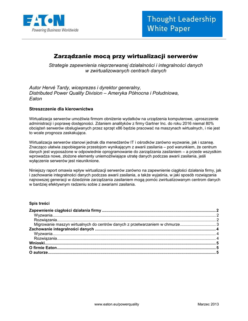 Zarządzanie mocą przy wirtualizacji serwerów Strategie zapewnienia nieprzerwanej działalności i integralności danych w zwirtualizowanych centrach danych Autor Hervé Tardy, wiceprezes i dyrektor generalny, Distributed Power Quality Division – Ameryka Północna i Południowa, Eaton Streszczenie dla kierownictwa Wirtualizacja serwerów umożliwia firmom obniżenie wydatków na urządzenia komputerowe, uproszczenie administracji i poprawę dostępności. Zdaniem analityków z firmy Gartner Inc. do roku 2016 niemal 80% obciążeń serwerów obsługiwanych przez sprzęt x86 będzie pracować na maszynach wirtualnych, i nie jest to wcale prognoza zaskakująca. Wirtualizacja serwerów stanowi jednak dla menedżerów IT i ośrodków zarówno wyzwanie, jak i szansę. Znacząco ułatwia zapobieganie przestojom wynikającym z awarii zasilania ‒ pod warunkiem, że centrum danych jest wyposażone w odpowiednie oprogramowanie do zarządzania zasilaniem ‒ a przede wszystkim wprowadza nowe, złożone elementy uniemożliwiające utratę danych podczas awarii zasilania, jeśli wyłączenie serwerów jest nieuniknione. Niniejszy raport omawia wpływ wirtualizacji serwerów zarówno na zapewnienie ciągłości działania firmy, jak i zachowanie integralności danych podczas awarii zasilania, a także wyjaśnia, w jaki sposób rozwiązania najnowszej generacji w dziedzinie zarządzania zasilaniem mogą pomóc zwirtualizowanym centrom danych w bardziej efektywnym radzeniu sobie z awariami zasilania. Spis treści Zapewnienie ciągłości działania firmy ...................................................................................................... 2 Wyzwania.................................................................................................................................................. 2 Rozwiązania.............................................................................................................................................. 2 Migrowanie maszyn wirtualnych do centrów danych z przetwarzaniem w chmurze ................................ 3 Zachowanie integralności danych ............................................................................................................ 4 Wyzwania.................................................................................................................................................. 4 Rozwiązania.............................................................................................................................................. 4 Wnioski......................................................................................................................................................... 5 O firmie Eaton .............................................................................................................................................. 5 O autorze ...................................................................................................................................................... 5 www.eaton.eu/powerquality Marzec 2013 Page 2 of 6 Zapewnienie ciągłości działania firmy Przestoje są niezwykle kosztowne, dlatego też wszechstronne środowisko zabezpieczenia zasilania musi być zaprojektowane tak, aby zapewniało stały dostęp do wszystkich podstawowych aplikacji. Zasadniczo wirtualizacja znacząco ułatwia zapewnienie ciągłości działania firmy w przypadku awarii sieci elektrycznej, umożliwiając centrom danych przeniesienie maszyn wirtualnych na niezależne serwery hosta, znajdujące się w innym miejscu w sieci. W rzeczywistości zarządzanie tym procesem jest jednak o wiele trudniejsze, niż się to wydaje. Wyzwania VMware, Microsoft, Citrix oraz inni dostawcy oprogramowania do wirtualizacji serwerów oferują produkty do „migracji na żywo”, dzięki którym można szybko przenosić maszyny wirtualne z jednego serwera hosta na drugi w celu zrównoważenia obciążeń lub jeśli oryginalny serwer doświadcza problemów czy też wymaga prac konserwacyjnych. Żadnego z tych systemów nie wyposażono jednak we wbudowaną funkcję, umożliwiającą reagowanie na przerwy w zasilaniu. Ponadto większość systemów zabezpieczenia mocy dla środowisk zwirtualizowanych serwerów jest dostarczana wraz z własną konsolą poleceń. Wskutek tego technicy muszą używać jednego narzędzia do zarządzania wirtualizacją, a innego do zarządzania zasilaniem. Pogarsza to ich wydajność i może powodować wydłużenie czasu reakcji w razie awarii zasilania. Rozwiązania Instalacja nowoczesnego oprogramowania do zarządzania zasilaniem w dużym stopniu upraszcza kwestie związane z zapewnieniem, by aplikacje o znaczeniu krytycznym były cały czas dostępne w razie awarii zasilania. Przede wszystkim niektóre z takich rozwiązań integrują się ściśle z czołowymi produktami do zarządzania wirtualizacją, takimi jak VMware vCentre Server, Microsoft SCVMM oraz Citrix XenCentre. Umożliwia to technikom przeglądanie, monitorowanie i zarządzanie nie tylko serwerami fizycznymi i wirtualnymi, lecz także systemami zasilaczy bezprzerwowych (UPS) oraz innymi urządzeniami zasilającymi z użyciem jednej konsoli. Rys. 1. Dostępne obecnie dodatki z niektórymi rozwiązaniami do zarządzania zasilaniem integrują się ściśle z czołowymi systemami do zarządzania wirtualizacją, umożliwiając technikom przeglądanie, www.eaton.eu/powerquality Marzec 2013 Page 3 of 6 monitorowanie i administrowanie wszystkimi zasobami serwerowymi, pamięci i zarządzania zasilaniem z użyciem jednej konsoli Najnowsze rozwiązania w dziedzinie zarządzania zasilaniem mogą także automatycznie i w sposób niewidoczny przenosić maszyny wirtualne z serwerów hosta dotkniętych awarią zasilania na niezależne serwery w dowolnym miejscu klastra serwerów. Rys. 2. Zaawansowane rozwiązania w dziedzinie zarządzania zasilaniem pozwalają zachować ciągłość działania firmy podczas awarii zasilania pop
