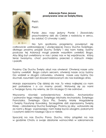 Adoracja Pana Jezusa przeżywana wraz ze Świętą Klarą Pieśń: Pieśń: Panie Jezu nasz jedyny Panie i Zbawicielu przychodzimy dziś do Ciebie z radością w sercu, by oddać Ci chwałę i cześć. Na tym spotkaniu pragniemy powierzyć się całkowicie uzdrawiającej i uświęcającej mocy Ducha Świętego, dlatego prosimy przyjdź Duchu Święty i daj nam łaskę, byśmy podczas tej Adoracji mogli przede wszystkim uwielbić Boga. Aby Bóg był uwielbiony w nas i przez nas w tej wspólnocie, którą teraz tworzymy, choć pochodzimy przecież z różnych miejsc i parafii. Prosimy Cię Duchu Święty abyś nas otwierał. Otwieraj nasze usta byśmy uwielbili Boga całym sercem, otwieraj nasze oczy byśmy Go widzieli w drugim człowieku, otwieraj nasze uszy byśmy Go słuchali, rozumieli i żyli słowem kierowanym do nas każdego dnia. Maryjo zapraszamy Cię dzisiaj do nas ,Ty wiesz najlepiej co nam jest potrzebne i o co mamy prosić. Wstawiaj się za nami u Twojego Syna, my wiemy, że On niczego Ci nie odmówi . Wzywamy również wstawiennictwa Aniołów, Archaniołów i patronów tego miejsca: Świętego Michała Archanioła, Świętego Franciszka, Świętego Ojca Pio, Świętą Marię Magdalenę i Świętą Faustynę Kowalską. Szczególnie dziś zapraszamy Świętą Klarę – oblubienicę Ducha Świętego. Prośmy ją aby wstawiała się za nami u Boga wypraszając nam łaskę bycia ubogimi, pokornymi i czystymi dziećmi naszego Ojca w niebie. Spocznij na nas Duchu Pana. Duchu, który zstąpiłeś na nas w godzinie Chrztu a swoje działanie wzmocniłeś w sakramencie 1 Bierzmowania – dotknij oczyszczaj i wzmacniaj. nas Swoją mocą, rozpal miłością, Pieśń: Spocznij na nas Duchu Pana Klara urodziła się w 1193 roku w Asyżu. Pochodziła z bogatej rodziny. Jej matka podczas ciąży usłyszała słowa: „Nie bój się, gdyż to dziecko zabłyśnie swym życiem jaśniej niż słońce.” Pod wpływem tych słów nadała dziewczynie imię Klara, co znaczy jasna, czysta. Klara wzrastała w atmosferze miłości i pobożności, a będąc sąsiadką Świętego Franciszka zauroczyła się jego stylem życia i od wczesnych lat gnębiła i umartwiała swoje ciało. Kiedy rodzice postanowili wydać ją za mąż za radą Franciszka, Klara uciekła z domu do Tego, którego prawdziwie kochała - Jezusa Chrystusa. W umówionym kościele czekał na nią Franciszek ze swoimi braćmi. Dziewczyna w ich towarzystwie ślubowała być na zawsze posłuszną, uboga i pełną dziecięctwa Bożego. Nie spodobało się to wszystko jej rodzinie, ale Klara mocno uchwyciła się ołtarza, ogoliła sobie nawet głowę, by tym samym nie mogła już spodobać się niedoszłemu mężowi. Jezus powiedział: ”Kto kocha ojca lub matkę bardziej niż mnie nie jest mnie godzien . I kto kocha syna lub córkę bardziej niż mnie nie jest mnie godzien.”( Mt. 10,37) Słowa te to wezwanie do gotowości poświęcenia dla Jezusa tego co dla nas najdroższe. Jest to zaproszenie do podporządkowania wszelkiej miłości ziemskiej miłości Boga, tak aby jego wola była dla nas zawsze najważniejsza. Jezus wiedział, że jeśli będziemy Go kochali i szanowali ponad wszystko staniemy się także zdolni prawdziwie kochać drugiego człowieka. Dopiero miłość Boga i Jego życie w nas może nas uzdolnić tak jak Świętą Klarę do miłości przekraczającej nasze ludzkie siły. Miała ona ogromne współczucie dla wszystkich nieszczęśliwych, była otwarta na potrzeby ubogich i cierpiących. Kreśliła na ich czołach znak krzyża, uzdrawiała, pocieszała, pomagała rodzinom i małżeństwom znaleźć drogę pojednania. Pieśń: 2 Jezus mówi dalej: „Kto nie bierze swego krzyża, a idzie za mną, nie jest mnie godzien. Kto chce znaleźć swoje życie, straci je, a kto straci soje życie z mego powodu znajdzie je.”(Mt 10,38-39) Klara dla Jezusa wyrzekła się wszystkiego: zostawiła dom, rodzinę, pieniądze, kandydata na męża. Rodzi się pytanie: Czy naprawdę Jezusowi chodzi o to by wyrzec się wszystkiego w sensie dosłownym jak Klara? Otóż nie ma nic złego w dostatnim życiu, ale trzeba pamiętać o tym, że przede wszystkim trzeba troszczyć się o życie wieczne i sprawy Królestwa Niebieskiego. Bo kto będzie zabiegał w swoim życiu wyłącznie o pieniądze, wygodę, majątek, sukces - na koniec straci wszystko. Pieśń: Ofiaruje Tobie Panie mój W wieku 18 lat Klara założyła zakon zwany zgromadzeniem Sióstr Klarysek. W 1215 roku papież Innocenty III nadał temu zakonowi „przywilej ubóstwa”. Siostry nie mogły posiadać żadnej własności i utrzymywały się wyłącznie z pracy rąk własnych. Do dziś zakon ten posiada najostrzejszą regułą: izolacja od świata, milczenie a przede wszystkim skrajne ubóstwo. Chrystus żył w najgłębszym ubóstwie „Ubogi został położony w żłobie, ubogi żył w świecie i nagi wisiał na krzyżu”. Jezus pragnie przyjść do ubogich i potrzebujących, aby w Nim stali się bogaci, biorąc w posiadanie Królestwo Boże. Nadmierne przywiązanie do bogactwa i spraw tego świata prowadzą do zaniedbywania tego co naprawdę liczy się w oczach Boga. Odciąga nasze myśli i wysiłki od służenia Bogu i czyni nas niewolnikami rzeczy stworzonych. Jakie sprawy liczą się w oczach Boga? Przede wszystkim to, byśmy razem poznali Jego miłość do każdego z nas osobiście. On stworzył nas z miłości i nie przestaje nas kochać. Otacza nas nieustanną troską, gdyż naprawdę Mu na nas zależy. Jezus 3 umarł i powstał z martwych, abyśmy mogli doświadczyć życia Bożego i mocą Ducha Świętego mieć w tym życiu udział. Ufni w jego miłość do nas możemy miłować Go i służyć Mu kochając i służąc innym jak Święta Klara. Prawdziwym bogactwem jest nasza modlitwa, wyznawanie Bogu miłości, każde czytane z wiarą słowo Pisma Świętego, uczestnictwo we Mszy Świętej. Wszystko to pomaga nam „nasiąknąć” sprawami, które tak naprawdę s