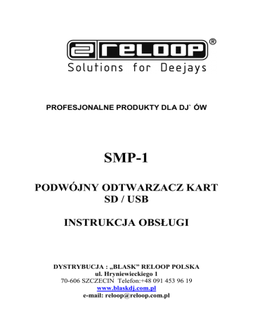 PROFESJONALNE PRODUKTY DLA DJ` ÓW SMP-1 PODWÓJNY ODTWARZACZ KART SD / USB INSTRUKCJA OBSŁUGI DYSTRYBUCJA : „BLASK” RELOOP POLSKA ul. Hryniewieckiego 1 70-606 SZCZECIN Telefon:+48 091 453 96 19 www.blaskdj.com.pl e-mail: [email protected] Gratulujemy zakupu odtwarzacza SMP-1 firmy Reloop. Dziękujemy za zaufanie okazane naszej technologii didŜejskiej. Zanim sprzęt zostanie uŜyty prosimy o dokładne zapoznanie się z instrukcją obsługi. Proszę wypakować sprzęt i sprawdzić czy nie został on uszkodzony podczas transportu. Jeśli zauwaŜysz jakiekolwiek usterki bądź widoczne uszkodzenia, nie uŜywaj sprzętu i skontaktuj się ze sprzedawcą. UWAGA! Proszę zachować szczególną ostroŜność podczas uŜywania sprzętu o napięciu 230V. Tak duŜe napięcie moŜe prowadzić do śmiertelnego poraŜenia prądem! Jakiekolwiek uszkodzenie sprzętu spowodowane niestosowaniem się do instrukcji obsługi uniewaŜnia umowę gwarancyjną. - z powodów ostroŜności i certyfikatu (CE) nieautoryzowana modyfikacja sprzętu jest zabroniona. Jeśli uszkodzenie wynika z samodzielnej modyfikacji sprzętu umowa gwarancyjna staję się niewaŜna. - części wewnętrzne sprzętu nie wymagają Ŝadnych konserwacji, za wyjątkiem części zuŜywalnych, które mogą być konserwowane z zewnątrz. Tylko odpowiednio wykwalifikowani pracownicy mogą wymienić bądź naprawić części wewnętrzne, w innym przypadku gwarancja zostaje zerwana! - upewnij się, iŜ sprzęt jest podłączany do prądu dopiero na samym końcu, gdy jest on juŜ poprawnie ustawiony i połączony z innym sprzętem. Upewnij się, czy włącznik sieciowy jest w pozycji „OFF” podczas podłączania kabla sieciowego do gniazdka. - uŜywaj tylko odpowiednich kabli, które są kompatybilne ze sprzętem. Upewnij się, czy wszystkie kable są odpowiednio połączone i czy nie są wyczuwalne Ŝadne luzy w gniazdkach, łączeniach itp. W przypadku jakichkolwiek wątpliwości zasięgnij informacji u sprzedawcy. - upewnij się czy Ŝadne kable nie są uszkodzone. - upewnij się czy przełącznik napięcia -26- jest w prawidłowej pozycji. Uszkodzenia spowodowane niepoprawnym ustawieniem przełącznika nie są objęte umową gwarancyjną. - jeśli to moŜliwe sprzęt podłączaj do gniazdek z zabezpieczeniem antyprzepięciowym. - sprzęt odłączaj od prądu tylko po skończonej pracy oraz przed kaŜdym czyszczeniem. - sprzęt ustawiaj w pozycji horyzontalnej na stabilnym podłoŜu oraz z dala od nagłośnienia w celu uniknięcia zakłóceń. - unikaj jakichkolwiek wstrząsów bądź uderzeń podczas operowania sprzętem. - chroń sprzęt przed źródłami ciepła, wilgoci oraz kurzu. - nie stawiaj w pobliŜu sprzętu Ŝadnych pojemników z płynem, który mógłby zalać aparaturę. Jeśli jednak płyn dostanie się do urządzenia, natychmiast odłącz go od zasilania. Przed ponownym uŜyciem sprzętu koniecznie oddaj go do sprawdzenia wykwalifikowanemu personelowi. Tego typu uszkodzenia sprzętu nie są objęte umową gwarancyjną. - nie uŜywaj sprzętu w zbyt niskiej (poniŜej 5º C) bądź wysokiej (powyŜej 35º C) temperaturze. Sprzęt nie powinien znajdować się w miejscu naraŜonym na działanie promieni słonecznych bądź blisko innych źródeł ciepła (np. grzejniki, kuchenki itp.). Nie zakrywać otworów wentylacyjnych. - sprzęt nie powinien być uŜywany od razu po przebywaniu w niskiej temperaturze (np. po transporcie w zimie). Nie uŜywaj sprzętu dopóki nie osiągnie on temperatury zbliŜonej do tej, w której zostanie uŜyty. - przyciski, klawisze oraz przełączniki nie mogą być naraŜone na płynne środki czyszczące. Do czyszczenia sprzętu uŜywaj tylko suchych materiałów. - podczas włączania sprzętu upewnij się czy wszystkie pokrętła i potencjometry są ustawione na „0” co zapobiegnie uszkodzeniom sprzętu 2 - upewnij się czy uŜywasz czystych i nie porysowanych płyt CD podczas pracy na tym odtwarzaczu - sprzęt powinien być transportowany w oryginalnym opakowaniu. - sprzęt podłączony do zasilania powinien znajdować się z dala od dzieci. - w szkołach, warsztatach itp. sprzęt musi być monitorowany przez wykwalifikowane do tego osoby. - zachowaj niniejszą instrukcję w przypadku późniejszych wątpliwości lub pytań. 3 Panel przedni oraz tylny 1. Tryb przeszukiwania UŜyj przycisku trybu przeszukiwania aby zmieniać tryby przeszukiwania kołem JOG z normalnego na szybkie. Jeśli koło JOG nie jest uŜywane przez dłuŜej niŜ 10 sekund odtwarzacz samoczynnie przejdzie w tryb normalnego przeszukiwania. 2. Wybór źródła dźwięku Tym przyciskiem moŜesz przypisać slot do kart SD lub port USB jako źródło dźwięku. Odpowiednia dioda LED powinna się zapalić. Ta funkcja jest dostępna tylko w trybie pauzy. 3. Płynna pętla (Seamless loop) Przycisk ‘IN’: ten przycisk pozwala na ustawienie punktu CUE bez potrzeby zatrzymywania odtwarzania. Tym przyciskiem ustawia się takŜe punkt początkowy pętli. Przycisk ‘OUT’: ten przycisk pozwala na ustawienie punktu końcowego pętli. Po wciśnięciu tego przycisku odtwarzacz przejdzie w tryb płynnej pętli i pozostanie w nim aŜ do momentu ponownego wciśnięcia przycisku Out. Przycisk ‘RELOOP’: pozawala na powrócenie do poprzednio ustalonej pętli. Aby wyjść z pętli naleŜy wcisnąć przycisk ‘OUT’. 4 4. Wyświetlacz LCD Informuje o wszystkich aktywnych funkcjach. Odpowiednie ikony będą wyjaśnione w dalszej części instrukcji. 5. Tap/BPM Odtwarzacz posiada wbudowany automatyczny licznik beatów. Dodatkowo, BPM (liczba beatów na minutę) moŜe być policzone manualnie. Aby to uczynić, wciskaj przycisk TAP/BPM do rytmu utworu. Aby powrócić do automatycznego liczenia beatów wciśnij i przytrzymaj na jedną sekundę przycisk TAP/BPM. 6. Potencjometr Pitch Aktywuj tryb pitch za pomocą przycisku Pitch -11-; odpowiednia dioda LED zasygnalizuje działanie trybu. Przytrzymaj przycisk Pitch i wciskaj ‘-‘ aby zm