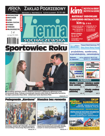 WSZYSTKO NA REMONT WSZYSTKO NA BUDOWĘ SOCHACZEW BROCHÓW IŁÓW NOWA SUCHA RYBNO TERESIN MŁODZIESZYN 2 zł (w tym 5% VAT) Nr 7 (1171) 18.02.2014 r. ISSN 1231-7179 Numer indeksu 328 006 Sportowiec Roku Usługi ślusarsko-spawalnicze SPAW - MONTER - spawanie aluminium - balustrady, schody - konstrukcje stalowe NOWA STRONA INTERNETOWA „ZIEMI SOCHACZEWSKIEJ” CZEKA NA TWOJE OGŁOSZENIE W NUMERZE Woda i ścieki Zabójca nadal bez zmian poszukiwany str. 3 QQPoznaliśmy sportowca, trenera i działacza wybranych w plebiscycie ogłoszonym przez sochaczewski ratusz. Podczas uroczystej gali wręczono także blisko 60 stypendiów burmistrza. Na zdjęciu pływaczka Alicja Ulicka - zdobywczyni tytułu Sportowca Roku więcej str. 17 Pożegnanie „Kordona” Staszica bez remontu Sochaczew uroczyście pożegnał ppor. Stanisława Janickiego, żołnierza AK, uczestnika powstania warszawskiego i Honorowego Obywatela Miasta więcej str. 2 Na wtorkowej sesji RM burmistrz zaproponuje radnym inne przeznaczenie pieniędzy zabezpieczonych na remont powiatowej ul. Staszica więcej str. 7 Komenda później str. 4 str. 5 Kiedy radna ustąpi str. 8 2 POŻEGNANIE 18 lutego 2014 nr 7 (1171) [email protected] ZIEMIA SOCHACZEWSKA Pieśń Cię weźmie, legenda przechowa WAŻNE TELEFONY MOSiR 46 862-77-59 PEC 46 862-92-00, telefony alarmowe 24h 604-206-108, 602-789-111 Pogotowie energetyczne 46 862-26-20 Pogotowie gazowe (Sime Polska) 602-343-343, 792-008-866 Pogotowie 999 Policja 997, 46 863-72-00 PKP 19-757 Koleje Mazowieckie 22 364-44-44 PKS Grodzisk Mazowiecki, baza w Sochaczewie 46 862-55-12 Sąd Rejonowy 46 862-32-64 Schronisko „Azorek” 791-604-108 791-606-109 (adopcje) Fundacja „Nero” 502-156-186 Starostwo Powiatowe 46 864-18-40, 46 864-18-73 Na znak żałoby na ulicach Sochaczewa zostały wywieszone biało-czerwone flagi przepasane kirem. W ceremonii pogrzebowej, która odbyła się w sochaczewskim kościele św. Wawrzyńca, oprócz rodziny i znajomych Stanisława Janickiego, udział wzięły władze miasta, na czele z burmistrzem Piotrem Osieckim, przedstawiciele Rady Miejskiej Sochaczewa, poseł Maciej Małecki, harcerze oraz kombatanci. Hołd Stanisławowi Janickiemu oddała FOT. KATARZYNA ŁAŻEWSKA QQW miniony wtorek 11 lutego pożegnaliśmy Honorowego Obywatela Sochaczewa, żołnierza Armii Krajowej obwodu „Skowronek”, uczestnika powstania warszawskiego w Zgrupowaniu Kampinos ppor. Stanisława Janickiego, ps. „Kordon”. Straż pożarna również Muzealna Grupa Rekonstrukcji Historycznej im. II/18 pp, wojsko z 3. Warszawskiej Brygady Rakietowej Obrony Powietrznej a także uczniowie i związkowcy. - Żegnamy wspaniałego reprezentanta pokolenia Kolumbów. Pierwszego pokolenia urodzonego i wychowanego w wolnej II Rzeczypospolitej. Pokolenia, które za wierność i pokój w Ojczyźnie zapłaciło straszliwą cenę. Do końca wierni swoim ideałom i do końca w obronie 998, 46 862-23-70 Szpital 46 864-95-00, 46 864-96-00 MPT Taxi 191-91 Taxi 46 862-28-42 USC 46 862-23-02 W kondukcie żałobnym maszerowała m.in. sochaczewska grupa rekonstrukcyjna Ojczyzny. Pokolenia, które na ziemi sochaczewskiej, zamiast spełniać marzenia, realizować plany, toczyło walkę zbrojną z okupantem niemieckim mówił burmistrz Piotr Osiecki. - Wielkim dramatem tego pokolenia było to, że w powojennej Polsce na naszych bohaterów czekały tortury, więzienie, a często także strzał w tył głowy. Ale oni nigdy na tę Polskę się nie pogniewali. Oni, dla Polski, gdy tylko im pozwolono, uczciwie i sumiennie pracowali. Od nas tutaj zgromadzonych zależy, czy Podziękowanie to wspaniałe pokolenie Kolumbów, czy Stanisław Janicki to nadal „zaplute karły reakcji” czy polscy bohaterowie również bohaterowie naszych czasów. W imieniu swoim i mieszkańców miasta żegnam Stanisława Janickiego, Honorowego Obywatela Sochaczewa, człowieka skromnego i jakże wielkiego, ale nie słowami, lecz czynami. Na zakończenie burmistrz przytoczy ostatnią strofę wiersza Zbigniewa Kabata „Armio Krajowa”, który nieoficjalnie jest hymnem żołnierzy AK: Nas nie stanie, lecz ty nie zginiesz, pieśń cię weźmie, legenda przechowa. Wichrem chwały w historię popłyniesz, Armio Krajowa. Gdy kondukt żałobny ruszał w kierunku cmentarza przy ul. Traugutta, miasto wstrzymało oddech, a przechodnie zatrzymywali się, by oddać cześć bohaterowi. Uroczystości pogrzebowe uświetnił Chór Towarzystwa Śpiewaczego Ziemi Sochaczewskiej oraz orkiestra wojskowa. Katarzyna Łażewska Pożegnanie W dniu 11 lutego 2014 r. odbył się pogrzeb naszego Taty - Stanisława Janickiego Dzięki wrażliwym sercom wielu osób zyskał on niezwykle uroczystą i piękną oprawę. Pragniemy wyrazić za to naszą wdzięczność i serdeczne podziękowanie. Dziękujemy w szczególności Panu Burmistrzowi Piotrowi Osieckiemu, Panu Posłowi Maciejowi Małeckiemu, Księżom, 3 Warszawskiej Brygadzie Rakietowej Obrony Powietrznej, Orkiestrze Wojskowej, Dyrekcji Muzeum Ziemi Sochaczewskiej, Muzealnej Grupie Historycznej, Pocztom Sztandarowym, chórowi, krewnym, sąsiadom i przyjaciołom. Rodzina ZS-200 Odszedł od nas wielki patriota, wspaniały człowiek, współautor książek o AK na ziemi sochaczewskiej, który przez lata pielęgnował pamięć o żołnierzach Armii Krajowej. Rodzinie serdeczne wyrazy współczucia i głębokiego żalu z powodu śmierci ppor. Stanisława Janickiego ps. „Kordon” składają Przewodniczący Rady Gminy Czesław Ćwikliński Wójt gminy Sochaczew Mirosław Orliński ZS-225 Urząd Miejski 46 862-27-30, 46 862-22-35 Urząd Skarbowy 46 862-26-04 Zakład Wodociągów i Kanalizacji 46 862-82-30 Zgłaszanie awarii sieci wodociągowej i kanalizacji sanitarnej 604-195-867, 696-056-281, 664-157-699 ZGM 46 862-81-06, 46 862-93-14 awarie elektryczne (tylko ZGM) 660-477-130 awarie wodno-kanalizacyjne (tylko ZGM) 660-477-129 ZKM 46 862-99-27 ZUS 46 862-64-33 ZIEMIA SOCHACZEWSKA WAŻNY TEMAT [email protected] Woda i ścieki