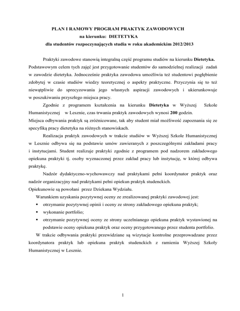 PLAN I RAMOWY PROGRAM PRAKTYK ZAWODOWYCH na kierunku: DIETETYKA dla studentów rozpoczynających studia w roku akademickim 2012/2013 Praktyki zawodowe stanowią integralną część programu studiów na kierunku Dietetyka. Podstawowym celem tych zajęć jest przygotowanie studentów do samodzielnej realizacji zadań w zawodzie dietetyka. Jednocześnie praktyka zawodowa umożliwia też studentowi pogłębienie zdobytej w czasie studiów wiedzy teoretycznej o aspekty praktyczne. Przyczynia się to też niewątpliwie do sprecyzowania jego własnych aspiracji zawodowych i ukierunkowuje w poszukiwaniu przyszłego miejsca pracy. Zgodnie z programem kształcenia na kierunku Dietetyka w Wyższej Humanistycznej Szkole w Lesznie, czas trwania praktyk zawodowych wynosi 200 godzin. Miejsca odbywania praktyk są zróżnicowane, tak aby student miał możliwość zapoznania się ze specyfiką pracy dietetyka na różnych stanowiskach. Realizacja praktyk zawodowych w trakcie studiów w Wyższej Szkole Humanistycznej w Lesznie odbywa się na podstawie umów zawieranych z poszczególnymi zakładami pracy i instytucjami. Student realizuje praktyki zgodnie z programem pod nadzorem zakładowego opiekuna praktyki tj. osoby wyznaczonej przez zakład pracy lub instytucję, w której odbywa praktykę. Nadzór dydaktyczno-wychowawczy nad praktykami pełni koordynator praktyk oraz nadzór organizacyjny nad praktykami pełni opiekun praktyk studenckich. Opiekunowie są powołani przez Dziekana Wydziału. Warunkiem uzyskania pozytywnej oceny ze zrealizowanej praktyki zawodowej jest: otrzymanie pozytywnej opinii i oceny ze strony zakładowego opiekuna praktyk; wykonanie portfolio; otrzymanie pozytywnej oceny ze strony uczelnianego opiekuna praktyk wystawionej na podstawie oceny opiekuna praktyk oraz oceny przygotowanego przez studenta portfolio. W trakcie odbywania praktyki przewidziane są wizytacje kontrolne przeprowadzane przez koordynatora praktyk lub opiekuna praktyk studenckich z ramienia Wyższej Szkoły Humanistycznej w Lesznie. 1 Zgodnie z programem kształcenia, na kierunku Dietetyka w Wyższej Szkole Humanistycznej w Lesznie obowiązuje następujący plan i program praktyk zawodowych: I. Wstępna praktyka w szpitalu (po pierwszym roku studiów): 1. Informacje ogólne: - czas trwania: 25 godz. - realizacja: II semestr - zaliczenie: IV semestr - miejsce odbywania: blok żywieniowy szpitala lub domu pomocy społecznej 2. Cel praktyki: Zapoznanie studenta z organizacją i funkcjonowaniem bloku żywienia w szpitalu, oraz z zadaniami dietetyka uczestniczącego w realizacji prawidłowego żywienia pacjentów. Zdobycie podstawowych praktycznych umiejętności wykonywania posiłków dla pacjentów. 3. Program (tematyka) praktyki obejmuje: - poznanie struktury organizacyjnej szpitala, działu żywienia, zapoznanie się z regulaminem szpitala lub domu pomocy społecznej - zasady organizacji pracy oraz wyposażenie techniczne bloku żywieniowego, zasady bhp - wdrażanie w codziennej pracy zasad bezpieczeństwa żywności i wymagań sanitarnohigienicznych zgodnie z obowiązującymi regulacjami prawnymi, zapoznanie się z zakładowymi dokumentami GHP i GMP - zasady przygotowywania posiłków dla poszczególnych grup pacjentów - współudział w przygotowaniu jadłospisów dla pacjentów - współudział w przygotowaniu, porcjowaniu i dystrybucji posiłków - ocenę jakości żywności oraz przydatności do spożycia różnych surowców i produktów żywnościowych - racjonalna gospodarka magazynowa w magazynie żywności - zapoznanie się z rolą i zadaniami dietetyka w szpitalu lub w domu pomocy społecznej oraz ze współpracą dietetyka z zespołem lekarskim 4. Zadanie do wykonania: Opracowanie sprawozdania z praktyki wraz z wykonaniem PORTFOLIA. Portfoliem będą dołączone załączniki, którymi mogą być: np. schemat struktury organizacyjnej placówki oraz działu żywienia, opis wyposażenia technicznego bloku żywieniowego, charakterystyka zakładowych systemów GHP i GMP, jadłospisy, w których tworzeniu student współuczestniczył, przykładowe dokumenty oceny 2 jakości żywności oraz gospodarki magazynowej, opis roli i zadań dietetyka w szpitalu lub domu pomocy społecznej II. Praktyka z technologii potraw: 1. Informacje ogólne: - czas trwania: 25 godz. - realizacja: II semestr - zaliczenie: IV semestr - miejsce odbywania: kuchnie w zakładach żywienia zbiorowego zamkniętego (szpitale, domy pomocy społecznej, zakłady opiekuńczo-wychowawcze, szkoły, internaty, przedszkola itp.) oraz żywienia zbiorowego otwartego (stołówki, jadłodajnie, restauracje itp.) 2. Cel praktyki: zapoznanie studenta z różnymi technologiami przygotowania potraw, zdobycie praktycznych umiejętności w zakresie przygotowywania posiłków zgodnie z zasadami prawidłowego żywienia. 3. Program (tematyka) praktyki obejmuje: - poznanie struktury organizacyjnej i specyfiki działalności danego zakładu żywienia zbiorowego; - zapoznanie się z organizacją pracy kuchni oraz z funkcjonalnością pomieszczeń, usytuowaniem poszczególnych stanowisk, wyposażeniem w sprzęt, zasadami bhp ; - ocenę warunków sanitarno-higienicznych w zakładzie oraz ocenę przygotowania zakładu do prowadzonej działalności; - poznanie funkcjonowania zakładowych systemów GMP, GHP oraz HACCP - organizację pracy w magazynie żywności, ocenę funkcjonalności magazynu oraz gospodarki magazynowej - zasady przechowywania surowców, półproduktów i gotowych wyrobów, ich ocenę przydatności do spożycia - ocenę właściwości sensorycznych żywności oraz ocenę organoleptyczną potraw - warunki transportu wewnętrznego produktów żywnościowych w zakładzie - ocenę surowców i półproduktów stosowanych w technologii gastronomicznej, ich przechowywanie i stosowanie - obróbkę wstępną surowców jako etap procesu technologicznego, znaczenie tej czynności - obróbkę cieplną w technologii potraw, jej wpływ na zmiany zachodzące w 