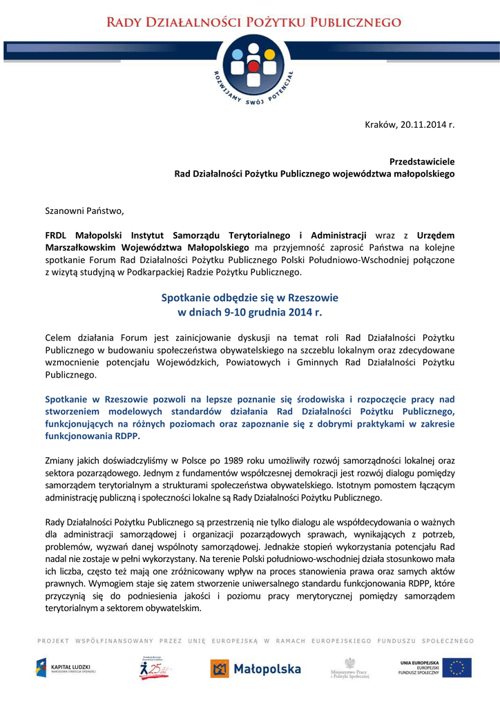 Kraków, 20.11.2014 r. Przedstawiciele Rad Działalności Pożytku Publicznego województwa małopolskiego Szanowni Państwo, FRDL Małopolski Instytut Samorządu Terytorialnego i Administracji wraz z Urzędem Marszałkowskim Województwa Małopolskiego ma przyjemność zaprosić Państwa na kolejne spotkanie Forum Rad Działalności Pożytku Publicznego Polski Południowo-Wschodniej połączone z wizytą studyjną w Podkarpackiej Radzie Pożytku Publicznego. Spotkanie odbędzie się w Rzeszowie w dniach 9-10 grudnia 2014 r. Celem działania Forum jest zainicjowanie dyskusji na temat roli Rad Działalności Pożytku Publicznego w budowaniu społeczeństwa obywatelskiego na szczeblu lokalnym oraz zdecydowane wzmocnienie potencjału Wojewódzkich, Powiatowych i Gminnych Rad Działalności Pożytku Publicznego. Spotkanie w Rzeszowie pozwoli na lepsze poznanie się środowiska i rozpoczęcie pracy nad stworzeniem modelowych standardów działania Rad Działalności Pożytku Publicznego, funkcjonujących na różnych poziomach oraz zapoznanie się z dobrymi praktykami w zakresie funkcjonowania RDPP. Zmiany jakich doświadczyliśmy w Polsce po 1989 roku umożliwiły rozwój samorządności lokalnej oraz sektora pozarządowego. Jednym z fundamentów współczesnej demokracji jest rozwój dialogu pomiędzy samorządem terytorialnym a strukturami społeczeństwa obywatelskiego. Istotnym pomostem łączącym administrację publiczną i społeczności lokalne są Rady Działalności Pożytku Publicznego. Rady Działalności Pożytku Publicznego są przestrzenią nie tylko dialogu ale współdecydowania o ważnych dla administracji samorządowej i organizacji pozarządowych sprawach, wynikających z potrzeb, problemów, wyzwań danej wspólnoty samorządowej. Jednakże stopień wykorzystania potencjału Rad nadal nie zostaje w pełni wykorzystany. Na terenie Polski południowo-wschodniej działa stosunkowo mała ich liczba, często też mają one zróżnicowany wpływ na proces stanowienia prawa oraz samych aktów prawnych. Wymogiem staje się zatem stworzenie uniwersalnego standardu funkcjonowania RDPP, które przyczynią się do podniesienia jakości i poziomu pracy merytorycznej pomiędzy samorządem terytorialnym a sektorem obywatelskim. Na spotkaniu zostaną powołane 3 Komisje Robocze, które podczas cyklicznie organizowanych 2-dniowych spotkań (3 spotkania od grudnia 2014 r. do lutego 2015 r.) zajmą się wypracowaniem modelowych standardów działania RDPP przy wsparciu ze strony ekspertów. W wyniku prac Komisji Roboczych powstaną trzy standardy odpowiednio dla każdego z poziomów (wojewódzki, powiatowy, gminny), z których zostanie stworzony jeden modelowy standard działania RDPP zawierający trzon wspólny dla wszystkich poziomów oraz osobne rozdziały uwzględniające specyfikę każdego z nich. Udział w Komisjach Roboczych przedstawicieli wszystkich województw pozwoli również na uwzględnienie zróżnicowania terytorialnego całego subregionu. Wspólne spotkanie rozpoczynamy wizytą studyjną w Rzeszowskiej Radzie Działalności Pożytku Publicznego. Wierzymy, że będzie to niepowtarzalna okazja do wymiany doświadczeń pomiędzy członkami Rad Działalności Pożytku Publicznego z obszaru 4 województw Polski południowo-wschodniej. Zapoznamy się również z genezą powstania i funkcjonowaniem Rzeszowskiego Centrum Organizacji Pozarządowych, efektem modelowej współpracy rzeszowskiego samorządu, organizacji pozarządowych oraz Rzeszowskiej RDPP. Udział w Forum i pracach Komisjach Roboczych jest bezpłatny. Zapewniamy zwrot kosztów dojazdu, wyżywienie i zakwaterowanie w ośrodku o wysokim standardzie w Rzeszowie. Dokładne miejsce spotkania, zostanie podane osobom, które potwierdzą udział w spotkaniu. Potwierdzenie udziału w spotkaniu należy dokonać na formularzu, który do 5 grudnia 2014 r. należy odesłać na adres e-mail: [email protected] Forum Rad Działalności Pożytku Publicznego realizowane jest w ramach projektu pt. „Zwiększenie potencjału funkcjonowania Rad Działalności Pożytku Publicznego w województwie małopolskim, podkarpackim, świętokrzyskim i lubelskim” (Działanie 5.4 Rozwój potencjału trzeciego sektora, Poddziałanie 5.4.2 Rozwój dialogu obywatelskiego POKL) realizowanego przez Fundację Rozwoju Demokracji Lokalnej w partnerstwie z Województwem Małopolskim. Projekt jest odpowiedzią na konkurs „Wdrożenie standardów współpracy jednostek samorządu terytorialnego z organizacjami pozarządowymi” ogłoszony przez Departament Wdrażania Europejskiego Funduszu Społecznego w Ministerstwie Pracy i Polityki Społecznej. W razie pytań, bardzo proszę o kontakt: Wojciech Bednarek FRDL Małopolski Instytut Samorządu Terytorialnego i Administracji tel. 12 6237244, e-mail: [email protected] Z poważaniem, Wojciech Bednarek Koordynator regionalny województwa małopolskiego