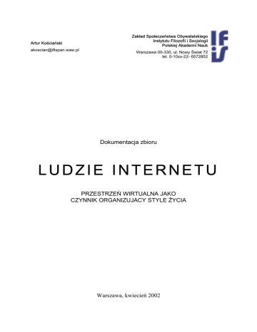 Zakład Społeczeństwa Obywatelskiego Instytutu Filozofii i Socjologii Polskiej Akademii Nauk Artur Kościański [email protected] Warszawa 00-330, ul. Nowy Świat 72 tel. 0-10xx-22- 6572852 Dokumentacja zbioru LUDZIE INTERNETU PRZESTRZEŃ WIRTUALNA JAKO CZYNNIK ORGANIZUJACY STYLE ŻYCIA Warszawa, kwiecień 2002 1/ Charakterystyka badania a/ Opis Obserwujemy, że w Polsce, tak jak niemal na całym świecie, szybko zwiększa się dostępność komputerów osobistych oraz możliwości przyłączania ich do sieci Internet. Wyrazistości nabierają różne formy kształtowania się motywacji (np. wymóg posługiwania się komputerem w miejscu pracy czy “moda”) zarówno do posiadania sprzętu komputerowego, jak i zdobywania umiejętności obsługi tej techniki. Również możemy zaobserwować, iż zjawiskom tym towarzyszy powstanie nowego segmentu polskiego społeczeństwa – zbiorowości, która dobrze przystosowuje się do nowego środowiska techniczno-kulturowego. Pojawia się zatem potrzeba systematycznej analizy tego stanu rzeczy. Realizacja prezentowanego projektu pozwoli osiągnąć takie podstawowe cele jak: [1] ustalenie wzorca (wzorców) postępowania w życiu codziennym internautów na podstawie analizy jakościowej stylu życia; [2] opracowanie monografii społeczności polskich internautów uwzględniającej zróżnicowanie stylów życia wedle koncepcji możliwości i ograniczeń wyborów podejmowanych przez ludzi w życiu codziennym; [3] określenie uwarunkowań strategii korzystania z zasobów i uczestnictwa w społecznościach internetowych; [4] weryfikacja przyjętych w projekcie koncepcji teoretycznych I narzędzi badawczych. Podstawowa hipoteza tego projektu opiera się na założeniu, iż badani “ludzie Internetu” (tzn. tacy użytkownicy, wśród których obserwuje się utrwalone sposoby korzystania z zasobów i uczestnictwa w społecznościach internetowych) stanowią zbiorowość, którą wedle koncepcji Elżbiety Neyman nazwać będziemy „marginesowością społeczno-kulturową”. W związku z tym, deklarowany i realizowany styl życia (wzorzec kulturowy) badanych, może cechować orientacja na działanie, którego treścią będzie głęboka innowacja modelu życia codziennego jednostek oraz całości społeczeństwa. Zadaniem badania również będzie zweryfikowanie hipotezy, iż zbiorowość internetowa posiada własności wzorcotwórcze dla szerszych kręgów społecznych. Wiele wskazuje, że tworzone przez nią schematy postrzegania rzeczywistości, ideały, wzorce postępowania mogą, w miarę jak Internet będzie się rozwijał i upowszechniał, przenikać do reszty społeczeństwa, stając się częścią codziennej rutyny. Dlatego, istniejąca dziś zbiorowość użytkowników Internetu – a szczególnie zbiorowość jednostek, dla których stanowi on zasadę organizującą styl życia – jest tak istotna społecznie. Nawet jeśli polscy internauci stanowią marginesowość częściową tzn. taką, która posiada wzorce kulturowe wspólne z resztą społeczeństwa, to możliwe, że jej wzorcotwórczość będzie przejawiać silne tendencje ekspansywne. W projektowanym studium – zgodnie z koncepcją Andrzeja Sicińskiego – styl życia rozumiany jest jako zespół zachowań, ich motywów oraz efektów, specyficznych dla danej jednostki lub zbiorowości. Zachowania podlegające obserwacjom określane są jako “rutynowe” w życiu jednostki czy zbiorowości; są powtarzalne, co do intencji, przebiegu i okoliczności. W takim rozumieniu styl życia to świadome lub nieuświadomione przyjmowanie strategii życiowej – “sposobu bycia w społeczeństwie”. Innymi słowy, styl życia to całość, na którą składają się [1] rozmaicie skonfigurowane działania i czynności, zróżnicowane, co do zakresu i formy; 2 [2] motywacje złożone z celów, oczekiwań i znaczeń im nadawanych; [3] rzeczy, stanowiące rezultat zachowań, którym również nadawane są określone znaczenia. Rozwiązanie postawionych problemów badawczych, jak i osiągnięcie wyznaczonych celów analizy będzie możliwe dzięki zastosowaniu metodologii badań nad stylami życia, opartej o jakościowe techniki analizy socjologicznej, wypracowanej w Zakładzie Badań nad Stylami Życia IFIS PAN. Oczekiwanymi rezultatami tak pomyślanego badania będą: skonstruowanie klasyfikacji stylów życia polskich internautów i określenie podstawowych cech zbiorowości użytkowników Internetu w świetle koncepcji marginesowości społeczno-kulturowej. Problematyka polskich badań użytkowania Internetu, dotyczy przede wszystkim cech rynku usług internetowych. Można stwierdzić, że w Polsce występuje brak właściwych badań socjologicznych, które koncentrowałyby się wokół poznawania zależności pomiędzy użytkowaniem Internetu a szeroko rozumianymi strukturami społecznymi czy kulturą. Poza wyjątkiem niezbyt precyzyjnych charakterystyk demograficznych oraz badania opinii użytkowników Internetu, pogłębionych i systematycznych analiz próżno szukać. Pozostaje jednak wiele pytań. Na przykład: jak strategia udziału w zbiorowości określa szanse jednostki na udział w dystrybucji nowych technik informacyjnych? Czy fakt, że jednostka korzysta z Internetu wpływa na zmianę sposobu i stylu życia? Czy użytkowanie Internetu stanowi czynnik tworzenia, a nawet podtrzymywania podziałów społecznych? W jakiej mierze użytkowanie Internetu może stanowić „rekwizyt” przynależności do pewnej kategorii społecznej? Czy, na przykład, użytkowanie Internetu sprzyja osiąganiu awansu społecznego, zwiększając możliwości codziennych wyborów w ramach stylu życia? Jaką wizję społeczeństwa, swojego w nim miejsca mają użytkownicy Internetu? W jakich obszarach życia zbiorowego uczestniczą internauci, a w jakich nie? Czy powstaje nowy styl kultury zdeterminowanej możliwościami kontaktu za pośrednictwem Internetu? Kwestie te stanowią poważny obszar eksp