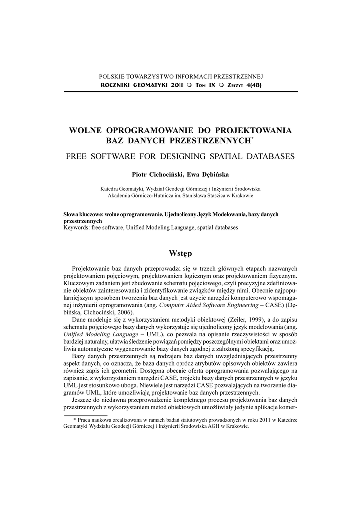 WOLNEPOLSKIE OPROGRAMOWANIE DO PROJEKTOWANIA BAZ DANYCH PRZESTRZENNYCH TOWARZYSTWO INFORMACJI PRZESTRZENNEJ 43 ROCZNIKI GEOMATYKI 2011 m TOM IX m Z ESZYT 4(48) WOLNE OPROGRAMOWANIE DO PROJEKTOWANIA BAZ DANYCH PRZESTRZENNYCH* FREE SOFTWARE FOR DESIGNING SPATIAL DATABASES Piotr Cichociñski, Ewa Dêbiñska Katedra Geomatyki, Wydzia³ Geodezji Górniczej i In¿ynierii rodowiska Akademia Górniczo-Hutnicza im. Stanis³awa Staszica w Krakowie S³owa kluczowe: wolne oprogramowanie, Ujednolicony Jêzyk Modelowania, bazy danych przestrzennych Keywords: free software, Unified Modeling Language, spatial databases Wstêp Projektowanie baz danych przeprowadza siê w trzech g³ównych etapach nazwanych projektowaniem pojêciowym, projektowaniem logicznym oraz projektowaniem fizycznym. Kluczowym zadaniem jest zbudowanie schematu pojêciowego, czyli precyzyjne zdefiniowanie obiektów zainteresowania i zidentyfikowanie zwi¹zków miêdzy nimi. Obecnie najpopularniejszym sposobem tworzenia baz danych jest u¿ycie narzêdzi komputerowo wspomaganej in¿ynierii oprogramowania (ang. Computer Aided Software Engineering CASE) (Dêbiñska, Cichociñski, 2006). Dane modeluje siê z wykorzystaniem metodyki obiektowej (Zeiler, 1999), a do zapisu schematu pojêciowego bazy danych wykorzystuje siê ujednolicony jêzyk modelowania (ang. Unified Modeling Language UML), co pozwala na opisanie rzeczywistoci w sposób bardziej naturalny, u³atwia ledzenie powi¹zañ pomiêdzy poszczególnymi obiektami oraz umo¿liwia automatyczne wygenerowanie bazy danych zgodnej z za³o¿on¹ specyfikacj¹. Bazy danych przestrzennych s¹ rodzajem baz danych uwzglêdniaj¹cych przestrzenny aspekt danych, co oznacza, ¿e baza danych oprócz atrybutów opisowych obiektów zawiera równie¿ zapis ich geometrii. Dostêpna obecnie oferta oprogramowania pozwalaj¹cego na zapisanie, z wykorzystaniem narzêdzi CASE, projektu bazy danych przestrzennych w jêzyku UML jest stosunkowo uboga. Niewiele jest narzêdzi CASE pozwalaj¹cych na tworzenie diagramów UML, które umo¿liwiaj¹ projektowanie baz danych przestrzennych. Jeszcze do niedawna przeprowadzenie kompletnego procesu projektowania baz danych przestrzennych z wykorzystaniem metod obiektowych umo¿liwia³y jedynie aplikacje komer* Praca naukowa zrealizowana w ramach badañ statutowych prowadzonych w roku 2011 w Katedrze Geomatyki Wydzia³u Geodezji Górniczej i In¿ynierii rodowiska AGH w Krakowie. 44 PIOTR CICHOCIÑSKI, EWA DÊBIÑSKA cyjne (przyk³adem mo¿e byæ duet: program Microsoft Visio jako narzêdzie do zapisu modeli i system ArcGIS firmy ESRI, w którym baza danych jest fizycznie implementowana). Jednak twórcy wolnego oprogramowania powoli zaczynaj¹ dostrzegaæ koniecznoæ posiadania odpowiednich narzêdzi równie¿ w tym zakresie geoinformatyki. Jest to szczególnie istotne tak¿e z tego powodu, ¿e coraz wiêcej aktów prawnych, norm i standardów zawiera w swojej treci schematy zapisane z u¿yciem graficznych notacji obiektowych. Przyk³adem mog¹ byæ specyfikacje INSPIRE czy te¿ szczegó³owe zapisy instrukcji technicznej G-5. Zastosowanie odpowiednich narzêdzi mo¿e stanowczo uprociæ tworzenie baz danych i aplikacji zgodnych z tak zaprezentowanymi wymaganiami. Normalizacja w zakresie informacji geograficznej Podwaliny dla baz danych przestrzennych da³y dzia³ania prowadzone na polu normalizacji w dziedzinie informacji geograficznej przez Miêdzynarodow¹ Organizacjê Normalizacyjn¹ (ang. International Organization for Standardization ISO) organizacjê pozarz¹dow¹ skupiaj¹c¹ krajowe instytucje normalizacyjne. Komitet techniczny ISO/TC 211 Geographic information/Geomatics od roku 1994 zmierza do ustanowienia zestrukturyzowanego zbioru norm dla informacji dotycz¹cych obiektów lub zjawisk zwi¹zanych bezporednio b¹d porednio z po³o¿eniem wzglêdem Ziemi. Normy te maj¹ okrelaæ metody, narzêdzia i us³ugi do zarz¹dzania danymi (w³¹czaj¹c w to definiowanie i opisywanie), pozyskiwanie, przetwarzanie, analizowanie, udostêpnianie, prezentowanie i przesy³anie tych danych w postaci cyfrowej pomiêdzy ró¿nymi u¿ytkownikami, systemami i lokalizacjami. Tym samym maj¹ wspieraæ zrozumienie i wykorzystanie informacji geograficznej, zwiêkszaæ jej dostêpnoæ, integracjê, wspólne wykorzystanie, pozwalaj¹c na wspó³dzia³anie systemów komputerowych wzbogaconych o mo¿liwoci geoprzestrzenne i u³atwiaj¹c tworzenie infrastruktur informacji przestrzennej na poziomie lokalnym, regionalnym i globalnym. Oczywicie dzia³ania w obszarze informacji geograficznej nie mog¹ siê odbywaæ w oderwaniu od technologii informatycznych. Skorzystano z nich buduj¹c schematy dla informacji geograficznej. W normie ISO 19101 okrelono ci¹g dzia³añ prowadz¹cy od modelu pojêciowego do schematu pojêciowego. Model pojêciowy jest niesformalizowanym, abstrakcyjnym opisem wybranego fragmentu wiata rzeczywistego. Po zastosowaniu do zapisu modelu pojêciowego jêzyka schematu pojêciowego, dostarczaj¹cego elementów semantycznych i syntaktycznych pozwalaj¹cych na precyzyjn¹ i jednoznaczn¹ definicjê, staje siê on schematem pojêciowym. Poniewa¿ jêzyk schematu pojêciowego zapewnia jednolitoæ metody i formatu opisu informacji, mo¿liwy jest odczyt i modyfikacja schematu pojêciowego zarówno przez u¿ytkownika, jak i przez systemy komputerowe. Specyficznym dla informacji geograficznej schematem jest schemat przestrzenny, s³u¿¹cy do opisu charakterystyk przestrzennych obiektów geograficznych. Zosta³ on zdefiniowany w normie ISO 19107. Schemat przestrzenny obejmuje definicje obiektów/elementów geometrycznych i topologicznych w dwu- i trójwymiarowej przestrzeni, które pozwalaj¹ na okrelanie cech przestrzennych obiektów geograficznych. Ka¿dy element geometryczny jest zbiorem punktów wraz z informacj¹ o systemie odniesienia opartym na wspó³rzêdnych. Norma wymienia miêdzy innymi takie zaawansowane elementy geometryczne jak klotoida czy siatka nieregularnych tr