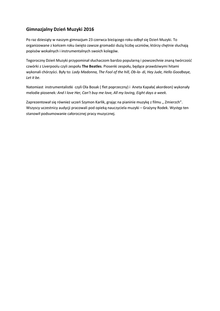 Gimnazjalny Dzień Muzyki 2016 Po raz dziesiąty w naszym gimnazjum 23 czerwca bieżącego roku odbył się Dzień Muzyki. To organizowane z końcem roku święto zawsze gromadzi dużą liczbę uczniów, którzy chętnie słuchają popisów wokalnych i instrumentalnych swoich kolegów. Tegoroczny Dzień Muzyki przypominał słuchaczom bardzo popularną i powszechnie znaną twórczość czwórki z Liverpoolu czyli zespołu The Beatles. Piosenki zespołu, będące prawdziwymi hitami wykonali chórzyści. Były to: Lady Madonna, The Fool of the hill, Ob-la- di, Hey Jude, Hello Goodbaye, Let it be. Natomiast instrumentalistki czyli Ola Bosak ( flet poprzeczny) i Aneta Kapała( akordeon) wykonały melodie piosenek: And I love Her, Can’t buy me love, All my loving, Eight days a week. Zaprezentował się również uczeń Szymon Karlik, grając na pianinie muzykę z filmu ,, Zmierzch”. Wszyscy uczestnicy audycji pracowali pod opieką nauczyciela muzyki – Grażyny Rodek. Występ ten stanowił podsumowanie całorocznej pracy muzycznej.