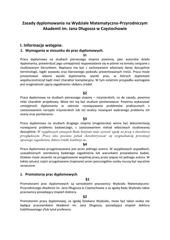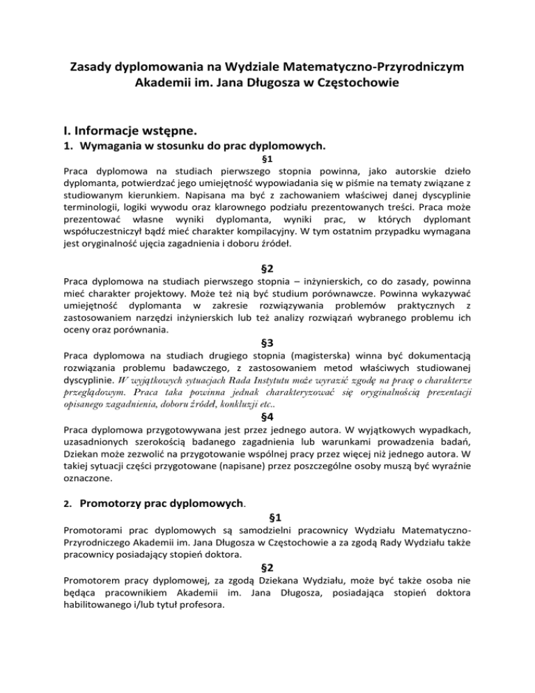 Zasady dyplomowania na Wydziale Matematyczno-Przyrodniczym Akademii im. Jana Długosza w Częstochowie I. Informacje wstępne. 1. Wymagania w stosunku do prac dyplomowych. §1 Praca dyplomowa na studiach pierwszego stopnia powinna, jako autorskie dzieło dyplomanta, potwierdzać jego umiejętność wypowiadania się w piśmie na tematy związane z studiowanym kierunkiem. Napisana ma być z zachowaniem właściwej danej dyscyplinie terminologii, logiki wywodu oraz klarownego podziału prezentowanych treści. Praca może prezentować własne wyniki dyplomanta, wyniki prac, w których dyplomant współuczestniczył bądź mieć charakter kompilacyjny. W tym ostatnim przypadku wymagana jest oryginalność ujęcia zagadnienia i doboru źródeł. §2 Praca dyplomowa na studiach pierwszego stopnia – inżynierskich, co do zasady, powinna mieć charakter projektowy. Może też nią być studium porównawcze. Powinna wykazywać umiejętność dyplomanta w zakresie rozwiązywania problemów praktycznych z zastosowaniem narzędzi inżynierskich lub też analizy rozwiązań wybranego problemu ich oceny oraz porównania. §3 Praca dyplomowa na studiach drugiego stopnia (magisterska) winna być dokumentacją rozwiązania problemu badawczego, z zastosowaniem metod właściwych studiowanej dyscyplinie. W wyjątkowych sytuacjach Rada Instytutu może wyrazić zgodę na pracę o charakterze przeglądowym. Praca taka powinna jednak charakteryzować się oryginalnością prezentacji opisanego zagadnienia, doboru źródeł, konkluzji etc.. §4 Praca dyplomowa przygotowywana jest przez jednego autora. W wyjątkowych wypadkach, uzasadnionych szerokością badanego zagadnienia lub warunkami prowadzenia badań, Dziekan może zezwolić na przygotowanie wspólnej pracy przez więcej niż jednego autora. W takiej sytuacji części przygotowane (napisane) przez poszczególne osoby muszą być wyraźnie oznaczone. 2. Promotorzy prac dyplomowych. §1 Promotorami prac dyplomowych są samodzielni pracownicy Wydziału MatematycznoPrzyrodniczego Akademii im. Jana Długosza w Częstochowie a za zgodą Rady Wydziału także pracownicy posiadający stopień doktora. §2 Promotorem pracy dyplomowej, za zgodą Dziekana Wydziału, może być także osoba nie będąca pracownikiem Akademii im. Jana Długosza, posiadająca stopień doktora habilitowanego i/lub tytuł profesora. §3 Promotorem pracy dyplomowej, za zgodą Dziekana Wydziału, może też być osoba nie spełniająca warunku określonego w §2 o ile zajmuje stanowisko profesora w zagranicznej szkole wyższej lub instytucji badawczej. 3. Termin składania pracy dyplomowej. §1 Termin składania pracy dyplomowej określa Regulamin Studiów. Termin ten może być przez Dziekana, w dopuszczalnych Regulaminem granicach, przesunięty, nie dłużej jednak niż do końca roku kalendarzowego, w którym dyplomant ukończył studia. §2 Praca dyplomowa składana jest w Dziekanacie Wydziału. §3 Warunkiem przyjęcia pracy jest jej opatrzenie przez promotora adnotacją: akceptuję, przyjmuję lub równoważną. II. Tematy prac dyplomowych. 1. Wybór tematu pracy przez studenta. §1 Studentom przysługuje prawo wyboru tematu pracy dyplomowej. Liczba proponowanych tematów musi przewyższać liczbę studentów dokonujących wyboru przynajmniej o 20%. §2 Proponowane tematy powinny być przedstawione studentom nie później niż na trzy miesiące przed końcem roku akademickiego poprzedzającego rok planowanego ukończenia studiów przez przyszłego dyplomanta. §3 Wybór konkretnego tematu ( i promotora) potwierdzany jest przez studenta w formie pisemnej. Potwierdzenie to przechowywane jest w teczce z dokumentami studenta. §4 Autorowi tematu pracy dyplomowej przysługuje prawo odmowy opieki promotorskiej nad konkretnym studentem. 2. Procedura zgłaszania tematów prac dyplomowych. §1 Osoby uprawnione i zobowiązane do prowadzenia prac dyplomowych przedstawiają propozycje tematów Dyrektorowi Instytutu w terminie przez niego wyznaczonym. §2 Zgłoszenie powinno mieć formę pisemną, zawierać sformułowanie tematu, krótką charakterystyką celów jakie mają być osiągnięte i informację o planowanych metodach badawczych. Można też wskazać wymagania w stosunku do kandydatów na dyplomanta. §3 Przedstawione tematy podlegają zatwierdzeniu przez Radę Instytutu. Rada ocenia w szczególności dostępność wymaganych przy realizacji proponowanego tematu narzędzi i aparatury badawczej. §4 Przyjęte tematy prac mają charakter roboczy i mogą być nieznacznie zmodyfikowane o ile taka potrzeba ujawni się w trakcie realizacji pracy. §5 Dyrektor Instytutu informuje Radę Wydziału o zaaprobowanych przez Instytut tematach, ich liczbie i charakterze. §6 Ostateczne sformułowania tematów prac dyplomowych Rada Wydziału zatwierdza nie później niż na trzy miesiące przed początkiem ostatniej sesji egzaminacyjnej w programie studiów dyplomanta. III. Formalne wymagania wobec pracy dyplomowej. 1. Język pracy. §1 Praca dyplomowa powinna być napisana w języku polskim z wyłączeniem sytuacji przedstawionych w §2. §2. Dziekan Wydziału może wyrazić zgodę na przedstawienie pracy w innym języku niż język polski. Dotyczy to w szczególności studentów obcokrajowców, prac prowadzonych przez promotorów obcokrajowców, prac przygotowanych na podstawie badań prowadzonych w uczelni zagranicznej etc.. 2. Strona tytułowa. §1 Strona tytułowa musi zawierać napis: Akademia im. Jana Długosza w Częstochowie; po nim: Wydział Matematyczno-Przyrodniczy; poniżej: kierunek studiów; a następnie: specjalność. §2 Na stronie tytułowej może być umieszczone godło Akademii według wzoru umieszczonego w Statucie. §3 Poniżej elementów określonych w §1 i §2 winno znajdować się nazwisko studenta – autora pracy, numer albumu a pod nim tytuł pracy. §4 Na stronie tytułowej wymagane jest także wskazanie roku przygotowania pracy: Częstochowa 201n oraz Katedry/Zakładu