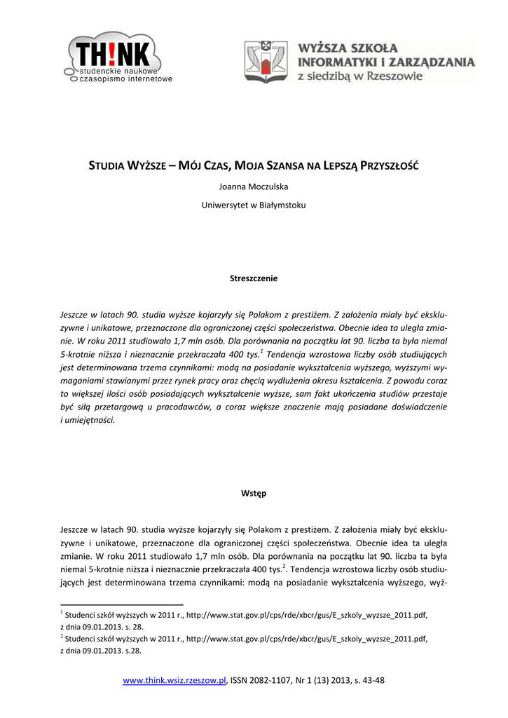 STUDIA WYŻSZE – MÓJ CZAS, MOJA SZANSA NA LEPSZĄ PRZYSZŁOŚĆ Joanna Moczulska Uniwersytet w Białymstoku Streszczenie Jeszcze w latach 90. studia wyższe kojarzyły się Polakom z prestiżem. Z założenia miały być ekskluzywne i unikatowe, przeznaczone dla ograniczonej części społeczeństwa. Obecnie idea ta uległa zmianie. W roku 2011 studiowało 1,7 mln osób. Dla porównania na początku lat 90. liczba ta była niemal 5-krotnie niższa i nieznacznie przekraczała 400 tys.1 Tendencja wzrostowa liczby osób studiujących jest determinowana trzema czynnikami: modą na posiadanie wykształcenia wyższego, wyższymi wymaganiami stawianymi przez rynek pracy oraz chęcią wydłużenia okresu kształcenia. Z powodu coraz to większej ilości osób posiadających wykształcenie wyższe, sam fakt ukończenia studiów przestaje być siłą przetargową u pracodawców, a coraz większe znaczenie mają posiadane doświadczenie i umiejętności. Wstęp Jeszcze w latach 90. studia wyższe kojarzyły się Polakom z prestiżem. Z założenia miały być ekskluzywne i unikatowe, przeznaczone dla ograniczonej części społeczeństwa. Obecnie idea ta uległa zmianie. W roku 2011 studiowało 1,7 mln osób. Dla porównania na początku lat 90. liczba ta była niemal 5-krotnie niższa i nieznacznie przekraczała 400 tys.2. Tendencja wzrostowa liczby osób studiujących jest determinowana trzema czynnikami: modą na posiadanie wykształcenia wyższego, wyż1 Studenci szkół wyższych w 2011 r., http://www.stat.gov.pl/cps/rde/xbcr/gus/E_szkoly_wyzsze_2011.pdf, z dnia 09.01.2013. s. 28. 2 Studenci szkół wyższych w 2011 r., http://www.stat.gov.pl/cps/rde/xbcr/gus/E_szkoly_wyzsze_2011.pdf, z dnia 09.01.2013. s.28. www.think.wsiz.rzeszow.pl, ISSN 2082-1107, Nr 1 (13) 2013, s. 43-48 Studia wyższe – mój czas, moja szansa na lepszą przyszłość szymi wymaganiami stawianymi przez rynek pracy oraz chęcią wydłużenia okresu kształcenia z powodu coraz to większej ilości osób posiadających wykształcenie wyższe, sam fakt ukończenia studiów przestaje być siłą przetargową u pracodawców, a coraz większe znaczenie mają posiadane doświadczenie i umiejętności. 1. Edukacja i szkolnictwo wyższe w Polsce Obecnie edukacja jest ważna w życiu każdego człowieka. Brak wykształcenia podstawowego często prowadzi do wykluczenia społecznego. Kształcenie nie powinno kończyć się jednak tylko na koniecznym minimum. Pisanie i czytanie to podstawowe umiejętność potrzebne do prawidłowego funkcjonowania w obecnych czasach. Ważne jest, aby odczytywanie napisów nie kończyło się na głośnym wypowiedzeniu zdania, lecz na ich właściwej interpretacji. Zdolność czytania ze zrozumieniem to jednak nie wszystko. Wielu ludzi po osiągnięciu wymaganego minimum kształcenia kontynuuje naukę. Może to robić dzięki istnieniu szkół policealnych, szkół wyższych oraz poprzez uczestnictwo w różnorodnych szkoleniach. Wybór odpowiedniej ścieżki edukacyjnej jest bardzo ważny i zależy od indywidualnych predyspozycji i możliwości. Odpowiedni kierunek kształcenia w przyszłości może zaowocować karierą zawodową. Jednak nie każdy, kto ukończy kształcenie w interesującym go kierunku, ma zagwarantowane dobre stanowisko pracy. Tylko osoby posiadające predyspozycje i talent mają szanse wyróżnić się spośród tłumu osób kształcących się oraz odnieść sukces zawodowy zgodny z ukończonym kierunkiem studiów. Talentu nie można kupić za wszystko złoto świata3, jednak najwybitniejszy, najprawdziwszy talent bez charakteru będzie zawsze bengalskim ogniem, co nie grzeje4. Przytoczone cytaty z powieści K. Makuszyńskiego stanowią podstawę do rozważań na temat kształcenia w trakcie studiów wyższych w Polsce. Predyspozycje człowieka nie są wystarczające do zdobycia wiedzy i umiejętności. Potrzebna jest także odpowiednia postawa oraz warunki. Jednak znajomość czegoś nie świadczy o umiejętności zastosowania posiadanej wiedzy. Edukacja stanowi zatem podstawę do prawidłowego rozwoju, a w przyszłości do efektywnego życia zawodowego. Dlatego też edukacja nie powinna być okresem, w którym jesteś nauczany przez kogoś, kogo nie znasz, o czymś, czego nie chcesz wiedzieć jak to powiedział Gilbert Keith Chesterton5. Edukacja kojarzy się głównie z rozwojem umysłowym oraz wiedzą człowieka. Jest to proces poszerzania wiedzy, polegający na zdobywaniu jej w szkole lub też poza nią. Edukacja może oznaczać również stan wiedzy konkretnej jednostki, społeczeństwa, a nawet całego narodu. W tym kontekście można mówić o dobrej czy też złej edukacji. Jednym z zadań edukacji są działania związane wykształceniem oraz wychowaniem młodego pokolenia. Kształcenie wpływa na kształtowanie się pewnych cech, jak również nawyków oraz umiejętności6. 3 K. Makuszyński, Szaleństwa panny Ewy, http://chomikuj.pl/wajamiga/Makuszy*c5*84ski+Kornel/K.+Makuszy*c5*84ski++++Szale*c5*84stwa+panny+E wy,1245770116.pdf , z dnia 22.03.2013, s. 173 4 K. Makuszyński, Szatan z siódmej klasy, wyd. Nasza Księgarnia, Warszawa 1985, s.155. 5 Edukacja, http://pl.wikiquote.org/wiki/Gilbert_Keith_Chesterton, z dnia 17.03.2013. 6 Pojęcie edukacji, http://5ka.pl/pojecie-edukacji/, z dnia 04.01.2013. 44 Studia wyższe – mój czas, moja szansa na lepszą przyszłość W naszym kraju edukacja podlega pod dwa ministerstwa: Ministerstwo Edukacji Narodowej (MEN) oraz Ministerstwo Nauki i Szkolnictwa Wyższego (MNiSW). Wymienione instytucje mają za zadanie określić kierunki kształcenia, ogół czynności oraz procesy mające na celu przekazanie wiedzy, a także wskazać pewne cechy oraz umiejętności jakie powinien nabyć każdy uczący się7. Prawidłowo dobrany system nauczania jest bardzo ważny w dzisiejszych czasach. Studia wyższe mogą stać się szansą na lepsze życie. To właśnie w trakcie edukacji pomaturalnej powinno się zbierać doświadczenie oraz