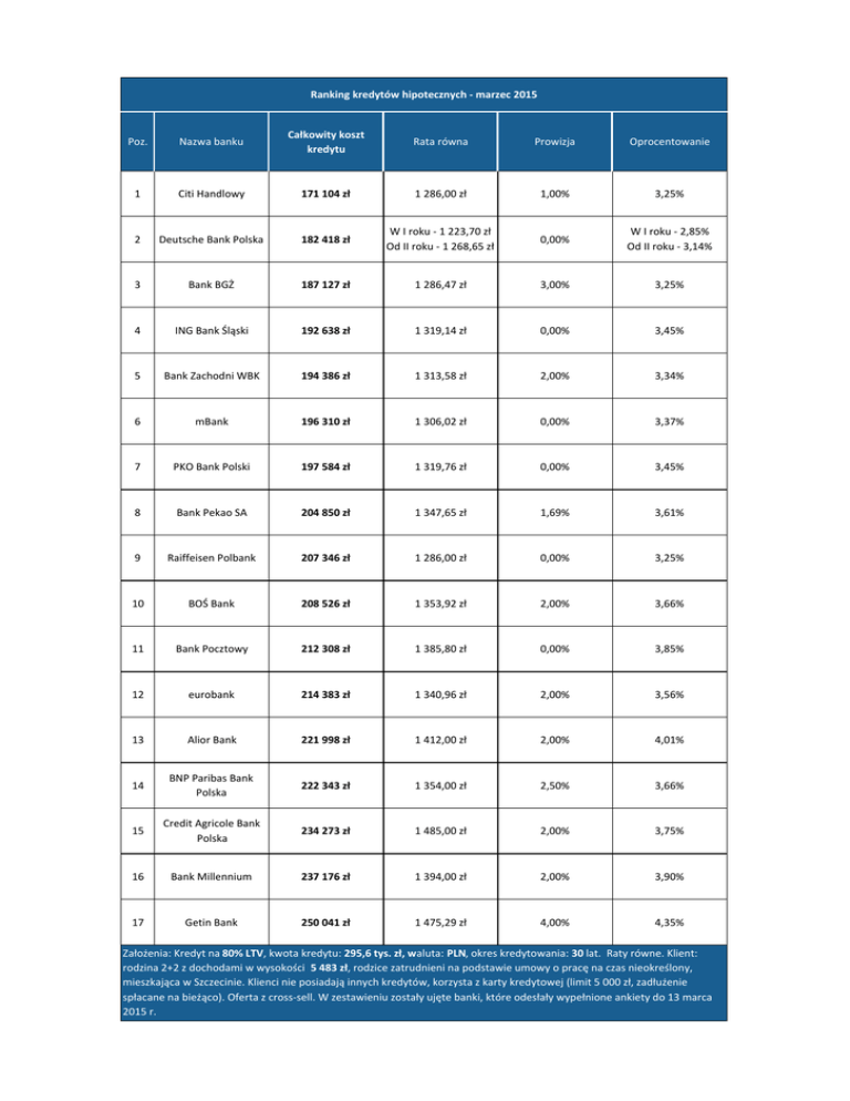 Ranking kredytów hipotecznych -‐ marzec 2015 Poz. Nazwa banku Całkowity koszt kredytu Rata równa Prowizja Oprocentowanie 1 Citi Handlowy 171 104 zł 1 286,00 zł 1,00% 3,25% 2 Deutsche Bank Polska 182 418 zł W I roku -‐ 1 223,70 zł Od II roku -‐ 1 268,65 zł 0,00% W I roku -‐ 2,85% Od II roku -‐ 3,14% 3 Bank BGŻ 187 127 zł 1 286,47 zł 3,00% 3,25% 4 ING Bank Śląski 192 638 zł 1 319,14 zł 0,00% 3,45% 5 Bank Zachodni WBK 194 386 zł 1 313,58 zł 2,00% 3,34% 6 mBank 196 310 zł 1 306,02 zł 0,00% 3,37% 7 PKO Bank Polski 197 584 zł 1 319,76 zł 0,00% 3,45% 8 Bank Pekao SA 204 850 zł 1 347,65 zł 1,69% 3,61% 9 Raiffeisen Polbank 207 346 zł 1 286,00 zł 0,00% 3,25% 10 BOŚ Bank 208 526 zł 1 353,92 zł 2,00% 3,66% 11 Bank Pocztowy 212 308 zł 1 385,80 zł 0,00% 3,85% 12 eurobank 214 383 zł 1 340,96 zł 2,00% 3,56% 13 Alior Bank 221 998 zł 1 412,00 zł 2,00% 4,01% 14 BNP Paribas Bank Polska 222 343 zł 1 354,00 zł 2,50% 3,66% 15 Credit Agricole Bank Polska 234 273 zł 1 485,00 zł 2,00% 3,75% 16 Bank Millennium 237 176 zł 1 394,00 zł 2,00% 3,90% 17 Getin Bank 250 041 zł 1 475,29 zł 4,00% 4,35% Założenia: Kredyt na 80% LTV, kwota kredytu: 295,6 tys. zł, waluta: PLN, okres kredytowania: 30 lat. Raty równe. Klient: rodzina 2+2 z dochodami w wysokości 5 483 zł, rodzice zatrudnieni na podstawie umowy o pracę na czas nieokreślony, mieszkająca w Szczecinie. Klienci nie posiadają innych kredytów, korzysta z karty kredytowej (limit 5 000 zł, zadłużenie spłacane na bieżąco). Oferta z cross-‐sell. W zestawieniu zostały ujęte banki, które odesłały wypełnione ankiety do 13 marca 2015 r.