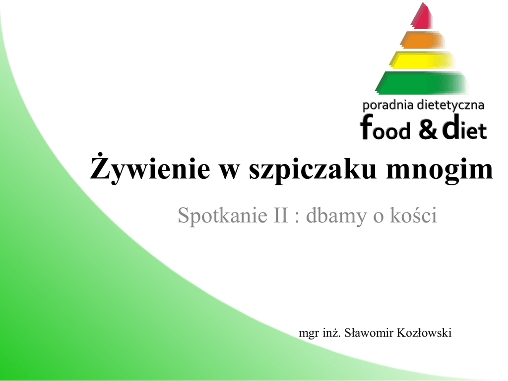 Żywienie w szpiczaku mnogim Spotkanie II : dbamy o kości mgr inż. Sławomir Kozłowski szpiczak mnogi leczenie osteoporoza- zaburzenie mineralizacji kości Czynniki środowiskowe • dieta (wapń i witamina D) • styl życia wzrost ryzyka złamań kości Spożywaj codziennie co najmniej dwie duże szklanki mleka mleko można zastąpić jogurtem, kefirem, a częściowo także serem Mleko –2% –pasteryzowane w niskiej temperaturze –nie UHT –świeże mleko Mleczne produkty fermentowane –2% tłuszczu- nie light, nie śmietankowe ani greckie –o smaku naturalnym, nie smakowe (np. owocowe), –probiotyczne –nietermizowane –skład Sery • sery twarogowe- nie są dobrym źródłem wapnia • sery żółte- bardzo dobre źródło wapnia ale także dużo tłuszczu i cholesterolunajlepszy jest edamski • sery pleśniowe, brie, camembert- j.w. • sery topione- z tych najlepiej zrezygnować Nietolerancja laktozy • mleczne produkty fermentowane • mleko acidofilne • sery żółte • masło „ekstra” Rezygnacja z mleka • produkty wzbogacane w wapń (chleb, makarony, mleka sojowe, ryżowe, margaryny, masło), • suplementacja Co pogarsza przyswajanie wapnia? –szczawiany – szczaw, rabarbar, warzywa kapustne, kawa, mocna herbata –duże ilości błonnika (otręby w dużej ilości) –duże ilości tłuszczu –białko zwierzęce –duże ilości fosforu (jaja) Inne źródła wapnia • drobne ryby (puszkowane) z ośćmi- witamina D • kapusta, jarmuż, koper włoski, koper ogrodowy, liście pietruszki (szczawiany) • fasola i warzywa strączkowe • orzechy laskowe, ziarno słonecznika, sezam • płatki owsiane, otręby pszenne (błonnik, fityniany) • jaja (fosfor) • wody pitne zawartość wapnia [mg] zawartość sodu [mg] mleko 2% (250ml) 240 90 maślanka naturalna (250g) 275 150 kefir naturalny (200g) 206 76 jogurt naturalny (150g) 255 95 ser feta light (plaster) 150 330 serek wiejski (1/2 opakowania) 60 285 ser biały chudy (40g) 38 16 ser żółty (2 plastry) 242 269 Dzienna porcja wapnia • 2 szklanki mleka 500ml 600mg Ca • mały jogurt naturalny 150g 255mg Ca • żółty ser 30g 242mg Ca = 1097mg (589mg Na, 31,8g białka) Dzienne zapotrzebowanie na wapń: < 50 r,ż. 1000mg >50 r.ż. 1300mg 1097mg Ca 589mg Na 31,8g białka Sam wapń nie wystarczy- witamina D • dobrej jakości ryby- najwięcej w tłustych rybach morskich • śledź, łosoś, makrela, pstrąg, sola, halibut, karp mięso, drób, przetwory mleczne masło/margaryna wzbogacana wzbogacane oleje Inne czynniki dietetyczne wpływające na zdrowie kości • spożycie soli • nadmierne spożycie węglowodanów prostych • otyłość i nadwaga, ale także zbyt niska masa ciała • nadmierne spożycie białka, ale i za niskie spożycie białka Inne czynniki stylu życia wpływające na zdrowie kości • używki- palenie, alkohol, napoje gazowane oraz zawierające kwas ortofosforowy (cola), kawa, herbata • aktywność fizyczna • ekspozycja skóry na promieniowanie słoneczne- produkcja witaminy D Suplementy • • • • w porozumieniu z lekarzem dla kogo? spożywane wraz z produktami mlecznymi Ca + D szpiczak mnogi leczenie niedokrwistość Czynniki środowiskowe • dieta (pożywienie niskiej jakości) B12, foliany • foliany- zielone warzywa, drożdże, pełnoziarniste produkty zbożowe, warzywa strączkowe • B12- produkty pochodzenia zwierzęcego (mięso, jaja, ryby tłuste) Żelazo • mięso dobrej jakości witamina C • • • • jaja pieczywo żytnie, płatki zbożowe- kwas foliowy kasze: jaglana, gryczana natka pietruszki, zielone liście warzyw – brokuły, szpinak, jarmuż- dużo niższa przyswajalność • ryby dobrej jakości Jedź mało mięsa ale porządne • nie tłuste- drób, dziczyzna, polędwica wieprzowa, wołowa, chudy schab • „produkty wysoko wydajne” = chemia i ½ mięsa • parówki • kiełbasy drobno mielone, pasztety • wędzone ryby i mięsa • „szynka” drobiowa • pakowane wędliny mają podany skład ale często mają też więcej konserwantów Jedź mało mięsa ale porządne • szare/ białe wędliny, nie czerwone • szynki długodojrzewające • kupowane w małych sklepach, nie w supermarketach • ekologiczne • cena!!! • własnej produkcji wędliny, pasztety Dbaj o różnorodność spożywanych produktów!!! Dziękuję za uwagę!