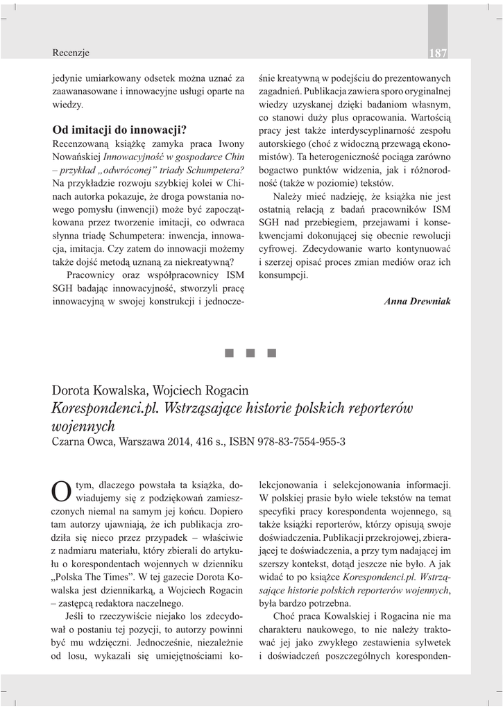 Recenzje 187 jedynie umiarkowany odsetek można uznać za zaawanasowane i innowacyjne usługi oparte na wiedzy. śnie kreatywną w podejściu do prezentowanych zagadnień. Publikacja zawiera sporo oryginalnej wiedzy uzyskanej dzięki badaniom własnym, co stanowi duży plus opracowania. Wartością pracy jest także interdyscyplinarność zespołu autorskiego (choć z widoczną przewagą ekonomistów). Ta heterogeniczność pociąga zarówno bogactwo punktów widzenia, jak i różnorodność (także w poziomie) tekstów. Należy mieć nadzieję, że książka nie jest ostatnią relacją z badań pracowników ISM SGH nad przebiegiem, przejawami i konsekwencjami dokonującej się obecnie rewolucji cyfrowej. Zdecydowanie warto kontynuować i szerzej opisać proces zmian mediów oraz ich konsumpcji. Od imitacji do innowacji? Recenzowaną książkę zamyka praca Iwony Nowańskiej Innowacyjność w gospodarce Chin – przykład „odwróconej” triady Schumpetera? Na przykładzie rozwoju szybkiej kolei w Chinach autorka pokazuje, że droga powstania nowego pomysłu (inwencji) może być zapoczątkowana przez tworzenie imitacji, co odwraca słynna triadę Schumpetera: inwencja, innowacja, imitacja. Czy zatem do innowacji możemy także dojść metodą uznaną za niekreatywną? Pracownicy oraz współpracownicy ISM SGH badając innowacyjność, stworzyli pracę innowacyjną w swojej konstrukcji i jednocze- t Anna Drewniak t t Dorota Kowalska, Wojciech Rogacin Korespondenci.pl. Wstrząsające historie polskich reporterów wojennych Czarna Owca, Warszawa 2014, 416 s., ISBN 978-83-7554-955-3 O tym, dlaczego powstała ta książka, dowiadujemy się z podziękowań zamieszczonych niemal na samym jej końcu. Dopiero tam autorzy ujawniają, że ich publikacja zrodziła się nieco przez przypadek – właściwie z nadmiaru materiału, który zbierali do artykułu o korespondentach wojennych w dzienniku „Polska The Times”. W tej gazecie Dorota Kowalska jest dziennikarką, a Wojciech Rogacin – zastępcą redaktora naczelnego. Jeśli to rzeczywiście niejako los zdecydował o postaniu tej pozycji, to autorzy powinni być mu wdzięczni. Jednocześnie, niezależnie od losu, wykazali się umiejętnościami ko- lekcjonowania i selekcjonowania informacji. W polskiej prasie było wiele tekstów na temat specyfiki pracy korespondenta wojennego, są także książki reporterów, którzy opisują swoje doświadczenia. Publikacji przekrojowej, zbierającej te doświadczenia, a przy tym nadającej im szerszy kontekst, dotąd jeszcze nie było. A jak widać to po książce Korespondenci.pl. Wstrząsające historie polskich reporterów wojennych, była bardzo potrzebna. Choć praca Kowalskiej i Rogacina nie ma charakteru naukowego, to nie należy traktować jej jako zwykłego zestawienia sylwetek i doświadczeń poszczególnych koresponden- 188 tów wojennych, ich fascynujących historii i ujawnianych kulisów warsztatu. To coś więcej – analiza całego zjawiska, jakim jest polskie dziennikarstwo wojenne. Zjawiska w pewnym sensie młodego, które po 1989 roku nabrało zupełnie nowego wymiaru. Jak zauważa w przedmowie wieloletni korespondent zagraniczny i redaktor amerykańskiego „Newsweeka” Andrew Nagorski: „Poza wybitnym wyjątkiem Ryszarda Kapuścińskiego PRL nie dostarczyła zbyt wielu precedensów, które można było wykorzystać w pracy korespondenta. Przedstawiciele nowego – prędko wyłonionego w procesie samodzielnego wyboru – pokolenia polskich korespondentów wojennych chętniej widzieli siebie u boku amerykańskich i europejskich kolegów. Z początku zresztą często prosili ich o rady. Szybko jednak sami stali się szanowanymi przez nas kolegami po fachu”1. Jeśli chodzi o aspekty definicyjne, to już tytuł wskazuje, że autorzy obydwa pojęcia „reporter wojenny” i „korespondent wojenny” traktują synonimicznie. W książce te określenia występują naprzemiennie. Omawiana publikacja, poza przedmową Nagorskiego, podziękowaniami autorów i załączonymi na końcu fotografiami, składa się z 11 rozdziałów. Każdy z nich prezentuje sylwetkę i doświadczenia innego pracownika mediów, odpowiednio: Jacka Czarneckiego, Marii Wiernikowskiej, Krzysztofa Millera, Artura Łukasiewicza, Wiktora Batera, Radosława Kietlińskiego, Wojciecha Rogacina, Miłady Jędrysik, nieżyjącego już Waldemara Milewicza, Piotra Góreckiego oraz Wojciecha Jagielskiego. W tym gronie jest dziewięciu dziennikarzy prasowych, radiowych i telewizyjnych, jeden fotoreporter oraz jeden operator telewizyjny. Taką wszechstronność należy uznać za atut pozycji Recenzje Kowalskiej i Rogacina. Funkcjonowanie mediów w warunkach wojennych poznajemy dzięki temu z kilku perspektyw. Zaletą Korespondentów.pl jest różnorodność form prezentacji jej bohaterów. W książce znajdziemy wywiady z korespondentami, ich pogłębione sylwetki, zapiski z pracy w formie dziennika czy nawet alfabet sporządzony przez Artura Łukasiewicza. Choć w poszczególnych rozdziałach są fragmenty bardzo podobne – zwłaszcza te dotyczące warsztatu, przebiegu pracy czy motywacji – to każdy z nich pozostaje całkowicie autonomiczny. A co najważniejsze, zdaje się mieć osobną myśl przewodnią, wyraźnie zarysowany kluczowy problem. Autorzy z każdym z bohaterów rozmawiali niby o tym samym, ale rozmawiali inaczej. W przypadku pierwszego wywiadu z doświadczonym Jackiem Czarneckim z Radia ZET niezwykle istotne okazało się np. jego analityczne spojrzenie na zmiany, jakie zaszły w polskim dziennikarstwie wojennym. Według Czarneckiego momentem przełomowym były tutaj zamachy na World Trade Center z 2001 roku. Dziennikarz stwierdza: „Przed jedenastym września bycie korespondentem wojennym było dość ekskluzywne. Po atakach na WTC zaczęliśmy mówić o dziennikarstwie stadnym”2. Jego zdaniem przed wspomnianą datą mieliśmy do czynienia z prawdziwymi reporterami wojennymi, którzy działali samotnie, któ