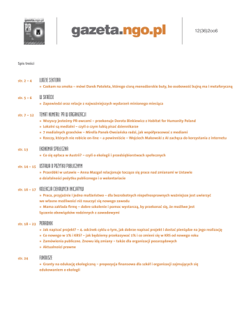 12(36)2oo6 Spis treści str. 2 – 4 LUDZIE SEKTORA » Czekam na smoka – mówi Darek Patoleta, którego cisną menedżerskie buty, bo osobowość bujną ma i metaforyczną str. 5 – 6 W SKRÓCIE » Zapowiedzi oraz relacje z najważniejszych wydarzeń minionego miesiąca str. 7 – 12 TEMAT NUMERU: PR W ORGANIZACJI » Wszyscy jesteśmy PR-owcami – przekonuje Dorota Binkiewicz z Habitat for Humanity Poland » Lokalni są medialni – czyli o czym lubią pisać dziennikarze » 7 medialnych grzechów – Mirella Panek-Owsiańska radzi, jak współpracować z mediami » Rzeczy, których nie robicie on-line – a powinniście – Wojciech Makowski z AI zachęca do korzystania z internetu str. 13 EKONOMIA SPOŁECZNA » Co się opłaca w Austrii? – czyli o ekologii i przedsiębiorstwach społecznych str. 14 – 15 USTAWA O POŻYTKU PUBLICZNYM » Przeróbki w ustawie – Anna Mazgal relacjonuje toczące się prace nad zmianami w Ustawie o działalności pożytku publicznego i o wolontariacie str. 16 – 17 KOLEKCJA CIEKAWYCH INICJATYW » Praca, przyjaźnie i jedno małżeństwo – dla bezrobotnych niepełnosprawnych ważniejsze jest uwierzyć we własne możliwości niż nauczyć się nowego zawodu » Mama zakłada firmę – dobre szkolenie i pomoc wystarczą, by przekonać się, że możliwe jest łączenie obowiązków rodzinnych z zawodowymi str. 18 – 23 PORADNIK » Jak napisać projekt? – 4. odcinek cyklu o tym, jak dobrze napisać projekt i dostać pieniądze na jego realizację » Co nowego w 1% i KRS? – jak będziemy przekazywać 1% i co zmieni się w KRS od nowego roku » Zamówienia publiczne. Znowu idą zmiany – także dla organizacji pozarządowych » Aktualności prawne str. 24 FUNDUSZE » Granty na edukację ekologiczną – propozycja finansowa dla szkół i organizacji zajmujących się edukowaniem o ekologii LUDZIE SEKTORA 2 CZEKAM NA SMOKA Pozarządówkę na polsko-niemieckim pograniczu rozwija Darek Patoleta – człowiek zakochany w organizacjach pozarządowych. Rozwija je i wspiera. Ale menedżerskie buty cisną go, bo osobowość bujną ma i metaforyczną. MAŁGORZATA BOROWSKA LUDZIE SEKTORA gazeta.ngo.pl 12.2oo6 – Jestem człowiekiem ze Wschodu. Mieszanką katolickiej polskości spod Częstochowy z domieszką krwi stepowej, ukraińskiej. I chociaż w Siedlcach, skąd pochodzę, nie mieszkam od 20 lat, to ciągle jestem ulepiony z tej samej gliny: sentymentalnej, refleksyjnej, upartej i wrażliwej. Tak o sobie mówi Dariusz Patoleta, szef Fundacji na rzecz Collegium Polonicum ze Słubic. Od 10 lat pracuje „na prowincji”. Mówi tak z przekąsem, bo to wcale wyjątkowe miejsce: przygraniczne, sąsiadujące z niemieckim Frankfurtem. W dobie UE to nie dwa, a raczej jedno miasto bezlitośnie przecięte Odrą na pół. W lewej kieszeni nosisz euro, w prawej – złotówki. Na granicznym moście nie straszą zasieki; pogranicznik nudzi się, na dokument spogląda pro forma. Ze Słubic idzie się „za granicę” odebrać dziecko z przedszkola albo na zajęcia na Viadrinę. Po polskiej stronie ląduje się u fryzjera lub w hurtowni papierosów. Poza tą wyjątkowością, problemy w Słubicach jak wszędzie: bezrobocie, przygraniczna szara strefa i odpływ ludzi za pracą. Witaminy dla każdego Z okien Fundacji można spoglądać na Frankfurt. Siedziba organizacji mieści się w Collegium Polonicum, zamiejscowej placówce Uniwersytetu Adama Mickiewicza i siostrzanej uczelni niemieckiego Uniwersytetu Viadrina. Elegancki budynek, jakby nie stąd, wyróżniający się w zabudowie o zdecydowanie gierkowskiej proweniencji. Fundacja miała pierwotnie wspierać Collegium, ale robi więcej, bo dyrektor – Darek Patoleta – kreśli śmiałe wizje. Uważa, że trzeba wziąć odpowiedzialność za całość i zająć się rozwojem lokalnym. – Tu jest pracy na następne 10 – 20 lat. Poprawa warunków życia mieszkańców, aktywizacja młodzieży, rozwój kultury, edukacja. Dzięki Darkowi działania Fundacji nabrały pozarządowego sznytu. – Fundacje akademickie zwykle prowadzą kursy i są przechowalnią działaczy samorządu studenckiego – mówi Marcin Chludziński, konsultant ds. rozwoju organizacji z Grupy Doradztwa i Treningu Invent. – A oni próbują zmienić rzeczywistość społeczną. To jest bardzo rzadkie i jest zasługą Darka. Są tam w tej chwili najsilniejsi. 3 Nie wszyscy, którzy robią rzeczy lokalnie, mają w perspektywie rozwój. On widzi punkt B, kiedy wszyscy inni nie wyruszyli jeszcze z punktu A. Darek Patoleta o wszystkim, co robią, mówi metaforycznie. Przedstawia sprawy językiem wizjonera, nie menedżera. – W każdej diecie niezbędne są witaminy. Podnoszą odporność organizmu, wzmacniają witalność, rodzą twórcze myślenie, opóźniają starość. Dla mnie witaminami niezbędnymi do zdrowego funkcjonowania demokratycznego społeczeństwa są organizacje pozarządowe. Działalność w organizacjach jest jednym z najbardziej rozwijających wewnętrznie zajęć. Organizacje pozarządowe to wyjątkowe miejsce dla wyjątkowych ludzi. Witaminy dla każdego. Darek ma dwoistą naturę i to jest jego najbardziej rozpoznawalna cecha. Myśli obrazami, pracuje projektami. Jest w tym niezwykle skuteczny. Natura wizjonerska Rys historyczny, część pierwsza Darek Patoleta, mając lat 14, wsiadł w pociąg do Szczecina. Rodzice światowcy powiedzieli mu, że wieje tam dobry wiatr od morza, który mu pomoże coś w życiu osiągnąć. Usłuchał, pojechał, trafił do szkoły dla stoczniowców, a potem na Politechnikę. Przez pewien czas spawał statki. – Odkrywałem tam poezję wodowania statku i alchemię – mówi. Mimo to doszedł do wniosku, że przemysł ciężki to nie jest jego miejsce. Miłość do przyszłej żony i szczeciński wiatr od morza skierowały go na prowincję, do Słubic. Tu pracował dla Celowego Związku Gmin, gdzie tworzył system segregacji odpadów. Zajmował się tym, czym chciał: ochroną środowiska, ale 