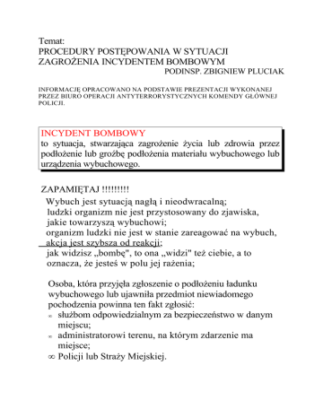 Temat: PROCEDURY POSTĘPOWANIA W SYTUACJI ZAGROŻENIA INCYDENTEM BOMBOWYM PODINSP. ZBIGNIEW PLUCIAK INFORMACJĘ OPRACOWANO NA PODSTAWIE PREZENTACJI WYKONANEJ PRZEZ BIURO OPERACJI ANTYTERRORYSTYCZNYCH KOMENDY GŁÓWNEJ POLICJI. INCYDENT BOMBOWY to sytuacja, stwarzająca zagrożenie życia lub zdrowia przez podłożenie lub groźbę podłożenia materiału wybuchowego lub urządzenia wybuchowego. ZAPAMIĘTAJ !!!!!!!!! Wybuch jest sytuacją nagłą i nieodwracalną; ludzki organizm nie jest przystosowany do zjawiska, jakie towarzyszą wybuchowi; organizm ludzki nie jest w stanie zareagować na wybuch, akcja jest szybsza od reakcji; jak widzisz „bombę", to ona „widzi" też ciebie, a to oznacza, że jesteś w polu jej rażenia; Osoba, która przyjęła zgłoszenie o podłożeniu ładunku wybuchowego lub ujawniła przedmiot niewiadomego pochodzenia powinna ten fakt zgłosić: • służbom odpowiedzialnym za bezpieczeństwo w danym miejscu; • administratorowi terenu, na którym zdarzenie ma miejsce; • Policji lub Straży Miejskiej. ZAWIADAMIAJĄC POLICJĘ NALEŻY PODAĆ NASTĘPUJĄCE INFORMACJE: • rodzaj zagrożenia i źródło informacji o zagrożeniu, • treść rozmowy z osobą informującą o podłożeniu ładunku wybuchowego, • numer telefonu, na który przekazano informacje o zagrożeniu oraz dokładny czas jej przyjęcia, • adres, numer telefonu i nazwisko osoby zgłaszającej, • opis miejsca i wygląd ujawnionego przedmiotu, Wskazane jest uzyskanie od Policji potwierdzenia przyjętego zgłoszenia. OGŁOSZENIE ALARMU BOMBOWEGO ORAZ PROCEDUTY POSTĘPOWANIA W CZASIE ZAGROŻENIA BOMBOWEGO. 1.Do czasu przybycia Policji akcją kieruje administrator obiektu, terenu lub osoba odpowiedzialna za jego bezpieczeństwo. 2.Na miejsce zagrożenia incydentem bombowym należy wezwać służby pomocnicze, takie jak: pogotowie ratunkowe, straż pożarną, pogotowie gazowe, pogotowie wodno- kanalizacyjne, pogotowie energetyczne. 3.Po przybyciu Policji na miejsce incydentu bombowego. przejmuje ona dalsze kierowanie akcją. 4. Należy bezwzględnie wykonywać polecenia policjantów. 5. Przy braku informacji o konkretnym miejscu podłożenia „bomby" użytkownicy pomieszczeń służbowych powinni sprawdzić swoje miejsce pracy i jego bezpośrednie otoczenie pod kątem obecności przedmiotów nieznanego pochodzenia. 6. Pomieszczenia ogólnodostępne (korytarze, klatki schodowe, windy, toalety, piwnice, strychy) oraz najbliższe otoczenie zewnętrzne obiektu sprawdzają i przeszukują osoby wyznaczone lub służby odpowiedzialne za bezpieczeństwo w danej instytucji. 7. Podejrzanych przedmiotów NIE WOLNO DOTYKAĆ! o ich lokalizacji należy powiadomić administratora oraz osoby odpowiedzialne za bezpieczeństwo. 8. Po ogłoszeniu ewakuacji należy zachować spokój i opanowanie, aby sprawnie i bezpiecznie opuścić zagrożony rejon. 9. Po ogłoszeniu ewakuacji w miejscu twojej pracy należy je opuścić, zabierając rzeczy osobiste (torebki, siatki. nesesery itp. ZAPAMIĘTAJ!!!!! Identyfikacją i rozpoznawaniem zlokalizowanego ładunku wybuchowego jego neutralizacją zajmują się uprawnione i wyspecjalizowane jednostki i komórki organizacyjne Policji. Jak powinieneś się zachować po otrzymaniu informacji o podłożeniu lub groźbie podłożenia bomby. • Podczas działań, związanych z neutralizacją bomby zastosuj się do wezwań Policji, • Ciekawość może być niebezpieczna -jak najszybciej oddal się z miejsca zagrożonego wybuchem. • Po ogłoszeniu alarmu i zarządzeniu ewakuacji w obiektach, terenie, niezwłocznie udaj się do wyjścia, wskazanego przez administratora budynku. • W przypadku włączenia parkingu dla pojazdów w strefę zagrożenia, nie „ratuj" na siłę swojego samochodu – życie jest ważniejsze. INSTRUKCJA ALARMOWA W PRZYPADKU ZGŁOSZENIA O PODŁOŻENIU LUB UJAWNIENIU URZADZENIA WYBUCHOWEGO. ALARMOWANIE 1. Osoba, która przyjęła zgłoszenie o podłożeniu urządzenia wybuchowego, tub ujawniła w obiekcie przedmiot niewiadomego pochodzenia mogący być urządzeniem wybuchowym jest zobowiązana natychmiast powiadomić: • administratora danego obiektu lub terenu • służby ochrony obiektu • Policję (telefony alarmowe 997 kom. 112) Zawiadamiając Policję należy podać następujące informacje: • czas, miejsce, treść rozmowy ze zgłaszającym o podłożeniu urządzenia wybuchowego (bomby), • miejsce i opis zlokalizowanego przedmiotu, który może być urządzeniem wybuchowym (bombą), • swoje nazwisko i numer telefonu, z którego prowadzone jest rozmowa, • uzyskać od Policji potwierdzenie przyjęcia powyższego zawiadomienia. Akcja poszukiwawcza urządzenia wybuchowego (bomby) po uzyskaniu informacji o jej podłożeniu. 1. Do czasu przybycia Policji akcją kieruje administrator lub osoba przez niego wyznaczona. 2.Kierujący akcją zarządza natychmiastową ewakuację osób postronnych. 3.Użytkownicy pomieszczeń obowiązani są do sprawdzenia swojego otoczenia i pomieszczeń ze zwróceniem szczególnej uwagi na: - przedmioty, rzeczy, urządzenia, paczki itp., których wcześniej nie było a mogły być pozostawione lub podrzucone, - ślady przemieszczania elementów wyposażenia pomieszczeń, - zmiany w wyglądzie zewnętrznym przedmiotów, rzeczy, urządzeń oraz emitowanie z nich sygnały (np. dźwięki mechanizmów zegarowych, syczenie, - wydobywający się zapach, świecenie elementów elektronicznych). 4. Pomieszczenia ogólnie dostępne takie jak: korytarze, klatki schodowe, windy, toalety, piwnice, strych oraz najbliższe otoczenie zewnętrzne budynku przeszukują osoby wyznaczone lub służby ochrony obiektu. 5. Zlokalizowanych podejrzanych przedmiotów NIE WOLNO DOTYKAĆ!! 6. W przypadku zlokalizowania domniemanego urządzenia wybuchowego „bomby" kierujący akcją może wydać decyzję ewakuacji osób (do wyznaczonego miejsca). 7. Podczas ewakuacji należy zachować spokój i opanowanie, oby nie dopuścić do przejawów pa