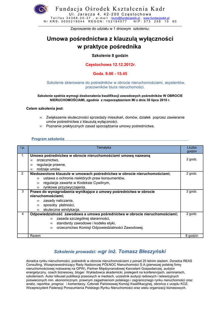 Fundacja Ośrodek Kształcenia Kadr Ul. Jaracza 4, 42-200 Częstochowa T e l / f a x 3 4 3 6 8 - 2 0 - 3 7 , e - m a i l : [email protected] , www.fundacjaokk.pl Nr KRS: 0000219044 REGON: 152184077 NIP: 573 258 10 80 Zaproszenie do udziału w 1 dniowym szkoleniu: Umowa pośrednictwa z klauzulą wyłączności w praktyce pośrednika Szkolenie 8 godzin Częstochowa 12.12.2012r. Godz. 9.00 - 15.45 Szkolenie skierowane do pośredników w obrocie nieruchomościami, asystentów, pracowników biura nieruchomości. Szkolenie spełnia wymogi doskonalenia kwalifikacji zawodowych pośredników W OBROCIE NIERUCHOMOŚCIAMI, zgodnie z rozporządzeniem MI z dnia 30 lipca 2010 r. Celem szkolenia jest: • • Zwiększenie skuteczności sprzedaży mieszkań, domów, działek poprzez zawieranie umów pośrednictwa z klauzulą wyłączności. Poznanie praktycznych zasad sporządzania umowy pośrednictwa. Program szkolenia l.p. Tematyka 1. Umowa pośrednictwa w obrocie nieruchomościami umową nazwaną • orzecznictwo, • regulacje prawne, • rodzaje umów. Niedozwolone klauzule w umowach pośrednictwa w obrocie nieruchomościami; • ustawa o ochronie niektórych praw konsumentów, • regulacje zawarte w Kodeksie Cywilnym, • rynkowe przyzwyczajenia. Prawo do wynagrodzenia wynikające z umowy pośrednictwa w obrocie nieruchomościami; • zasady naliczania, • sposoby płatności, • skuteczna windykacja. Odpowiedzialność zawodowa a umowa pośrednictwa w obrocie nieruchomościami; • zasada szczególnej staranności, • standardy zawodowe i kodeks etyki, • orzecznictwo Komisji Odpowiedzialności Zawodowej. 2 3 4 Razem Liczba godzin 2 godz. 2 godz. 2 godz. 2 godz. 8 godzin Szkolenie prowadzi: mgr inż. Tomasz Błeszyński doradca rynku nieruchomości, pośrednik w obrocie nieruchomościami z ponad 20 letnim stażem. Doradca REAS Consulting, Wiceprzewodniczący Rady Nadzorczej PÓŁNOC Nieruchomości S.A.(pierwszej polskiej firmy nieruchomościowej notowanej na GPW), Partner Międzynarodowej Kancelarii Gospodarczej, audytor energetyczny, coach biznesowy, bloger. Wykładowca akademicki, prelegent na konferencjach, seminariach, szkoleniach. Autor kilkuset publikacji prasowych w mediach, uczestnik audycji radiowych i telewizyjnych poświeconych min. ekonomicznym, prawnym zagadnieniom polskiego i zagranicznego rynku nieruchomości oraz analiz, raportów, prognoz i komentarzy. Członek Państwowej Komisji Kwalifikacyjnej, obrońca z urzędu KOZ, Wiceprezydent Federacji Porozumienia Polskiego Rynku Nieruchomości oraz wielu organizacji biznesowych. MIEJSCE SZKOLENIA Szkolenie odbędzie się w Częstochowie, ul. Jaracza 4, sala konferencyjna NR 3 II piętro. KOSZT SZKOLENIA: - 150 zł - absolwenci 120 zł - stali uczestnicy (min 3 szkolenia w roku) 120 zł W ramach udziału w szkoleniu zapewniamy: • Wykład i dyskusje • Materiały szkoleniowe • Serwis kawowy , poczęstunek • Zaświadczenie (w tym spełniające wymogi MI w ramach doskonalenia zawodowego) Zgłoszenia i wpłaty przyjmowane są najpóźniej na 5 dni przed szkoleniem (liczba miejsc ograniczona) 65 15001399 1213 9004 4123 0000 Informacje i zapisy: Fundacja Ośrodek Kształcenia Kadr ul. Jaracza 4 42-200 Częstochowa Tel/fax 034 368-20-37 e-mail [email protected] www.fundacjaokk.pl