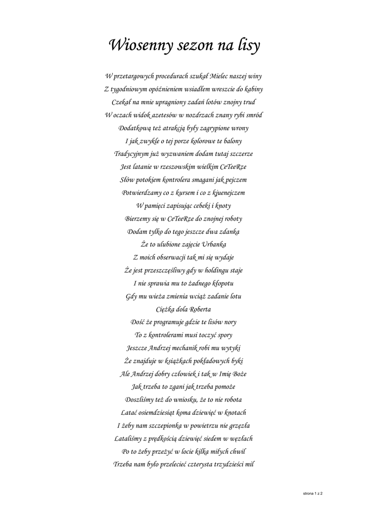 Wiosenny sezon na lisy W przetargowych procedurach szukał Mielec naszej winy Z tygodniowym opóźnieniem wsiadłem wreszcie do kabiny Czekał na mnie upragniony zadań lotów znojny trud W oczach widok azetesów w nozdrzach znany rybi smród Dodatkową też atrakcją były zagrypione wrony I jak zwykle o tej porze kolorowe te balony Tradycyjnym już wyzwaniem dodam tutaj szczerze Jest latanie w rzeszowskim wielkim CeTeeRze Słów potokiem kontrolera smagani jak pejczem Potwierdzamy co z kursem i co z kjuenejczem W pamięci zapisując cebeki i knoty Bierzemy się w CeTeeRze do znojnej roboty Dodam tylko do tego jeszcze dwa zdanka Że to ulubione zajęcie Urbanka Z moich obserwacji tak mi się wydaje Że jest przeszczęśliwy gdy w holdingu staje I nie sprawia mu to żadnego kłopotu Gdy mu wieża zmienia wciąż zadanie lotu Ciężka dola Roberta Dość że programuje gdzie te lisów nory To z kontrolerami musi toczyć spory Jeszcze Andrzej mechanik robi mu wytyki Że znajduje w książkach pokładowych byki Ale Andrzej dobry człowiek i tak w Imię Boże Jak trzeba to zgani jak trzeba pomoże Doszliśmy też do wniosku, że to nie robota Latać osiemdziesiąt koma dziewięć w knotach I żeby nam szczepionka w powietrzu nie grzęzła Lataliśmy z prędkością dziewięć siedem w węzłach Po to żeby przeżyć w locie kilka miłych chwil Trzeba nam było przelecieć czterysta trzydzieści mil strona 1 z 2 By lisom smakował lepiej chłopski drób Rzucaliśmy im szczepionkę z trzech tysięcy stóp Lecz wścieklizną zagrożone zmartwiły się lisy Bo na drodze do ich szczęścia stanęły przepisy Zmartwieniem dla lisów była sporna sprawa Między szefem akcji a strażnikiem prawa Po niezwykle trudnych z ULCem negocjacjach Strony pozostały przy swych słusznych racjach Znaleziono na to rozwiązanie wreszcie Rozdzielając zięcia z jego własnym teściem Rozstrzygnięto wreszcie to krakowskim targiem Michał wziął do „LIMY” Piotrka Robert wziął do „ROMKA” Vargę A lisy zdarły z uciechy ogony Jedząc pasztet po węgiersku ostro przyprawiony Wymienić korzyści wszystkich nie potrafię Kiedy się rozbija prorodzinną mafię Niech kto mądry więcej na ten temat powie Żyje przyjaźń z Węgrami i lisom na zdrowie Że w lotnictwie nigdy za dużo nauki Stasiu Czaja demonstrował swoje agro sztuki Wracając do lotniska po swojej robocie Lądował na ful klapach po niskim przewrocie Kiedy chciałem powtórzyć to z Bożeną w parze Stwierdziłem, że chyba potem to pokażę Dla tych co znają Staszka anegdotę Nie jest tajemnicą co pokażę potem A wszystkim, którym wiersz ten nie wydał się trudny Jest jasne, że sezon na lis tej wiosny był nudny To już nie to samo jak zapewne wiecie Co na wiosnę w tamtym roku w jednym locie z Mieciem Marek Włoch, Krosno 2006 strona 2 z 2