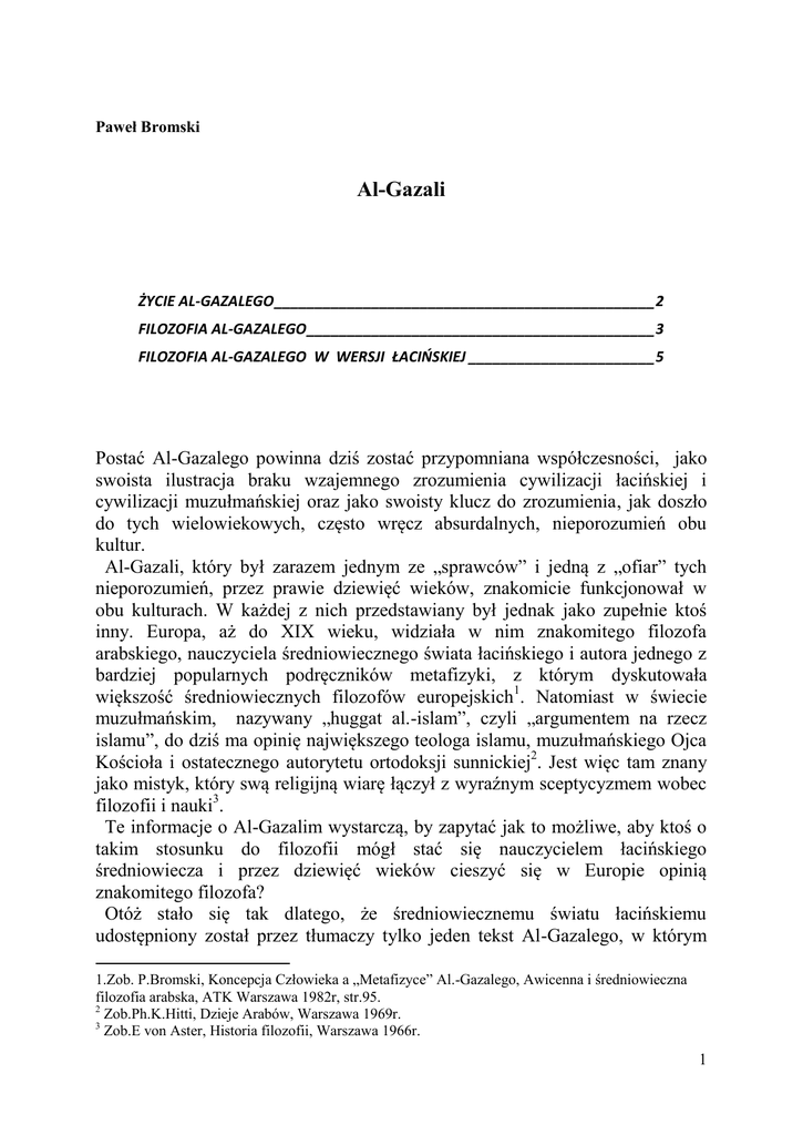 Paweł Bromski Al-Gazali ŻYCIE AL-GAZALEGO _______________________________________________ 2 FILOZOFIA AL-GAZALEGO ___________________________________________ 3 FILOZOFIA AL-GAZALEGO W WERSJI ŁACIŃSKIEJ _______________________ 5 Postać Al-Gazalego powinna dziś zostać przypomniana współczesności, jako swoista ilustracja braku wzajemnego zrozumienia cywilizacji łacińskiej i cywilizacji muzułmańskiej oraz jako swoisty klucz do zrozumienia, jak doszło do tych wielowiekowych, często wręcz absurdalnych, nieporozumień obu kultur. Al-Gazali, który był zarazem jednym ze „sprawców” i jedną z „ofiar” tych nieporozumień, przez prawie dziewięć wieków, znakomicie funkcjonował w obu kulturach. W każdej z nich przedstawiany był jednak jako zupełnie ktoś inny. Europa, aż do XIX wieku, widziała w nim znakomitego filozofa arabskiego, nauczyciela średniowiecznego świata łacińskiego i autora jednego z bardziej popularnych podręczników metafizyki, z którym dyskutowała większość średniowiecznych filozofów europejskich1. Natomiast w świecie muzułmańskim, nazywany „huggat al.-islam”, czyli „argumentem na rzecz islamu”, do dziś ma opinię największego teologa islamu, muzułmańskiego Ojca Kościoła i ostatecznego autorytetu ortodoksji sunnickiej2. Jest więc tam znany jako mistyk, który swą religijną wiarę łączył z wyraźnym sceptycyzmem wobec filozofii i nauki3. Te informacje o Al-Gazalim wystarczą, by zapytać jak to możliwe, aby ktoś o takim stosunku do filozofii mógł stać się nauczycielem łacińskiego średniowiecza i przez dziewięć wieków cieszyć się w Europie opinią znakomitego filozofa? Otóż stało się tak dlatego, że średniowiecznemu światu łacińskiemu udostępniony został przez tłumaczy tylko jeden tekst Al-Gazalego, w którym 1.Zob. P.Bromski, Koncepcja Człowieka a „Metafizyce” Al.-Gazalego, Awicenna i średniowieczna filozofia arabska, ATK Warszawa 1982r, str.95. 2 Zob.Ph.K.Hitti, Dzieje Arabów, Warszawa 1969r. 3 Zob.E von Aster, Historia filozofii, Warszawa 1966r. 1 wyłożył doktryny filozoficzne Al-Farabiego, Awicenny i Awerroesa. Prawdopodobnie, był to traktat zatytułowany „Cele filozofów”, przełożony na język łaciński w XII wieku przez Dominika Gundissalvi i Jana Hiszpana w Toledo. W wersji łacińskiej tekst ten składał się z trzech części, z Logiki, Fizyki i Metafizyki 4, z których ostatnia przetrwała do naszych czasów i znajduje się obecnie w Archiwum Watykańskim pod numerem 4481. Ten jedyny, znany światu łacińskiemu, tekst Al-Gazalego był częścią większego traktatu, w którym ten mistyk i agnostyk chciał się z filozofią rozprawić. Jednak, aby filozofię ostatecznie zwalczyć, musiał najpierw streścić znane sobie poglądy filozoficzne. To streszczenie właśnie, jako wykład filozofii, tak spodobało się łacińskim tłumaczom w Toledo, że przetłumaczyli je na łacinę, nie interesując się zupełnie drugą częścią traktatu. W ten sposób, na prawie dziewięć wieków, Al-Gazali stał się nauczycielem scholastycznej Europy i filozofem „mimo woli”. Kiedy więc dwadzieścia pięć lat temu, jeszcze jako student filozofii i członek grupy, która, pod kierownictwem profesora M. Gogacza, rozpoczęła prace badawcze nad średniowiecznymi tekstami filozofów arabskich i gdy do własnych analiz wybrałem teksty Al-Gazalego, nie spodziewałem się, że po upływie tylu lat przyjdzie mi zobaczyć w tym autorze symbol niemożności wzajemnego zrozumienia obu kultur i religii, w kontekście klęski, zarówno muzułmanów jak i chrześcijan, w dniu 11 września 2001 roku. Z perspektywy Europy jawi się więc Al-Gazali jako postać dwuznaczna. Jako myśliciel, który najpierw nie zrozumiał antycznej kultury europejskiej, mieszając poglądy Platona z poglądami Arystotelesa oraz jako ten, który potem sam nie został zrozumiany przez średniowieczną Europę, chociaż wbrew prawdziwemu sobie, położył ogromne zasługi w jej rozwoju intelektualnym. ŻYCIE AL-GAZALEGO 5 Abu Hamid Muhammad Ibn Muhammad Ibn Muhammad Ibn Ahmad Al-Gazali, wśród muzułmanów otoczony jest powszechnym szacunkiem. Uważany jest za jednego z najwybitniejszych Arabów, jacy kiedykolwiek żyli. Urodził się w Tusie w Hurasanie w roku 1058. Tam rozpoczął studia pod kierunkiem Ar-Radkaniego, które kontynuował w Gurganie, gdzie jego nauczycielem był Abu Al-Qasim Al-Ismaili. Tam powstało jego pierwsze dzieło, komentarz o rodzajach szkół prawnych, które niestety nie przetrwało do naszych czasów. Około 1080 roku, Al-Gazali przeniósł się do Nisaburu, gdzie kształcił się dalej, pod kierunkiem Abu Al-Maali Al-Guwayniego, w szkole założonej przez wezyra seldżuckiego. Uczył się tam kalamu, logiki i filozofii. W 1085 r., po śmierci swojego nauczyciela, Al-Gazali związał się z Nizamem AlMulkiem, słynnym wezyrem sułtanów seldżuckich. Umieścił on Al-Gazalego na 4 5 Zob.E.Gilson,Historia filozofii chrześcijańskiej w wiekach średnich, Warszawa 1966, str. 214,234. Wg. Katarzyna Pachniak, Filozofia polityki muzułmańskiej, W.A.Dialog, W-wa 2001, str.13 2 swym dworze i powierzył mu stanowisko w utworzonej przez siebie uczelni w Bagdadzie. Al-Gazali, w latach 1091 – 1095, wykładał tam teologię i prawo. Właśnie w Bagdadzie powstały jego trzy wielkie dzieła poświęcone doktrynie sufizmu: „Basit”, „Wasit” i „Wagiz”. Także w Bagdadzie Al-Gazali napisał traktat teologiczno-polityczny, pt.”Oszczędne przedstawienie zasad wiary” oraz kilka traktatów poświęconych filozofii, w których w sposób bezwzględny podporządkowywał filozofię teologii, warunkując sens uprawiania filozofii jej służebnością wobec teologii. Koncepcję tę przedstawił najwyraźniej w traktacie „Tahafut al.-falasifa /Rozproszenie filozofów/, datowanym na 1095 rok. Po 1092 roku, Al-Gazali zwrócił się ku mistycyzmowi i w 1095 roku podjął decyzje o całko