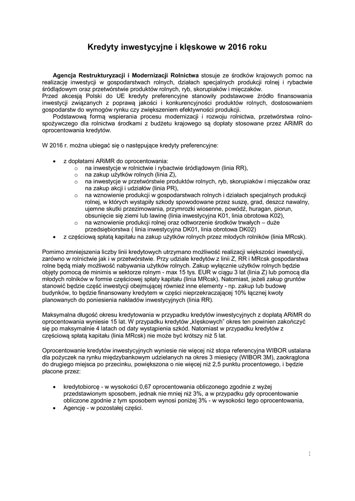 Kredyty inwestycyjne i kl skowe w 2016 roku Agencja Restrukturyzacji i Modernizacji Rolnictwa stosuje ze rodków krajowych pomoc na realizacj inwestycji w gospodarstwach rolnych, dzia ach specjalnych produkcji rolnej i rybactwie ródl dowym oraz przetwórstwie produktów rolnych, ryb, skorupiaków i mi czaków. Przed akcesj Polski do UE kredyty preferencyjne stanowi y podstawowe ród o finansowania inwestycji zwi zanych z popraw jako ci i konkurencyjno ci produktów rolnych, dostosowaniem gospodarstw do wymogów rynku czy zwi kszeniem efektywno ci produkcji. Podstawow form wspierania procesu modernizacji i rozwoju rolnictwa, przetwórstwa rolnospo ywczego dla rolnictwa rodkami z bud etu krajowego s dop aty stosowane przez ARiMR do oprocentowania kredytów. W 2016 r. mo na ubiega si o nast puj ce kredyty preferencyjne: z dop atami ARiMR do oprocentowania: o na inwestycje w rolnictwie i rybactwie ródl dowym (linia RR), o na zakup u ytków rolnych (linia Z), o na inwestycje w przetwórstwie produktów rolnych, ryb, skorupiaków i mi czaków oraz na zakup akcji i udzia ów (linia PR), o na wznowienie produkcji w gospodarstwach rolnych i dzia ach specjalnych produkcji rolnej, w których wyst pi y szkody spowodowane przez susz , grad, deszcz nawalny, ujemne skutki przezimowania, przymrozki wiosenne, powód , huragan, piorun, obsuni cie si ziemi lub lawin (linia inwestycyjna K01, linia obrotowa K02), o na wznowienie produkcji rolnej oraz odtworzenie rodków trwa ych – du e przedsi biorstwa ( linia inwestycyjna DK01, linia obrotowa DK02) z cz ciow sp at kapita u na zakup u ytków rolnych przez m odych rolników (linia MRcsk). Pomimo zmniejszenia liczby linii kredytowych utrzymano mo liwo realizacji wi kszo ci inwestycji, zarówno w rolnictwie jak i w przetwórstwie. Przy udziale kredytów z linii Z, RR i MRcsk gospodarstwa rolne b mia y mo liwo nabywania u ytków rolnych. Zakup wy cznie u ytków rolnych b dzie obj ty pomoc de minimis w sektorze rolnym - max 15 tys. EUR w ci gu 3 lat (linia Z) lub pomoc dla odych rolników w formie cz ciowej sp aty kapita u (linia MRcsk). Natomiast, je eli zakup gruntów stanowi b dzie cz inwestycji obejmuj cej równie inne elementy - np. zakup lub budow budynków, to b dzie finansowany kredytem w cz ci nieprzekraczaj cej 10% cznej kwoty planowanych do poniesienia nak adów inwestycyjnych (linia RR). Maksymalna d ugo okresu kredytowania w przypadku kredytów inwestycyjnych z dop at ARiMR do oprocentowania wyniesie 15 lat. W przypadku kredytów „kl skowych” okres ten powinien zako czy si po maksymalnie 4 latach od daty wyst pienia szkód. Natomiast w przypadku kredytów z cz ciow sp at kapita u (linia MRcsk) nie mo e by krótszy ni 5 lat. Oprocentowanie kredytów inwestycyjnych wyniesie nie wi cej ni stopa referencyjna WIBOR ustalana dla po yczek na rynku mi dzybankowym udzielanych na okres 3 miesi cy (WIBOR 3M), zaokr glona do drugiego miejsca po przecinku, powi kszona o nie wi cej ni 2,5 punktu procentowego, i b dzie acone przez: kredytobiorc - w wysoko ci 0,67 oprocentowania obliczonego zgodnie z wy ej przedstawionym sposobem, jednak nie mniej ni 3%, a w przypadku gdy oprocentowanie obliczone zgodnie z tym sposobem wynosi poni ej 3% - w wysoko ci tego oprocentowania, Agencj - w pozosta ej cz ci. 1 Natomiast w przypadku kredytów "kl skowych" b dzie p acone przez: kredytobiorc - w wysoko ci: o 0,5 oprocentowania ustalonego w sposób omówiony powy ej, jednak nie mniej ni 1,5% - w przypadku kredytów na sfinansowanie kosztów wznowienia produkcji, je eli w dniu wyst pienia tych szkód co najmniej 50% powierzchni upraw rolnych, z wy czeniem k i pastwisk, lub co najmniej 50% liczby zwierz t gospodarskich w gospodarstwie rolnym lub dziale specjalnym produkcji rolnej by o ubezpieczonych co najmniej od jednego z ryzyk, o 0,67 oprocentowania ustalonego w sposób omówiony powy ej, jednak nie mniej ni 3%, a gdy oprocentowanie obliczone zgodnie z tym sposobem wynosi poni ej 3%, w wysoko ci tego oprocentowania - w przypadku kredytów na sfinansowanie kosztów odtworzenia rodków trwa ych po wyst pieniu szkód, Agencj - w pozosta ej cz ci. Je eli w dniu wyst pienia szkód nie by o stosownej umowy ubezpieczenia, to wysoko oprocentowania kredytu „kl skowego” p aconego przez kredytobiorc b dzie stanowi a ró nic pomi dzy wysoko ci nale nego bankowi oprocentowania i wysoko ci po owy oprocentowania aconego przez Agencj . Szczegó owe informacje o liniach kredytowych mo na uzyska w naszej broszurze „ Kredyty preferencyjne w rolnictwie, przetwórstwie produktów rolnych, przetwórstwie ryb, skorupiaków i mi czaków oraz w rybactwie ródl dowym” oraz na stronie internetowej: www.arimr.gov.pl w zak adce Pomoc krajowa. 2 Oprocentowanie kredytów inwestycyjnych i kl skowych udzielanych przez Banki obowi zuj ce w okresie 01.10.2016r. – 31.12.2016r. (wysoko WIBOR – 1,71%, wg stawki z dnia 31.08.2016 r.) Oprocentowanie p acone bankowi przez kredytobiorc w liniach kredytowych: L.p. Bank Mar a Oprocentowanie K02 Banku 1 RR, Z, PR K01 Ubezpieczeni Nieubezpieczeni Bank Polskiej Spó dzielczo ci SA 2,50 4,2100 3,00 3,00 2,1050 3,1575 2 SGB-Bank SA 2,50 4,2100 3,00 3,00 2,1050 3,1575 3 Krakowski Bank Spó dzielczy 2,50 4,2100 3,00 3,00 2,1050 3,1575 4 Bank BG BNP Paribas SA 2,48 4,1900 3,00 3,00 2,0950 3,1425 5 Raiffeisen Bank Polska SA 2,30 4,0100 3,00 3,00 2,0050 3,0075 6 Bank Zachodni WBK SA 1,95 3,6600 3,00 3,00 1,8300 2,7450 7 Pekao SA 1,80 3,5100 3,00 3,00 1,7550 2,6325 Oznaczenia symboli linii kredytowych: RR ZPR K01 K02 - kredyty na inwestycje w rolnictwie i w rybactwie ródl dowym kredyty na zakup u ytków rolnych kredyty na inwestycje w przetwórstwie produktów rolnych, ryb, skorupiaków i mi czaków oraz na zakup akcji lub udzia ów kredyty kl skowe inwestycyjne kredyty kl skowe obrotowe 3 4