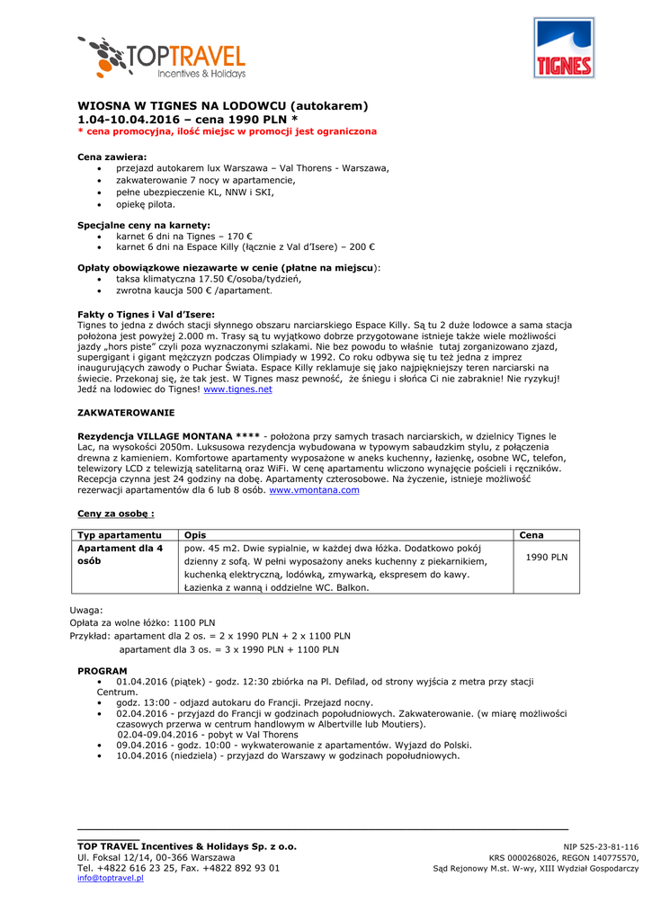 WIOSNA W TIGNES NA LODOWCU (autokarem) 1.04-10.04.2016 – cena 1990 PLN * * cena promocyjna, ilość miejsc w promocji jest ograniczona Cena zawiera: przejazd autokarem lux Warszawa – Val Thorens - Warszawa, zakwaterowanie 7 nocy w apartamencie, pełne ubezpieczenie KL, NNW i SKI, opiekę pilota. Specjalne ceny na karnety: karnet 6 dni na Tignes – 170 € karnet 6 dni na Espace Killy (łącznie z Val d’Isere) – 200 € Opłaty obowiązkowe niezawarte w cenie (płatne na miejscu): taksa klimatyczna 17.50 €/osoba/tydzień, zwrotna kaucja 500 € /apartament. Fakty o Tignes i Val d’Isere: Tignes to jedna z dwóch stacji słynnego obszaru narciarskiego Espace Killy. Są tu 2 duże lodowce a sama stacja położona jest powyżej 2.000 m. Trasy są tu wyjątkowo dobrze przygotowane istnieje także wiele możliwości jazdy „hors piste” czyli poza wyznaczonymi szlakami. Nie bez powodu to właśnie tutaj zorganizowano zjazd, supergigant i gigant mężczyzn podczas Olimpiady w 1992. Co roku odbywa się tu też jedna z imprez inaugurujących zawody o Puchar Świata. Espace Killy reklamuje się jako najpiękniejszy teren narciarski na świecie. Przekonaj się, że tak jest. W Tignes masz pewność, że śniegu i słońca Ci nie zabraknie! Nie ryzykuj! Jedź na lodowiec do Tignes! www.tignes.net ZAKWATEROWANIE Rezydencja VILLAGE MONTANA **** - położona przy samych trasach narciarskich, w dzielnicy Tignes le Lac, na wysokości 2050m. Luksusowa rezydencja wybudowana w typowym sabaudzkim stylu, z połączenia drewna z kamieniem. Komfortowe apartamenty wyposażone w aneks kuchenny, łazienkę, osobne WC, telefon, telewizory LCD z telewizją satelitarną oraz WiFi. W cenę apartamentu wliczono wynajęcie pościeli i ręczników. Recepcja czynna jest 24 godziny na dobę. Apartamenty czterosobowe. Na życzenie, istnieje możliwość rezerwacji apartamentów dla 6 lub 8 osób. www.vmontana.com Ceny za osobę : Typ apartamentu Apartament dla 4 osób Opis pow. 45 m2. Dwie sypialnie, w każdej dwa łóżka. Dodatkowo pokój dzienny z sofą. W pełni wyposażony aneks kuchenny z piekarnikiem, kuchenką elektryczną, lodówką, zmywarką, ekspresem do kawy. Łazienka z wanną i oddzielne WC. Balkon. Cena 1990 PLN Uwaga: Opłata za wolne łóżko: 1100 PLN Przykład: apartament dla 2 os. = 2 x 1990 PLN + 2 x 1100 PLN apartament dla 3 os. = 3 x 1990 PLN + 1100 PLN PROGRAM • 01.04.2016 (piątek) - godz. 12:30 zbiórka na Pl. Defilad, od strony wyjścia z metra przy stacji Centrum. • godz. 13:00 - odjazd autokaru do Francji. Przejazd nocny. • 02.04.2016 - przyjazd do Francji w godzinach popołudniowych. Zakwaterowanie. (w miarę możliwości czasowych przerwa w centrum handlowym w Albertville lub Moutiers). 02.04-09.04.2016 - pobyt w Val Thorens • 09.04.2016 - godz. 10:00 - wykwaterowanie z apartamentów. Wyjazd do Polski. • 10.04.2016 (niedziela) - przyjazd do Warszawy w godzinach popołudniowych. _______________________________________________________________________________ __________ TOP TRAVEL Incentives & Holidays Sp. z o.o. NIP 525-23-81-116 Ul. Foksal 12/14, 00-366 Warszawa KRS 0000268026, REGON 140775570, Tel. +4822 616 23 25, Fax. +4822 892 93 01 Sąd Rejonowy M.st. W-wy, XIII Wydział Gospodarczy [email protected] Fakty o Espace Killy: 2 lodowce: La Grande Motte w Tignes (całoroczny) i Le Pissaillas w Val d'Isere różnica poziomów: 1850-3650 m.n.p.m. 300 km tras narciarskich (68 niebieskich, 39 czerwonych, 26 czarnych) 2 snowparki, w tym największy w Europie snowpark na lodowcu 10 000 ha „off pistes” czyli jazda poza trasami 635 armatki śnieżne 44 km tras biegowych Informacje o stacji na www.tignes.net _______________________________________________________________________________ __________ TOP TRAVEL Incentives & Holidays Sp. z o.o. NIP 525-23-81-116 Ul. Foksal 12/14, 00-366 Warszawa KRS 0000268026, REGON 140775570, Tel. +4822 616 23 25, Fax. +4822 892 93 01 Sąd Rejonowy M.st. W-wy, XIII Wydział Gospodarczy [email protected]
