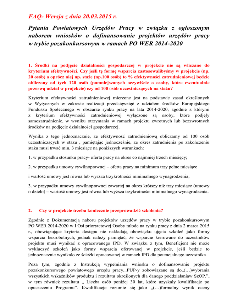 FAQ- Wersja z dnia 20.03.2015 r. Pytania Powiatowych Urzędów Pracy w związku z ogłoszonym naborem wniosków o dofinansowanie projektów urzędów pracy w trybie pozakonkursowym w ramach PO WER 2014-2020 1. Środki na podjęcie działalności gospodarczej w projekcie nie są wliczane do kryterium efektywności. Czy jeśli tę formę wsparcia zastosowalibyśmy w projekcie (np. 20 osób) a oprócz niej np. staże (np.100 osób) to % efektywności zatrudnieniowej będzie obliczony od tych 120 osób (pomniejszonych oczywiście o osoby, które ewentualnie przerwą udział w projekcie) czy od 100 osób uczestniczących na stażu? Kryterium efektywności zatrudnieniowej mierzone jest na podstawie zasad określonych w Wytycznych w zakresie realizacji przedsięwzięć z udziałem środków Europejskiego Funduszu Społecznego w obszarze rynku pracy na lata 2014-2020, zgodnie z którymi z kryterium efektywności zatrudnieniowej wyłączone są osoby, które podjęły samozatrudnienie, w wyniku otrzymania w ramach projektu zwrotnych lub bezzwrotnych środków na podjęcie działalności gospodarczej. Wynika z tego jednoznacznie, że efektywność zatrudnieniową obliczamy od 100 osób uczestniczących w stażu , pamiętając jednocześnie, że okres zatrudnienia po zakończeniu stażu musi trwać min. 3 miesiące na poniższych warunkach: 1. w przypadku stosunku pracy- oferta pracy na okres co najmniej trzech miesięcy; 2. w przypadku umowy cywilnoprawnej – oferta pracy na minimum trzy pełne miesiące i wartość umowy jest równa lub wyższa trzykrotności minimalnego wynagrodzenia; 3. w przypadku umowy cywilnoprawnej zawartej na okres krótszy niż trzy miesiące (umowy o dzieło) – wartość umowy jest równa lub wyższa trzykrotności minimalnego wynagrodzenia. 2. Czy w projekcie trzeba koniecznie przeprowadzić szkolenia? Zgodnie z Dokumentacją naboru projektów urzędów pracy w trybie pozakonkursowym PO WER 2014-2020 w I Osi priorytetowej Osoby młode na rynku pracy z dnia 2 marca 2015 r., obowiązujące kryteria dostępu nie nakładają obowiązku ujęcia szkoleń jako formy wsparcia bezrobotnych, jednak należy pamiętać, że wsparcie kierowane do uczestników projektu musi wynikać z opracowanego IPD. W związku z tym, Beneficjent nie może wykluczyć szkoleń jako formy wsparcia oferowanej w projekcie, jeśli będzie to jednoznacznie wynikało ze ścieżki opracowanej w ramach IPD dla potencjalnego uczestnika. Poza tym, zgodnie z Instrukcją wypełniania wniosku o dofinansowanie projektu pozakonkursowego powiatowego urzędu pracy...PUP-y zobowiązane są do„(…)wybrania wszystkich wskaźników produktu i rezultatu określonych dla danego poddziałaniaw SzOP.”, w tym również rezultatu „ Liczba osób poniżej 30 lat, które uzyskały kwalifikacje po opuszczeniu Programu”. Kwalifikacje rozumie się jako „(…)formalny wynik oceny i walidacji, który uzyskuje się w sytuacji, kiedy właściwy organ uznaje, że dana osoba osiągnęła efekty uczenia się spełniające określone standardy”. W związku z tym istnieje obligo do ujęcia szkoleń w projekcie. WUP w tym roku nie narzuca udziału procentowego osób objętych tą formą wsparcia, co nie znaczy, że w kolejnych latach nie będzie to praktykowane. 3. Czy umowa o dofinansowanie projektu będzie podpisana na rok 2015 czy od razu na cały okres realizacji projektu? Zgodnie z dokumentacją naboru projektów urzędów pracy w trybie pozakonkursowym PO WER 2014-2020 projekt realizowany jest od 1 stycznia 2015 r. – 31 grudnia 2015 r. W związku z powyższym umowa podpisywana jest na okres realizacji projektu w danym roku tj. od 1 stycznia 2015r. do 31 grudnia 2015r. 4. W projekcie można zatrudnić w ramach kosztów pośrednich (do 3% kosztów bezpośrednich projektu) osobę do zarządzania projektem. Czy ta osoba będzie mogła kontynuować zatrudnienie w kolejnych latach realizacji projektu? W trakcie konsultacji- Zapytanie w tej sprawie zostało skierowane do MIiR w dniu 18.03.2015 r., po uzyskaniu odpowiedzi interpretacja zostanie przesłana do PUP. 5. Czy aby wypłacić wynagrodzenie z kosztów pośrednich (3%) to można tego dokonać tylko wtedy, gdy zostały poniesione w danym miesiącu, wydatki z kosztów bezpośrednich. Czy wydatki w ramach kosztów pośrednich można ponosić tylko do 3% wydatków w danym miesiącu? W przypadku projektów pozakonkursowych PUP, koszty pośrednie to koszty administracyjne związane z zarządzaniem projektem, o których mowa w art. 9 ust. 2 d ustawy o promocji zatrudnienia (…).Wnioskodawca nie ma możliwości wykazania żadnej z kategorii kosztów pośrednich ujętych w ww. art. ustawy o promocji zatrudnienia (…) w kosztach bezpośrednich projektu. W tej części wnioskodawca wpisuje w polu % kosztów pośrednich w ramach projektu, jaki planuje przeznaczyć na zarządzanie/obsługę projektu; przy czym zgodnie z art. 9 ust. 2d ustawy o promocji zatrudnienia (…) koszty te nie mogą stanowić więcej niż 3% kwoty przyznanej ze środków Funduszu Pracy będących w dyspozycji samorządu województwa na realizację projektu. System sam wylicza na podstawie określonej wartości procentowej, wartość w złotych w ramach projektu jaka będzie przeznaczana na koszty pośrednie. W związku z tym, iż Beneficjent konstruuje założenia budżetowe na cały rok realizacji projektu, koszty pośrednie wyliczane są w skali całego roku. Beneficjent sam decyduje, jak będzie wydatkował w danym miesiącu koszty pośrednie, niezależnie od wydatków poniesionych w danym miesiącu z kosztów bezpośrednich. Suma poniesionych kosztów pośrednich w skali całego roku, musi być tożsama z wartością kosztów pośrednich wskazanych we wniosku o dofinansowanie projektu. 6. Czy osoby o niskich kwalifikacjach to osoby z wykształceniem średnim i niższym czy niższym niż średnie? Osoby o niskich kwalifikacjach – osoby posiadające wykształcenie na poziomie do ISCED 3 (Międzynarodo