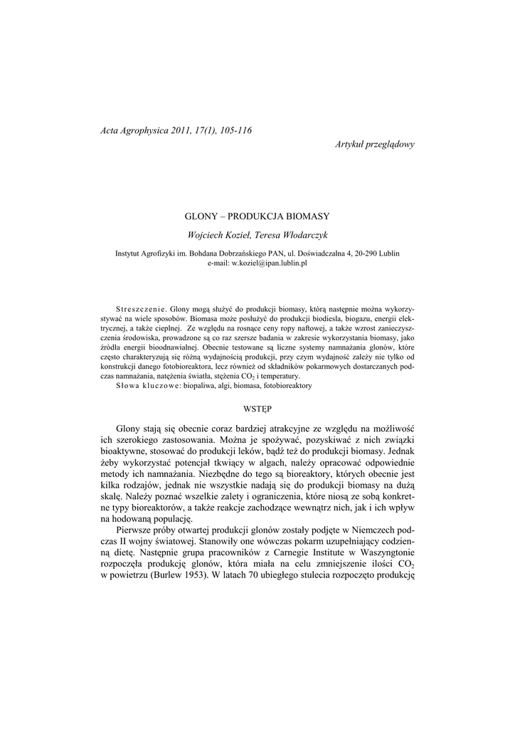 Acta Agrophysica 2011, 17(1), 105-116 Artykuł przeglądowy GLONY – PRODUKCJA BIOMASY Wojciech Kozieł, Teresa Włodarczyk Instytut Agrofizyki im. Bohdana Dobrzańskiego PAN, ul. Doświadczalna 4, 20-290 Lublin e-mail: [email protected] S t r e s z c z e n i e . Glony mogą słuŜyć do produkcji biomasy, którą następnie moŜna wykorzystywać na wiele sposobów. Biomasa moŜe posłuŜyć do produkcji biodiesla, biogazu, energii elektrycznej, a takŜe cieplnej. Ze względu na rosnące ceny ropy naftowej, a takŜe wzrost zanieczyszczenia środowiska, prowadzone są co raz szersze badania w zakresie wykorzystania biomasy, jako źródła energii bioodnawialnej. Obecnie testowane są liczne systemy namnaŜania glonów, które często charakteryzują się róŜną wydajnością produkcji, przy czym wydajność zaleŜy nie tylko od konstrukcji danego fotobioreaktora, lecz równieŜ od składników pokarmowych dostarczanych podczas namnaŜania, natęŜenia światła, stęŜenia CO2 i temperatury. S ł o wa k l u c z o w e : biopaliwa, algi, biomasa, fotobioreaktory WSTĘP Glony stają się obecnie coraz bardziej atrakcyjne ze względu na moŜliwość ich szerokiego zastosowania. MoŜna je spoŜywać, pozyskiwać z nich związki bioaktywne, stosować do produkcji leków, bądź teŜ do produkcji biomasy. Jednak Ŝeby wykorzystać potencjał tkwiący w algach, naleŜy opracować odpowiednie metody ich namnaŜania. Niezbędne do tego są bioreaktory, których obecnie jest kilka rodzajów, jednak nie wszystkie nadają się do produkcji biomasy na duŜą skalę. NaleŜy poznać wszelkie zalety i ograniczenia, które niosą ze sobą konkretne typy bioreaktorów, a takŜe reakcje zachodzące wewnątrz nich, jak i ich wpływ na hodowaną populację. Pierwsze próby otwartej produkcji glonów zostały podjęte w Niemczech podczas II wojny światowej. Stanowiły one wówczas pokarm uzupełniający codzienną dietę. Następnie grupa pracowników z Carnegie Institute w Waszyngtonie rozpoczęła produkcję glonów, która miała na celu zmniejszenie ilości CO2 w powietrzu (Burlew 1953). W latach 70 ubiegłego stulecia rozpoczęto produkcję 106 W. KOZIEŁ, T. WŁODARCZYK glonów w Europie Wschodniej, Izraelu oraz Japonii. Miała ona charakter komercyjny, hodowane algi były sprzedawane jako zdrowa Ŝywność. USA jako pierwszy kraj wykorzystały otwarty staw hodowlany jako oczyszczalnię ścieków. Pozyskaną w ten sposób biomasę zuŜyto do produkcji metanu, który wykorzystywano następnie jako źródło energii (Burlew 1953, Oswald i Golueke 1960). Obecnie algi namnaŜane są w systemach otwartych (stawy hodowlane) lub zamkniętych (fotobioreaktory). Wraz z upływem czasu znaczenie glonów wzrastało, rozpoczęto produkcję chemikaliów z alg, charakteryzujących się wysoką czystością (Lorenz i Cysewski 2003, Borowitzka 1999), które mogą stanowić uŜyteczny składnik diety zarówno dla ludzi, jak i zwierząt (Dallaire i in. 2007). Obecnie wykorzystywane są takŜe do produkcji pewnych związków pozakomórkowych, jako systemy immobilizacyjne (Chetsumon i in. 1994), jako sorbenty metali cięŜkich (Wilde i Benemann 1993, Lodeiro i in. 2005, Karthikeyan i in. 2007), a ponadto posiadają zdolność wiązania CO2 (Benemann 1997, Sung i in. 1999, Chae i in. 2006). ZNACZENIE GLONÓW DLA EKOSYSTEMU I GOSPODARKI W przyrodzie glony stanowią istotny element ekosystemu, poniewaŜ: • stanowią pokarm dla innych organizmów, • są praktycznie jedynymi producentami materii organicznej w wodach, • posiadają decydujący wpływ na klimat Ziemi ( wzbogacanie zbiorników wodnych w tlen), • regulują dostęp światła słonecznego dla organizmów wodnych, • uczestniczą w procesach tworzenia i rozpadu skał, • mają udział w krąŜeniu pierwiastków w przyrodzie np. węgla i tlenu, • są waŜnym składnikiem planktonu. Znaczenie glonów dla gospodarki człowieka jest duŜo szersze niŜ mogłoby się wydawać. Glony mogą być wykorzystywane m. in. jako: • pokarm, uznawany czasami za przysmak- szczególnie brunatnice i krasnorosty (Simoons i Frederick 1991), • źródło witamin, jodu, boru, miedzi, soli potasowych i sodowych (Simoons i Frederick 1991), • pokarm w gospodarce ryb i produkcji zwierząt (listownica, morszczyn), • nawóz wzbogacający glebę w próchnicę, poprawiający jej strukturę, • wskaźniki wykorzystywane do badania stopnia zanieczyszczenia wód np. chlorella, • surowce do produkcji kosmetyków i wyrobów stosowanych w medycynie (wata alginowa-brunatnice, agar- krasnorosty, antybiotyki- chlorella, substancje bakteriobójcze, witaminy grupy B), • biopaliwa, biogazy (Frąc i in. 2009). GLONY – PRODUKCJA BIOMASY 107 CHARAKTERYSTYKA GLONÓW Algi są samoŜywnymi organizmami, które posiadają prostą, beztkankową budowę. Są najliczniejszą grupą samoŜywnych organizmów wodnych. Mogą być jedno- lub wielokomórkowe. Ponadto posiadają zielone chloroplasty, są zdolne do przeprowadzenia procesu fotosyntezy, a co za tym idzie są równieŜ producentami tlenu. Mogą się rozmnaŜać płciowo lub bezpłciowo. Zamieszkują środowisko wodne lub bardzo wilgotne (Wilk-Woźniak 2003, The American Heritage Dictionary of the English Language). W przebiegu wzrostu populacji mikroglonów w hodowli okresowej, rozumianym jako przyrost liczby komórek w jednostkowej objętości poŜywki, moŜna wyróŜnić następujące fazy (rys. 1): adaptacyjną (lag, indukcyjną) – 1, wykładniczą (logarytmiczną) – 2, spowolnienia – 3, stacjonarną – 4 i zamierania – 5. KaŜdą z wymienionych faz cechuje właściwy dla komórki metabolizm oraz przebieg procesów fizjologicznych takich jak fotosynteza, respiracja, asymilacja jonów czy inne. Tempo wzrostu, a takŜe podziału komórek jest determinowane przez wypadkową wszystkich wymienionych wyŜej procesów, która tym samym określa Rys. 1. Krzywa wzrostu populacji glonów jednokomórdynamikę wzrostu populacji na kowych (