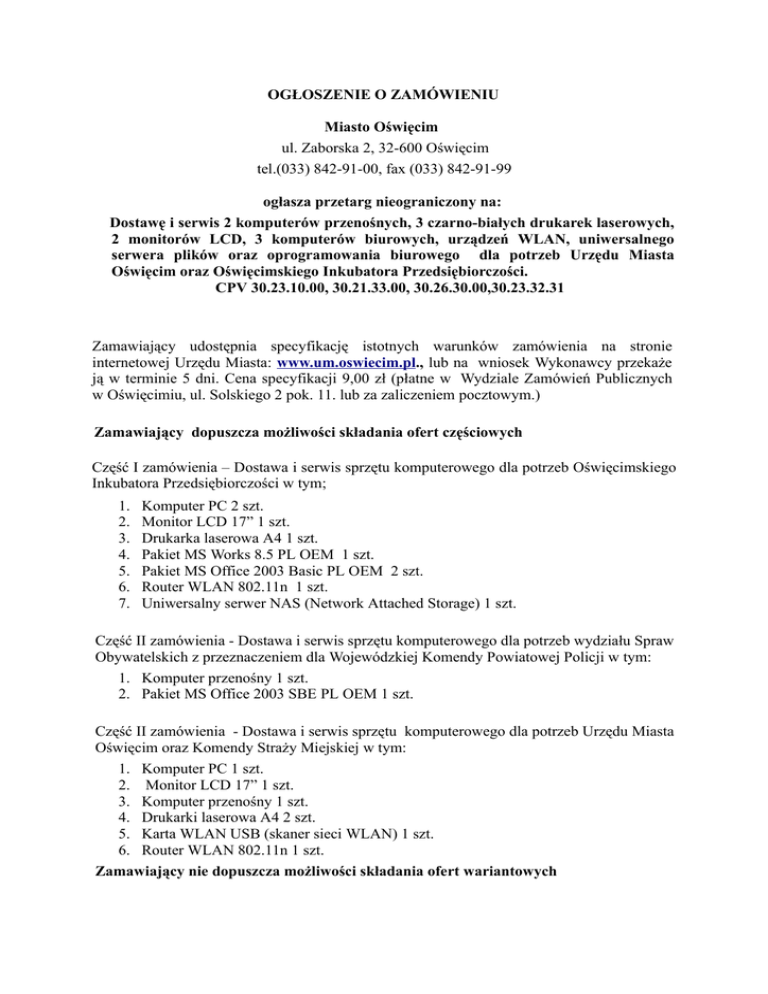 OGŁOSZENIE O ZAMÓWIENIU Miasto Oświęcim ul. Zaborska 2, 32-600 Oświęcim tel.(033) 842-91-00, fax (033) 842-91-99 ogłasza przetarg nieograniczony na: Dostawę i serwis 2 komputerów przenośnych, 3 czarno-białych drukarek laserowych, 2 monitorów LCD, 3 komputerów biurowych, urządzeń WLAN, uniwersalnego serwera plików oraz oprogramowania biurowego dla potrzeb Urzędu Miasta Oświęcim oraz Oświęcimskiego Inkubatora Przedsiębiorczości. CPV 30.23.10.00, 30.21.33.00, 30.26.30.00,30.23.32.31 Zamawiający udostępnia specyfikację istotnych warunków zamówienia na stronie internetowej Urzędu Miasta: www.um.oswiecim.pl., lub na wniosek Wykonawcy przekaże ją w terminie 5 dni. Cena specyfikacji 9,00 zł (płatne w Wydziale Zamówień Publicznych w Oświęcimiu, ul. Solskiego 2 pok. 11. lub za zaliczeniem pocztowym.) Zamawiający dopuszcza możliwości składania ofert częściowych Część I zamówienia – Dostawa i serwis sprzętu komputerowego dla potrzeb Oświęcimskiego Inkubatora Przedsiębiorczości w tym; 1. 2. 3. 4. 5. 6. 7. Komputer PC 2 szt. Monitor LCD 17” 1 szt. Drukarka laserowa A4 1 szt. Pakiet MS Works 8.5 PL OEM 1 szt. Pakiet MS Office 2003 Basic PL OEM 2 szt. Router WLAN 802.11n 1 szt. Uniwersalny serwer NAS (Network Attached Storage) 1 szt. Część II zamówienia - Dostawa i serwis sprzętu komputerowego dla potrzeb wydziału Spraw Obywatelskich z przeznaczeniem dla Wojewódzkiej Komendy Powiatowej Policji w tym: 1. Komputer przenośny 1 szt. 2. Pakiet MS Office 2003 SBE PL OEM 1 szt. Część II zamówienia - Dostawa i serwis sprzętu komputerowego dla potrzeb Urzędu Miasta Oświęcim oraz Komendy Straży Miejskiej w tym: 1. Komputer PC 1 szt. 2. Monitor LCD 17” 1 szt. 3. Komputer przenośny 1 szt. 4. Drukarki laserowa A4 2 szt. 5. Karta WLAN USB (skaner sieci WLAN) 1 szt. 6. Router WLAN 802.11n 1 szt. Zamawiający nie dopuszcza możliwości składania ofert wariantowych Wymagany termin wykonania zamówienia: 14 kalendarzowych od daty podpisania umowy. W postępowaniu mogą wziąć udział wykonawcy, którzy spełniają następujące warunki: - posiadają uprawnienia do wykonywania określonej działalności lub czynności, jeżeli ustawy nakładają obowiązek posiadania takich uprawnień: a) posiadają aktualny odpis z właściwego rejestru albo aktualne zaświadczenia o wpisie do ewidencji działalności gospodarczej, jeżeli odrębne przepisy wymagają wpisu do rejestru lub zgłoszenia do ewidencji działalności gospodarczej, wystawiony nie wcześniej niż 6 miesięcy przed upływem terminu składania ofert. - oferowane dostawy odpowiadają wymaganiom określonym przez Zamawiającego: a) zaświadczenie podmiotu uprawnionego do kontroli jakości potwierdzającego, że dostarczone produkty odpowiadają określonym normom lub specyfikacjom technicznym kserokopie dokumentów potwierdzających posiadanie certyfikatu CE lub deklaracje zgodności zgodnie z obowiązującymi przepisami. - nie są wykluczeni na podstawie art. 24 ust. 1 i 2, oraz spełniający wymogi art. 22 ust. 1 ustawy z dnia 29 stycznia 2004 r. Prawo zamówień publicznych Ocena spełnienia warunków wymaganych od wykonawców zostanie dokonana w oparciu o w/w kryteria wg. formuły „spełnia” - „nie spełnia”. W postępowaniu nie jest wymagane wniesienie wadium Kryteria oceny ofert i ich znaczenie: Kryterium oceny ofert: 1) cena ofertowa 100% Ilość punktów przyznana dla kryterium „cena” będzie obliczana na podstawie stosunku najniższej ceny do zaoferowanych. Uzyskana od poszczególnych Członków Komisji ilość punktów w w/w kryterium zostanie zsumowana i pomnożona przez procentowe znaczenie tego kryterium. Ofertę należy złożyć w siedzibie Zamawiającego, ul. Zaborska 2, pok. 1 do dnia 31-10-2006 r. do godz. 1000. Otwarcie ofert nastąpi w dniu 31-10-2006 r. o godz. 1100, ul. Solskiego 2, pok. 11. Termin związania ofertą: 30 dni Uprawnionymi do kontaktów z Wykonawcami są: Marek Lach Mirosław Ziaja ul. Zaborska 2 , pok. 8 w sprawach związanych z przedmiotem zamówienia tel. 033/842-91-08 tel. 033/842-91-58 Marcelina Świadek ul. Solskiego 2, pok. 11 w sprawach związanych z procedurą przetargową tel. 033/842-93-11 Zamawiający nie zamierza zawierać umowy ramowej Zamawiający nie przewiduje ustanowienia dynamicznego systemu zakupów Zamawiający nie przewiduje wyboru oferty najkorzystniejszej z zastosowaniem aukcji elektronicznej. Data publikacji: 20 października 2006r.
