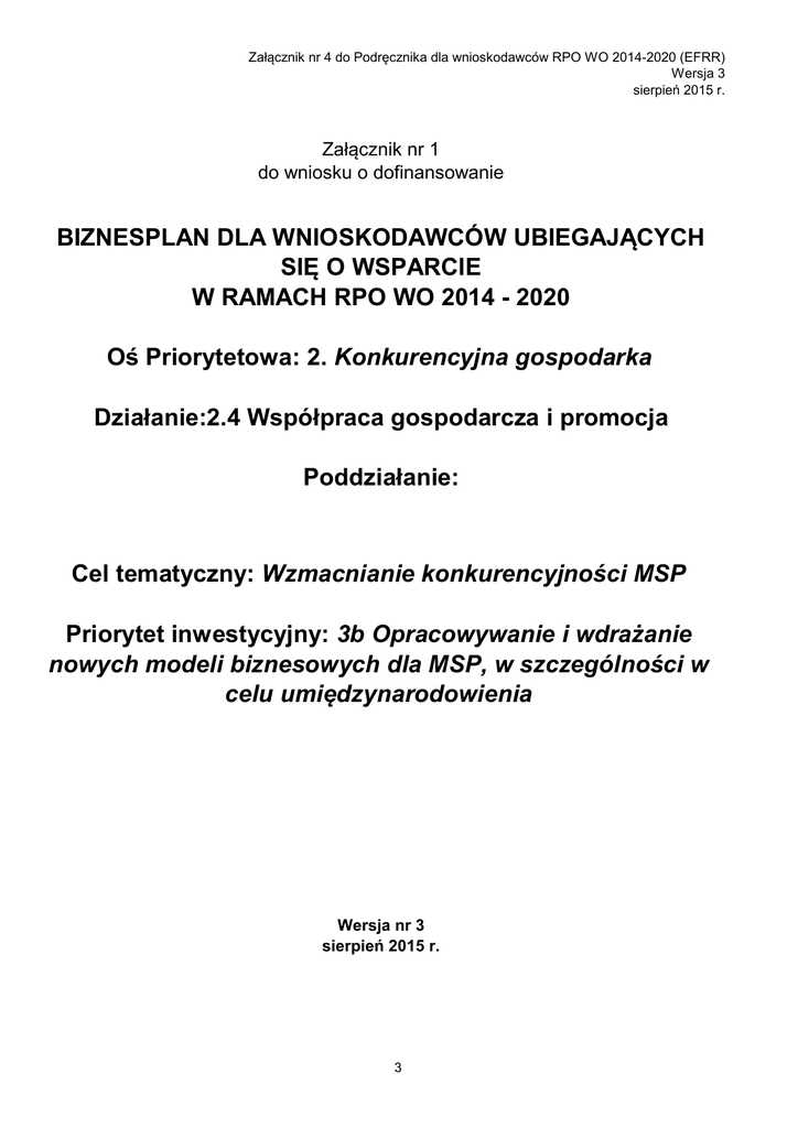 Załącznik nr 4 do Podręcznika dla wnioskodawców RPO WO 2014-2020 (EFRR) Wersja 3 sierpień 2015 r. Załącznik nr 1 do wniosku o dofinansowanie BIZNESPLAN DLA WNIOSKODAWCÓW UBIEGAJĄCYCH SIĘ O WSPARCIE W RAMACH RPO WO 2014 - 2020 Oś Priorytetowa: 2. Konkurencyjna gospodarka Działanie:2.4 Współpraca gospodarcza i promocja Poddziałanie: Cel tematyczny: Wzmacnianie konkurencyjności MSP Priorytet inwestycyjny: 3b Opracowywanie i wdrażanie nowych modeli biznesowych dla MSP, w szczególności w celu umiędzynarodowienia Wersja nr 3 sierpień 2015 r. 3 Załącznik nr 4 do Podręcznika dla wnioskodawców RPO WO 2014-2020 (EFRR) Wersja 3 sierpień 2015 r. A. Podstawowe informacje identyfikujące Wnioskodawcę oraz projekt. B. Opis dotychczasowej działalności Wnioskodacy. C. Opis projektu. D. Plan marketingowy dla projektu. E. Prognoza sprzedaży/ popytu. F. Sytuacja finansowa Wnioskodawcy oraz jej prognoza. G. Odniesienie do kryteriów oceny projektu. H. Zastosowane uproszczone metody rozliczenia wydatków bezpośrednich oraz kosztów pośrednich 4 Załącznik nr 4 do Podręcznika dla wnioskodawców RPO WO 2014-2020 (EFRR) Wersja 3 sierpień 2015 r. Karta informacyjna Określenie Wnioskodawcy: Nazwa firmy/Imię i nazwisko Tytuł projektu: PKD (dot. działalności głównej): PKD działalności objetej zakresem projektu: Całkowita wartośc kosztów kwalifikowanych projektu: Wnioskowana kwota dofinansowania: Okres realizacji projektu: Projekt realizowany w partnerstwie lub z realizatorem (TAK/NIE) 5 Załącznik nr 4 do Podręcznika dla wnioskodawców RPO WO 2014-2020 (EFRR) Wersja 3 sierpień 2015 r. A. Podstawowe informacje dotyczące projektu. A.1 Informacje dotyczące wnioskodawcy Prosimy o podanie następujących informacji dotyczących wnioskodawcy wraz z podaniem informacji o ewentualnych udziałowcach przedsiębiorstwa 1. Pełna nazwa 2. Adres siedziby 2.1 Telefaks (wraz z nr kierunkowym) 2.2 Telefon 2.3 Adres poczty elektronicznej 2.4 Adres strony internetowej 2.5 Status prawny nieruchomości 3. Osoba uprawniona do kontaktu w sprawach dotyczących wniosku 4. Czy Wnioskodawca ma status podatnika VAT (TAK/NIE) 5. Data rozpoczęcia działalności (DD/MM/RRRR) 6. Udziałowcy oraz % udziałów i głosów A.2 Lokalizacja projektu Proszę podać dane dotyczące nieruchomości, przy której lub, w której projekt będzie zlokalizowany. 1. Województwo 2. Powiat 3. Gmina 4. Miejscowość 5. Kod pocztowy 6. Ulica 7. Numer domu 8. Nr lokalu 9. Status prawny nieruchomości: określić formę władania nieruchomością; jeśli jest dzierżawiona/wynajmowana, to na jaki okres i jakie są ograniczenia? (okres wypowiedzenia). 10. Pozostałe miejsca realizacji projektu (jeśli dotyczy). Proszę podać województwo, powiat, gminę, miejscowość, kod pocztowy, ulicę, nr domu i lokalu (jeśli możliwe). 6 Załącznik nr 4 do Podręcznika dla wnioskodawców RPO WO 2014-2020 (EFRR) Wersja 3 sierpień 2015 r. A.3 Informacje dotyczące partnera/realizatora Prosimy o podanie następujących informacji dotyczących wnioskodawcy wraz z podaniem informacji o ewentualnych udziałowcach przedsiębiorstwa (w przypadku realizacji projektu bez udziału partnera, realizatora usunąć przedmiotową tabelę). 1. Pełna nazwa 2. Adres siedziby 2.1 Telefaks (wraz z nr kierunkowym) 2.2 Telefon 2.3 Adres poczty elektronicznej 2.4 Adres strony internetowej 3. Osoba uprawniona do kontaktu w sprawach dotyczących wniosku 4. Czy Wnioskodawca ma status podatnika VAT (TAK/NIE) 5. Data rozpoczęcia działalności (DD/MM/RRRR) 6. Udziałowcy 7 Załącznik nr 4 do Podręcznika dla wnioskodawców RPO WO 2014-2020 (EFRR) Wersja 3 sierpień 2015 r. B. Opis dotychczasowej działalności wnioskodawcy. B.1 Działalność wnioskodawcy Proszę określić rodzaj prowadzonej (lub prowadzonych) działalności gospodarczej oraz podać numer EKD lub PKD (cztery cyfry). W przypadku nowopowstałych przedsiębiorstw proszę wpisać NIE DOTYCZY. Działalność nr PKD lub EKD Charakterystyka Udział % w ostatnim roku obrotowym w ogólnej wartości przychodów ze sprzedaży Udział % pracujących w ogólnej liczbie pracujących B.2 Charakterystyka działalności przedsiębiorstwa Proszę w kilku zdaniach opisać historię przedsiębiorstwa, główny przedmiot działalności, proszę również opisać czy i jak w związku z realizacją projektu zmieni się charakter prowadzonej działalności, jeżeli Wnioskodawca prowadzi różne rodzaje działalności czy planuje zrezygnować z jednej lub wielu z nich? Proszę również szczegółowo opisać prowadzoną dotychczas działalność eksportową (dotychczasowe przychody z eksportu, kraje do których przedsiębiorstwo eksportuje swoje produkty, istniejące umowy/ porozumienia z komntrahentami zagranicznymi) (maksymalnie 1 strona). W poniższej tabeli proszę wymienić otrzymane certyfikaty i nagrody: Certyfikaty/Nagrody Czego dotyczyły (krótki opis) 8 Rok przyznania Załącznik nr 4 do Podręcznika dla wnioskodawców RPO WO 2014-2020 (EFRR) Wersja 3 sierpień 2015 r. B.3 Miejsce na rynku Charakterystyka rynku: Kto jest głównym odbiorcą? Proszę podać szacunkową liczbę klientów oraz określić udział poszczególnych odbiorców (grup odbiorców) w przychodach ze sprzedaży. Powyższe proszę opisać w rozbiciu na kraj i zagranicę. Czy produkty i usługi są przeznaczone na rynek lokalny, regionalny, krajowy lub eksport? Jakie są oczekiwania i potrzeby klientów? W jakim stopniu Państwa oferta odpowiada na te oczekiwania? Czy coś trzeba zmienić? Jeśli tak, to co? W których segmentach Państwa oferty popyt jest rosnący, a gdzie malejący? Sprzedaż, których produktów, usług lub towarów ulega wahaniom sezonowym? Jak poważne jest to zjawisko? 9 Załącznik nr 4 do Podręcznika dla wnioskodawców RPO WO 2014-2020 (EFRR) Wersja 3 sierpień 2015 r. C. Opis projektu C.1 Wpływ projektu na działalność wnioskodawcy – cele projektu Proszę scharakteryzować podstawowe cele projek