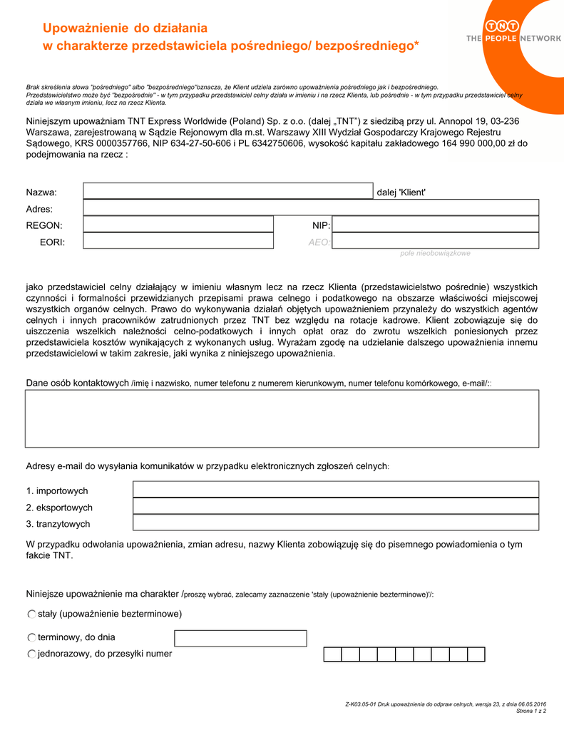 Upoważnienie do działania w charakterze przedstawiciela pośredniego/ bezpośredniego* Brak skreślenia słowa "pośredniego" albo "bezpośredniego"oznacza, że Klient udziela zarówno upoważnienia pośredniego jak i bezpośredniego. Przedstawicielstwo może być "bezpośrednie" - w tym przypadku przedstawiciel celny działa w imieniu i na rzecz Klienta, lub pośrednie - w tym przypadku przedstawiciel celny działa we własnym imieniu, lecz na rzecz Klienta. Niniejszym upoważniam TNT Express Worldwide (Poland) Sp. z o.o. (dalej „TNT”) z siedzibą przy ul. Annopol 19, 03-236 Warszawa, zarejestrowaną w Sądzie Rejonowym dla m.st. Warszawy XIII Wydział Gospodarczy Krajowego Rejestru Sądowego, KRS 0000357766, NIP 634-27-50-606 i PL 6342750606, wysokość kapitału zakładowego 164 990 000,00 zł do podejmowania na rzecz : Nazwa: dalej 'Klient' Adres: REGON: NIP: EORI: AEO: pole nieobowiązkowe jako przedstawiciel celny działający w imieniu własnym lecz na rzecz Klienta (przedstawicielstwo pośrednie) wszystkich czynności i formalności przewidzianych przepisami prawa celnego i podatkowego na obszarze właściwości miejscowej wszystkich organów celnych. Prawo do wykonywania działań objętych upoważnieniem przynależy do wszystkich agentów celnych i innych pracowników zatrudnionych przez TNT bez względu na rotacje kadrowe. Klient zobowiązuje się do uiszczenia wszelkich należności celno-podatkowych i innych opłat oraz do zwrotu wszelkich poniesionych przez przedstawiciela kosztów wynikających z wykonanych usług. Wyrażam zgodę na udzielanie dalszego upoważnienia innemu przedstawicielowi w takim zakresie, jaki wynika z niniejszego upoważnienia. Dane osób kontaktowych /imię i nazwisko, numer telefonu z numerem kierunkowym, numer telefonu komórkowego, e-mail/:: Adresy e-mail do wysyłania komunikatów w przypadku elektronicznych zgłoszeń celnych: 1. importowych 2. eksportowych 3. tranzytowych W przypadku odwołania upoważnienia, zmian adresu, nazwy Klienta zobowiązuję się do pisemnego powiadomienia o tym fakcie TNT. Niniejsze upoważnienie ma charakter /proszę wybrać, zalecamy zaznaczenie 'stały (upoważnienie bezterminowe)'/: stały (upoważnienie bezterminowe) terminowy, do dnia jednorazowy, do przesyłki numer Z-K03.05-01 Druk upoważnienia do odpraw celnych, wersja 23, z dnia 06.05.2016 Strona 1 z 2 Klient zobowiązuje się do: 1. Dostarczania wszelkich informacji niezbędnych do prawidłowego wykonywania usług w zakresie udzielonego upoważnienia, w tym do informowania o kompletności przesyłek i rzetelnego, dokładnego tłumaczenia treści faktur. Dokonanie tłumaczenia treści faktury do danej przesyłki przez pracownika Klienta, lub osobę przez niego wyznaczoną oznacza, iż pracownik ten jest upoważniony do reprezentowania Klienta w zakresie wszystkich czynności dotyczących tej przesyłki a także w zakresie zaniechania takich czynności. Na kopii faktury, oprócz jej tłumaczenia, mogą być umieszczane inne wskazówki i informacje mogące mieć wpływ na sposób realizacji usługi. 2. Dokonywania zapłaty na konto bankowe TNT Express Worldwide (Poland) Sp. z o. o. kwoty równej kwocie długu celnego wynikającego ze zgłoszenia celnego. W wypadku gdy w jakiejś sprawie zostanie wydana decyzja administracyjna organów celnych - Klient będzie dokonywał wpłat kwot na konto wskazane w tej decyzji (w przypadkach niedopłat) lub będzie otrzymywał zwrot środków z organów celnych na swoje konto (w przypadkach nadpłat). 3. Pokrywania wszelkich szkód poniesionych przez TNT Express Worldwide (Poland) Sp. z o. o. będących wynikiem nieprawidłowych bądź niepełnych danych o których mowa w pkt. 1 niniejszego załącznika, przekazanych przez pracowników Klienta lub osoby przez nie wyznaczone. pieczęć firmowa company stamp data dated czytelny podpis lub podpis wraz z podaniem drukowanymi literami imienia i nazwiska upoważniającego zgodnie ze sposobem reprezentacji Klienta w KRS Udostępnione powyżej dane są administrowane przez TNT Express Worldwide (Poland) Sp. z o.o. z siedzibą w Warszawie przy ul. Annopol 19 zgodnie z ustawą z dnia 29 sierpnia 1997 r. o ochronie danych osobowych (Dz. U. z 2002 r. Nr 101, poz. 926 z późn. zm.) w zakresie niezbędnym do realizacji upoważnienia. Zgodnie z ww. ustawą każdy ma prawo wglądu do swych danych oraz możliwość ich poprawiania. Z-K03.05-01 Druk upoważnienia do odpraw celnych, wersja 23, z dnia 06.05.2016 Strona 2 z 2