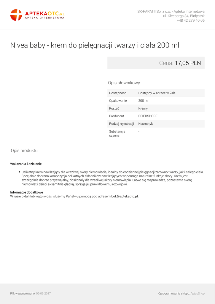 SK-FARM II Sp. z o.o. - Apteka Internetowa ul. Kleeberga 34, Białystok +48 42 279 40 05 Nivea baby - krem do pielęgnacji twarzy i ciała 200 ml Cena: 17,05 PLN Opis słownikowy Dostępność Dostępny w aptece w 24h Opakowanie 200 ml Postać Kremy Producent BEIERSDORF Rodzaj rejestracji Kosmetyk Substancja czynna - Opis produktu Wskazania i działanie Delikatny krem nawilżający dla wrażliwej skóry niemowlęcia, idealny do codziennej pielęgnacji zarówno twarzy, jak i całego ciała. Specjalnie dobrana kompozycja delikatnych składników nawilżających wspomaga naturalne funkcje skóry. Krem jest szczególnie dobrze przyswajalny, doskonały dla wrażliwej skóry niemowlęcia. Łatwo się rozprowadza, pozostawia skórę niemowląt i dzieci aksamitnie gładką, sprzyja jej prawidłowemu rozwojowi. Informacje dodatkowe W razie pytań lub wątpliwości służymy Państwu pomocą pod adresem [email protected]. Plik wygenerowano: 02-03-2017 Powered by TCPDF (www.tcpdf.org) Oprogramowanie sklepu: AptusShop