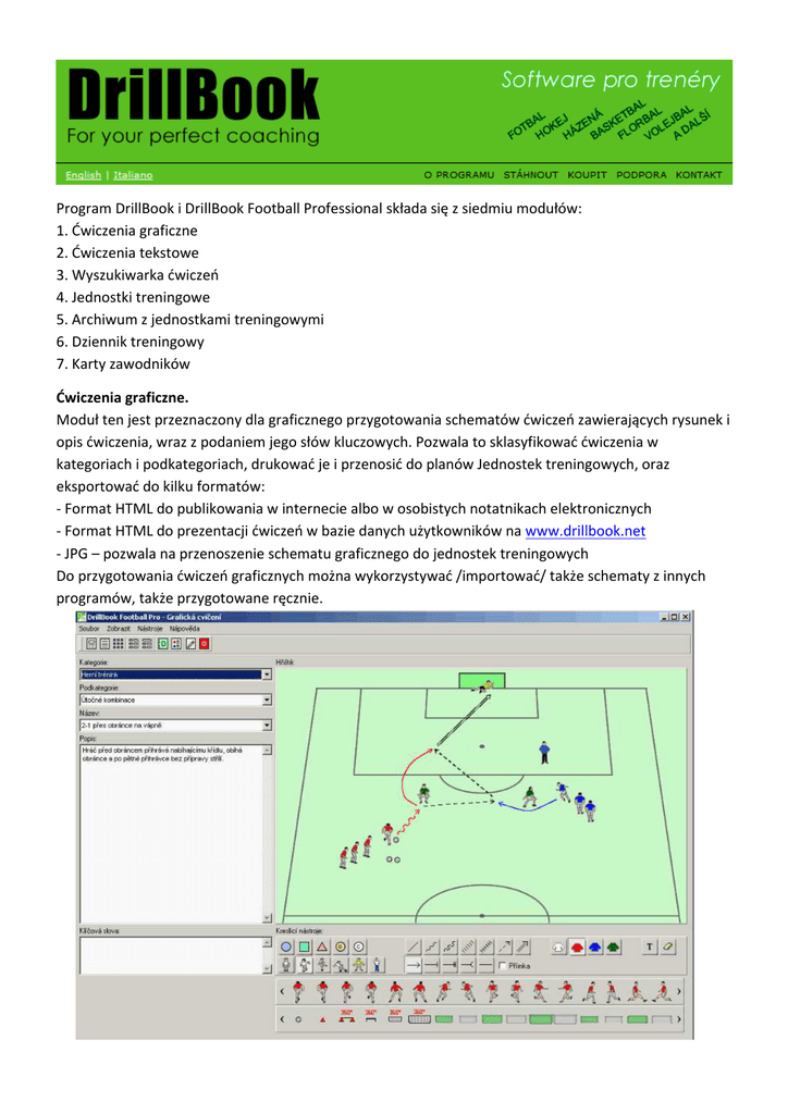 Program DrillBook i DrillBook Football Professional składa się z siedmiu modułów: 1. Ćwiczenia graficzne 2. Ćwiczenia tekstowe 3. Wyszukiwarka ćwiczeń 4. Jednostki treningowe 5. Archiwum z jednostkami treningowymi 6. Dziennik treningowy 7. Karty zawodników Ćwiczenia graficzne. Moduł ten jest przeznaczony dla graficznego przygotowania schematów ćwiczeń zawierających rysunek i opis ćwiczenia, wraz z podaniem jego słów kluczowych. Pozwala to sklasyfikować ćwiczenia w kategoriach i podkategoriach, drukować je i przenosić do planów Jednostek treningowych, oraz eksportować do kilku formatów: - Format HTML do publikowania w internecie albo w osobistych notatnikach elektronicznych - Format HTML do prezentacji ćwiczeń w bazie danych użytkowników na www.drillbook.net - JPG – pozwala na przenoszenie schematu graficznego do jednostek treningowych Do przygotowania ćwiczeń graficznych można wykorzystywać /importować/ także schematy z innych programów, także przygotowane ręcznie. Ćwiczenia tekstowe. Moduł ten pozwala trenerom przygotować ćwiczenia, które są opisane tylko w postaci tekstu, bez schematów graficznych (szczególnie polecane dla ćwiczeń przygotowania specjalnego oraz treningu najmłodszych piłkarzy). Oprócz tekstów program stwarza możliwość dodania nawet 4 fotografie albo obrazy do każdego ćwiczenia. Każde ćwiczenie tekstowe może być zostać sklasyfikowane w określonych kategoriach i podkategoriach, drukowane, eksportowane do formatu HTML do opublikowania w sieci albo wprowadzone do pamięci komputera w postaci notatki elektronicznej. Może być także przenoszone podobnie jak schemat graficzny do jednostek treningowych. Zdjęcie zaczerpnięte jest z programu dla trenerów hokeju na lodzie /w piłce nożnej występuje ten sam panel/. Wyszukiwarka ćwiczeń. Ten moduł pozwala użytkownikowi oglądać 16 schematów jednocześnie. Mogą one być przenoszone do modułu Ćwiczeń graficznych, albo bezpośrednio przygotowywanych jednostek treningowych. Zdjęcie zaczerpnięte jest z programu dla trenerów hokeju na lodzie /w piłce nożnej występuje ten sam panel/. Jednostki treningowe. Przygotowanie określonej części treningu wymaga poświęcenia dużo więcej czasu, niż jednego ćwiczenia. Moduł ten pozwala przenieść dowolną liczbę schematów /graficznych albo formie tekstu/ do tworzonej jednostki treningowej. Utworzoną jednostkę treningową możemy przypisać do określonej kategorii, sklasyfikować, wyeksportować do formatu HTML i oczywiście wydrukować. Jednostki treningowe mogą zostać opublikowane w podstawowym, albo powiększonym interfejsie. Podstawowy interfejs ogranicza się tylko do ćwiczeń graficznych, powiększony może być uzupełniony o notatki tekstowe trenera. Zdjęcie zaczerpnięte jest z programu dla trenerów hokeju na lodzie /w piłce nożnej występuje ten sam panel/. Archiwum jednostek treningowych. Ten moduł pozwala na przechowywanie jednostek treningowych użytych do konkretnych treningów. Zdjęcie zaczerpnięte jest z programu dla trenerów hokeju na lodzie /w piłce nożnej występuje ten sam panel/. Dziennik treningowy. Dziennik treningowy służy trenerom do rejestracji wydarzeń w zespole. Stwarza możliwość pracy z większą ilością zespołów i prowadzeniem dla nich oddzielnych dzienników. Pozwala na dokonywanie dowolnej ilości wpisów /liczba zawodników/ oraz ich wydruk. Karty zawodnicze. Moduł ten może zostać użyty przez użytkowników dla zapisywania indywidualnych informacji o poszczególnych zawodnikach. Stwarza możliwość utworzenia dowolnej liczby kart dla zawodników danego zespołu. Program występuje w następujących wersjach językowych: czeskiej, angielskiej, niemieckiej, słowackiej, hiszpańskiej, portugalskiej, holenderskiej, włoskiej. www.drillbook.net Pomoc techniczna i często zadawane pytania. Jak mam postępować po zakupie programu? Po wejściu na stronę www.drillbook.net w okienku „Downland” pobierasz wersję demonstracyjną programu DrillBook, lub DrillBook Football Professional. Po uruchomieniu programu ukazuje się okienko z wygenerowanym numerem. Numer ten należy przesłać e-mailem na adres: [email protected] W ciągu 24 godzin /po wcześniejszym dokonaniu zapłaty/ zostanie przesłany kod aktywacyjny, który następnie wpisujesz w wyświetlającym się okienku. Nie trzeba ponownie instalować programu, ponieważ każda instalacja generuje nowy klucz. Jest to zabezpieczenie w celu ochrony praw autorskich. Bazując na wygenerowanym numerze producent jest w stanie kontrolować, czy użytkownik instaluje program na więcej niż jednym komputerze. Jacyś użytkownicy przesłali nam nawet cztery wygenerowane numery z tłumaczeniem, ze nie są w stanie uruchomić programu. …Otrzymałem kod aktywacji, ale nie mogę uruchomić programu, który mówi, że klucz jest niepoprawny... Dzięki temu stwierdzeniu doszliśmy do wniosku, ze nie każdy użytkownik jest w stanie poradzić sobie z przeprowadzeniem prostej instalacji programu. Dlatego stworzyliśmy instrukcję instalacji programu krok po kroku. Proszę postępować według poniższego opisu; 1. Pobierz wersję demonstracyjną programu Drillbook lub Drillbook Football Professional. 2. Postępuj według instrukcji wyświetlanych w oknie instalacji. Polecamy nie zmieniać folderu, w którym program zostanie zainstalowany (c:\Program Files\ DrillBook albo c:\ Program Files\DrillBookFootballProfessional). Wybierz opcję ikona na pulpicie. 3. Po zakończeniu pracy instalacji nie uruchamiaj ponownie instalatora poszczególnych programów. 4. Możesz rozpocząć pracę z programem demonstracyjnym poprzez kliknięcie na pulpicie na ikonkę programu, lub poprzez menu; Start - Programy - DrillBook (albo DrillBook Football Professional) Po uruchomieniu programu ukazuje się okno z wygenerowanym numerem. Możesz pracować z programu demonstracyjnym, lub po otrzymaniu kodów aktywacyjnych w wpisaniu ich