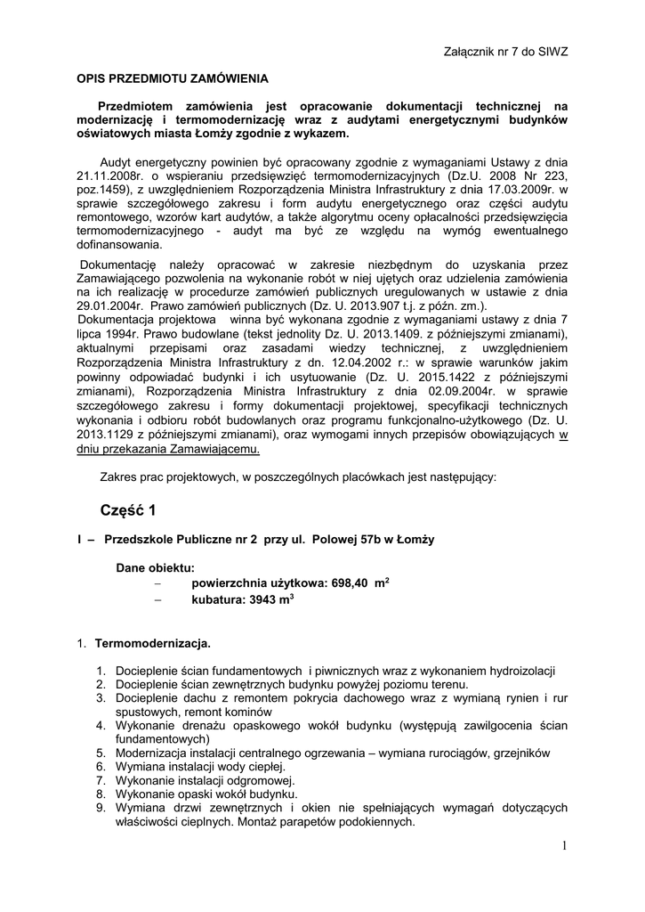 Załącznik nr 7 do SIWZ OPIS PRZEDMIOTU ZAMÓWIENIA Przedmiotem zamówienia jest opracowanie dokumentacji technicznej na modernizację i termomodernizację wraz z audytami energetycznymi budynków oświatowych miasta Łomży zgodnie z wykazem. Audyt energetyczny powinien być opracowany zgodnie z wymaganiami Ustawy z dnia 21.11.2008r. o wspieraniu przedsięwzięć termomodernizacyjnych (Dz.U. 2008 Nr 223, poz.1459), z uwzględnieniem Rozporządzenia Ministra Infrastruktury z dnia 17.03.2009r. w sprawie szczegółowego zakresu i form audytu energetycznego oraz części audytu remontowego, wzorów kart audytów, a także algorytmu oceny opłacalności przedsięwzięcia termomodernizacyjnego - audyt ma być ze względu na wymóg ewentualnego dofinansowania. Dokumentację należy opracować w zakresie niezbędnym do uzyskania przez Zamawiającego pozwolenia na wykonanie robót w niej ujętych oraz udzielenia zamówienia na ich realizację w procedurze zamówień publicznych uregulowanych w ustawie z dnia 29.01.2004r. Prawo zamówień publicznych (Dz. U. 2013.907 t.j. z późn. zm.). Dokumentacja projektowa winna być wykonana zgodnie z wymaganiami ustawy z dnia 7 lipca 1994r. Prawo budowlane (tekst jednolity Dz. U. 2013.1409. z późniejszymi zmianami), aktualnymi przepisami oraz zasadami wiedzy technicznej, z uwzględnieniem Rozporządzenia Ministra Infrastruktury z dn. 12.04.2002 r.: w sprawie warunków jakim powinny odpowiadać budynki i ich usytuowanie (Dz. U. 2015.1422 z późniejszymi zmianami), Rozporządzenia Ministra Infrastruktury z dnia 02.09.2004r. w sprawie szczegółowego zakresu i formy dokumentacji projektowej, specyfikacji technicznych wykonania i odbioru robót budowlanych oraz programu funkcjonalno-użytkowego (Dz. U. 2013.1129 z późniejszymi zmianami), oraz wymogami innych przepisów obowiązujących w dniu przekazania Zamawiającemu. Zakres prac projektowych, w poszczególnych placówkach jest następujący: Część 1 I – Przedszkole Publiczne nr 2 przy ul. Polowej 57b w Łomży Dane obiektu: powierzchnia użytkowa: 698,40 m2 kubatura: 3943 m3 1. Termomodernizacja. 1. Docieplenie ścian fundamentowych i piwnicznych wraz z wykonaniem hydroizolacji 2. Docieplenie ścian zewnętrznych budynku powyżej poziomu terenu. 3. Docieplenie dachu z remontem pokrycia dachowego wraz z wymianą rynien i rur spustowych, remont kominów 4. Wykonanie drenażu opaskowego wokół budynku (występują zawilgocenia ścian fundamentowych) 5. Modernizacja instalacji centralnego ogrzewania – wymiana rurociągów, grzejników 6. Wymiana instalacji wody ciepłej. 7. Wykonanie instalacji odgromowej. 8. Wykonanie opaski wokół budynku. 9. Wymiana drzwi zewnętrznych i okien nie spełniających wymagań dotyczących właściwości cieplnych. Montaż parapetów podokiennych. 1 10. Remont pokrycia dachowego wraz z wymianą rynien i rur spustowych, montaż podgrzewanych wpustów, remont kominów 11. Udrożnienie przewodów wentylacji grawitacyjnej. 12. Montaż nawiewników higrosterowalnych w oknach. 2. Modernizacja i remont. 1. Dostosowanie budynku zgodnie z obowiązującymi przepisami p.poż 2. Wymiana wewnętrznych instalacji sanitarnych: - wymiana instalacja wody zimnej, - wymiana instalacji wody p.poż, - wymiana instalacji kanalizacji sanitarnej (rury skorodowane, występują przecieki) 3. Przebudowa kanalizacji sanitarnej zewnętrznej (problemy z odprowadzeniem ścieków z budynku, występuje częste zapychanie się kanalizacji i „wybijanie” ścieków wewnątrz budynku). 4. Modernizacja kuchni - technologia kuchni - modernizacja instalacji wentylacji, - modernizacja instalacji elektrycznej, - modernizacja instalacji sanitarnej 5. Zagospodarowanie terenu wokół budynku 6. Remont łazienek. 7. Remont tarasu 8. Modernizacja instalacji elektrycznej 9. Dostosowanie budynku dla osób niepełnosprawnych. 10. Modernizacja tarasu i terenu wokół budynku 11. Wykonanie zejścia zewnętrznego do pomieszczeń piwnicznych. II – Przedszkole Publiczne nr 9 przy ul. Prusa 11a w Łomży. Dane obiektu: _ powierzchnia zabudowy 902,60 m2 powierzchnia użytkowa: 1882,14 m.2 kubatura: 8558,60 m.3 1. Termomodernizacja. 1. Docieplenie ścian piwnicznych poniżej poziomu terenu wraz z wykonaniem hydroizolacji. 2. Docieplenie ścian zewnętrznych budynku powyżej poziomu terenu. 3. Docieplenie dachu z remontem pokrycia dachowego wraz z wymianą rynien i rur spustowych, remont kominów. 4. Modernizacja instalacji centralnego ogrzewania – wymiana rurociągów, grzejników 5. 6. 7. 8. (grzejniki żeliwne). Wymiana instalacji wody ciepłej. Wykonanie instalacji odgromowej. Wykonanie opaski wokół budynku. Wymiana drzwi zewnętrznych i okien nie spełniających wymagań dotyczących właściwości cieplnych, montaż podokienników. 2 9. Modernizacja wentylacji grawitacyjnej. 10. Montaż nawiewników higrosterowalnych w oknach. 2. Modernizacja i remont. 1. Modernizacja klatek schodowych – z systemem oddymiania zgodnie z obowiązującymi przepisami p.poż. 2. Wymiana wewnętrznych instalacji sanitarnych: - wymiana instalacja wody zimnej, - wymiana instalacji wody p.poż, - wymiana instalacji kanalizacji sanitarnej (rury skorodowane, występują przecieki). 3. Przebudowa kanalizacji sanitarnej zewnętrznej (problemy z odprowadzeniem ścieków z budynku, występuje częste zapychanie się kanalizacji i „wybijanie” ścieków wewnątrz budynku) 4. Modernizacja pomieszczeń kuchennych - technologia kuchni: - modernizacja instalacji wentylacji, - modernizacja instalacji elektrycznej, - modernizacja instalacji sanitarnej (wydzielenie kanalizacji technologicznej z separatorem tłuszczu), 5. Remont łazienek. 6. Modernizacja instalacji elektrycznej . 7. Zagospodarowanie patio (możliwość utworzenia Sali) 8. Modernizacja tarasu i terenu wokół budynku Część 2 III – Przedszkole Publiczne nr 10 przy ul. Księżnej Anny 12 w Łomży. Dane obiektu: powierzchnia użytkowa: 1575 m.2 kubatura: 6511,10 m.3 1. Term