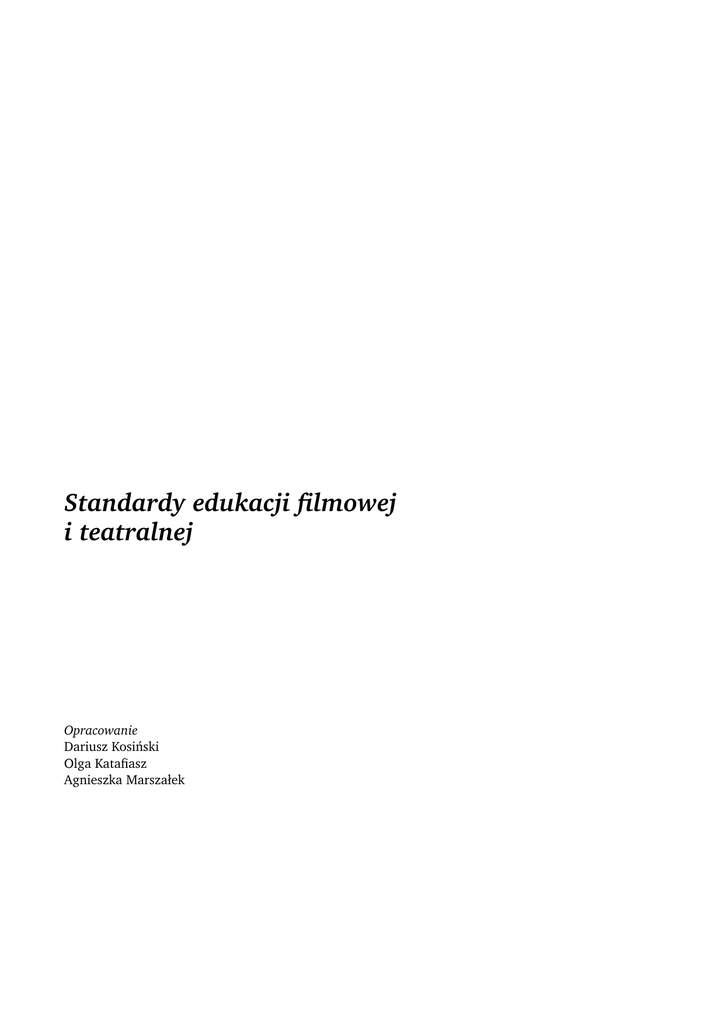 Standardy edukacji filmowej i teatralnej Opracowanie Dariusz Kosiński Olga Katafiasz Agnieszka Marszałek Wprowadzenie Edukacja filmowa i teatralna wraz z zaliczana˛ do tej samej cz˛eści edukacji kulturalnej edukacja˛ medialna˛ stanowia˛ rozległy i bardzo zróżnicowany obszar kształcenia. Z jednej strony obejmuja˛ określony zakres wiedzy praktycznej, teoretycznej i historycznej, dotyczacej ˛ rozległej dziedziny dorobku artystycznego ludzkości, z drugiej – stanowia˛ przestrzeń rozwijania umiej˛etności przydatnych, a nawet niezb˛ednych we współczesnym życiu. Aspekt ten jest szczególnie ważny w przypadku edukacji teatralnej jako narz˛edzia oswajania z sytuacja˛ publicznego wyst˛epu i kształtowania umiej˛etności w niej wykorzystywanych (dykcja, mimika, j˛ezyk ciała, panowanie nad emocjami), a także wyrabiania nawyku pracy zespołowej i radzenia sobie z problemami zwiazanymi ˛ z jej organizacja. ˛ Z kolei edukacja filmowa i medialna ma w pierwszym rz˛edzie na celu wykształcenie świadomego i krytycznego odbioru, umiej˛etności posługiwania si˛e narz˛edziami dostarczanymi przez współczesna˛ technik˛e, skutecznego znajdowania własnej drogi w gaszczu ˛ współczesnych mediów. Oczywiste jest, że nie każda uczennica i nie każdy uczeń zostanie aktorem, dramatopisarzem, reżyserem czy scenarzysta, ˛ każda i każdy jednak b˛edzie aktorem życia codziennego i publicznego oraz odbiorca˛ niezliczonych spektakli teatralnych, filmowych i medialnych. Stwierdzona już dawno przez socjologi˛e i antropologi˛e spektakularyzacja współczesnej, ponowoczesnej i globalnej kultury sprawia, że edukacja w zakresie, którego dotycza˛ niniejsze standardy, wydaje si˛e szczególnie ważna nie tyle w swym wymiarze „encyklopedycznym”, zwiazanym ˛ z określonymi zasobami wiedzy, ile w wymiarze praktycznym. W zwiazku ˛ z tym w edukacji teatralnej i filmowej szczególny nacisk powinien zostać położony na różnorodne formy praktyk aktorów, reżyserów i widzów. Wiaże ˛ si˛e to przede wszystkim z upowszechnieniem i rozwini˛eciem możliwości praktycznej pracy teatralnej na poziomie klasy i szkoły. Teatr jawi si˛e w perspektywie współczesnego życia jako szczególnie cenne narz˛edzie ekspresji, uświadamiania i rozwiazywania ˛ własnych problemów oraz budowania interakcji bezpośrednich z partnerami i widzami. W przypadku dzieci i młodzieży Wprowadzenie 17 szczególnie cenna wydaje si˛e możliwość swoistego „wypróbowywania” różnego rodzaju ról, zachowań i postaw, co może pozwolić na podejmowanie bardziej świadomych decyzji w przyszłości. Nie należy także lekceważyć oferowanej przez praktyczna˛ edukacj˛e teatralna˛ możliwości zwi˛ekszenia stopnia świadomości własnego ciała, nauki panowania nad soba, ˛ technik relaksacyjnych i koncentracyjnych, poprawy jakości wymowy (co ważne nie tylko u młodszych dzieci) oraz umiej˛etności autoprezentacji. Kluczowa rola w tym procesie „reedukacji” przypaść powinna „teatrowi samorodnemu”, powstajacemu ˛ z potrzeby i według zasad samych uczniów. Zasadniczo chodziłoby wi˛ec o to, by szkoła lub współpracujacy ˛ z nia˛ dom kultury stwarzały warunki i pomagały w pracy, pełniły funkcje doradcze, a nie wyznaczały zasady, tematy, nie decydowały o estetyce etc. Oczywiście konieczne jest zachowanie pewnej równowagi, niemniej jednak punktem wyjścia jest inspirowanie i umożliwianie podejmowania działań samodzielnych. Zarówno w odniesieniu do edukacji teatralnej, jak i filmowej, ogromnie ważne jest kształtowanie świadomości odbiorczej – uwrażliwienie na nieprzezroczystość mediów, konwencji i zabiegów dramaturgicznych i reżyserskich czy szeroko rozumianego montażu. Szczególnie ważna wydaje si˛e w tym kontekście edukacja medialna, nastawiona na kształtowanie zasad efektywnego korzystania z mediów, zwłaszcza elektronicznych, oraz unikania zwiazanych ˛ z nimi zagrożeń. Jeśli zgodzić si˛e z przekonaniem, że jedna˛ z sił zagrażajacych ˛ współczesnej kulturze jest rosnaca ˛ bierność jej odbiorców, zamieniajacych ˛ si˛e w bezwolnych konsumentów, to przeciwstawienie si˛e temu trendowi poprzez wychowanie świadomych widzów i słuchaczy wydaje si˛e sprawa˛ wr˛ecz priorytetowa. ˛ Wzbogacenie tego projektu o umiej˛etność i pasj˛e samodzielnego tworzenia przedstawień (co niekoniecznie wieść musi do zawodowstwa) pozwolić może na odnowienie ruchu amatorskiej działalności teatralnej, filmowej i medialnej – ruchu twórczej odpowiedzi na zmiany zachodzace ˛ w życiu i współczesnej kulturze. Dla osiagni˛ ˛ ecia tych dalekosi˛eżnych celów konieczne jest rozpocz˛ecie procesu swoistej reedukacji, polegajacego ˛ w pierwszej kolejności na likwidacji przekonania o „odświ˛etnym” i wyjatkowym ˛ charakterze kultury teatralnej i (w mniejszym stopniu) filmowej. Rozwój różnego typu warsztatów i przedstawień szkolnych wraz ze sta- 18 Standardy edukacji filmowej i teatralnej łymi i regularnymi kontaktami z życiem teatralnym i filmowym ma na celu likwidacj˛e fałszywego przekonania o nieprzystawalności teatru i filmu do problemów codziennego życia. Przeciwstawiajac ˛ si˛e mu, należy dażyć ˛ do stałego odwoływania si˛e do codziennych doświadczeń uczniów i praktycznego wykorzystywania środków artystycznych właściwych teatrowi i filmowi, mogacych ˛ służyć ich rozwiazywaniu. ˛ W ten sposób edukacja teatralna i – w nieco mniejszym stopniu – filmowa stać si˛e może przestrzenia˛ kształtowania osobowości uczniów, wyposażajac ˛ ich w umiej˛etności praktyczne, a także pozwalajac ˛ na zdobycie cennych doświadczeń w formie bezpiecznej, uj˛etej w nawias „trybu przypuszczajacego”. ˛ Ważnym aspektem edukacji teatralnej i filmowej w proponowanym kształcie jest uwrażliwienie młodych widzów i przyszłych uczestników życia kulturalnego na różnorodność jego form 