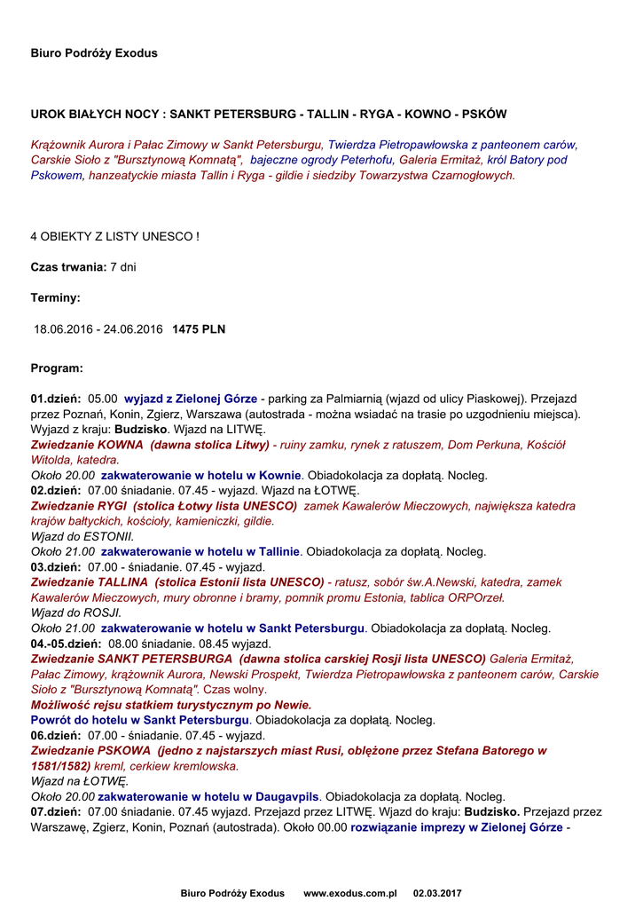 Biuro Podróży Exodus UROK BIAŁYCH NOCY : SANKT PETERSBURG - TALLIN - RYGA - KOWNO - PSKÓW Krążownik Aurora i Pałac Zimowy w Sankt Petersburgu, Twierdza Pietropawłowska z panteonem carów, Carskie Sioło z "Bursztynową Komnatą", bajeczne ogrody Peterhofu, Galeria Ermitaż, król Batory pod Pskowem, hanzeatyckie miasta Tallin i Ryga - gildie i siedziby Towarzystwa Czarnogłowych. BEZ PRZEJAZDÓW NOCNYCH ! 4 OBIEKTY Z LISTY UNESCO ! Czas trwania: 7 dni Terminy: 18.06.2016 - 24.06.2016 1475 PLN Program: 01.dzień: 05.00 wyjazd z Zielonej Górze - parking za Palmiarnią (wjazd od ulicy Piaskowej). Przejazd przez Poznań, Konin, Zgierz, Warszawa (autostrada - można wsiadać na trasie po uzgodnieniu miejsca). Wyjazd z kraju: Budzisko. Wjazd na LITWĘ. Zwiedzanie KOWNA (dawna stolica Litwy) - ruiny zamku, rynek z ratuszem, Dom Perkuna, Kościół Witolda, katedra. Około 20.00 zakwaterowanie w hotelu w Kownie. Obiadokolacja za dopłatą. Nocleg. 02.dzień: 07.00 śniadanie. 07.45 - wyjazd. Wjazd na ŁOTWĘ. Zwiedzanie RYGI (stolica Łotwy lista UNESCO) zamek Kawalerów Mieczowych, największa katedra krajów bałtyckich, kościoły, kamieniczki, gildie. Wjazd do ESTONII. Około 21.00 zakwaterowanie w hotelu w Tallinie. Obiadokolacja za dopłatą. Nocleg. 03.dzień: 07.00 - śniadanie. 07.45 - wyjazd. Zwiedzanie TALLINA (stolica Estonii lista UNESCO) - ratusz, sobór św.A.Newski, katedra, zamek Kawalerów Mieczowych, mury obronne i bramy, pomnik promu Estonia, tablica ORPOrzeł. Wjazd do ROSJI. Około 21.00 zakwaterowanie w hotelu w Sankt Petersburgu. Obiadokolacja za dopłatą. Nocleg. 04.-05.dzień: 08.00 śniadanie. 08.45 wyjazd. Zwiedzanie SANKT PETERSBURGA (dawna stolica carskiej Rosji lista UNESCO) Galeria Ermitaż, Pałac Zimowy, krążownik Aurora, Newski Prospekt, Twierdza Pietropawłowska z panteonem carów, Carskie Sioło z "Bursztynową Komnatą". Czas wolny. Możliwość rejsu statkiem turystycznym po Newie. Powrót do hotelu w Sankt Petersburgu. Obiadokolacja za dopłatą. Nocleg. 06.dzień: 07.00 - śniadanie. 07.45 - wyjazd. Zwiedzanie PSKOWA (jedno z najstarszych miast Rusi, oblężone przez Stefana Batorego w 1581/1582) kreml, cerkiew kremlowska. Wjazd na ŁOTWĘ. Około 20.00 zakwaterowanie w hotelu w Daugavpils. Obiadokolacja za dopłatą. Nocleg. 07.dzień: 07.00 śniadanie. 07.45 wyjazd. Przejazd przez LITWĘ. Wjazd do kraju: Budzisko. Przejazd przez Warszawę, Zgierz, Konin, Poznań (autostrada). Około 00.00 rozwiązanie imprezy w Zielonej Górze - Biuro Podróży Exodus www.exodus.com.pl 02.03.2017 parking za Palmiarnią. W cenie: autokar: wysokopokładowy, klimatyzacja, WC, video, napoje zimne i gorące (płatne) - około 3500 km noclegi: 6 x hotele**/***- pokoje 2,3-osobowe z łazienką/wc wyżywienie: 6 śniadań pilot BP EXODUS ubezpieczenie NW, KL, bagaż podatek VAT Dodatkowe opłaty: wiza rosyjska z pośrednictwem i dodatkowym ubezpieczeniem na Rosję - 350 zł 6 obiadokolacji (na życzenie) - 230 zł (płatne w biurze przed wyjazdem) wejściówki i przewodnicy lokalni (obligatoryjnie) - 90 EUR (płatne za granicą) rejs statkiem turystycznym po Newie - 10 EUR Uwaga: przy długich przejazdach autokar zatrzymuje się na 15-minutowe postoje każdorazowo po około 4-godzinnej jeździe. Nie bierzemy odpowiedzialności za punkty programu niezrealizowane z przyczyn od nas niezależnych. Biuro Podróży Exodus www.exodus.com.pl 02.03.2017