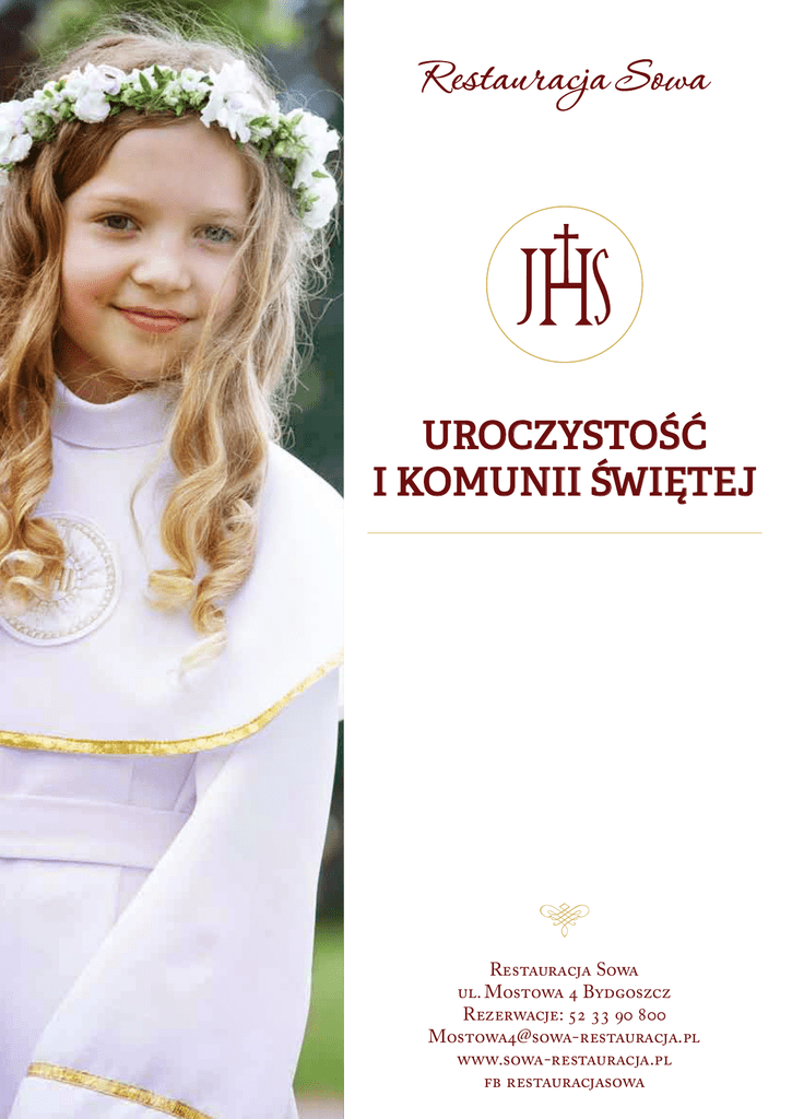 UROCZYSTOŚĆ I KOMUNII ŚWIĘTEJ Restauracja Sowa ul. Mostowa 4 Bydgoszcz Rezerwacje: 52 33 90 800 [email protected] www.sowa-restauracja.pl fb restauracjasowa UROCZYSTOŚĆ I KOMUNII ŚWIĘTEJ OFERTA PRZYJĘCIA KOMUNIJNEGO OBEJMUJE: . miejsce w części restauracyjnej lub Sali Waniliowej Restauracji Sowa . wystrój stołu w kolorach: biały, niebieski, różowy /świeże kwiaty, serwetki, świece/ . dekorację krzesła dziecka komunijnego . menu według własnej kompozycji z zaproponowanego asortymentu . kąciki zabaw dla dzieci CENA MENU PODSTAWOWEGO ZAWIERA: . zupę 1 porcja/os. . danie główne 2 porcje/os. tj. 360 g . deser lodowy 1 porcja/os. . ciasto 2 porcje/os. tj. 200 g . napoje ciepłe bez ograniczeń /kawa, herbata/ . napoje zimne bez ograniczeń /woda mineralna, sok pomarańczowy, sok jabłkowy/ CENA MENU Z KOLACJĄ ZAWIERA: . przekąski zimne 3 porcje/os. tj. 300 g . danie na ciepło 1 porcja/os. tj. 200 g NA ŻYCZENIE PRZYGOTUJEMY: Fontannę czekoladową ze świeżymi owocami /ananas, truskawka, arbuz, winogrono/ 500 zł Świeże owoce /truskawka melon, arbuz, winogrona, kiwi/ 10 zł/os. Tort okolicznościowy dostępny w ofercie www.cukierniasowa.pl rozliczony według wagi MENU KOMUNIJNE ZUPA (1 porcja/os.) . Rosół z domowym makaronem i warzywami . Krem szparagowy z groszkiem ptysiowym . Krem z borowików . Zupa serowa z pomidorami, szynką i francuską diablotką . Krem z pomidorów z grzanką ziołową DANIE GŁÓWNE do wyboru w dowolnej ilości asortymentu (2 porcje/os.) . Uczta z kaczki w sosie śliwkowym z jabłkiem pieczonym i żurawiną . Kotlet de volaille z masłem . Kurczak gotowany w sosie potrawkowym . Pierś z kurczaka nadziewana szpinakiem i serem feta . Roladka drobiowa z zielonymi szparagami . Grillowany filet z kurczaka zapiekany z pomidorami i mozzarellą . Polędwiczki wieprzowe otulone boczkiem w sosie winnym . Polędwiczki wieprzowe nadziewane kurkami . Roladki z polędwiczki wieprzowej z suszonymi pomidorami i mozzarellą . Kotlet schabowy w serowej panierce . Szynka pieczona po zbójnicku . Zrazy wołowe z tradycyjnym farszem . Łosoś z pieca w sosie koperkowym . Sandacz w sosie cytrynowym . Dorsz smażony na złoto z masłem czosnkowym i żurawiną . Dodatki (klasyczny zestaw do każdego menu) . Ziemniaki z koperkiem . Frytki domowe . Kluseczki pszenne . Warzywa gotowane . Bukiet surówek . Buraczki domowe DESER (1 porcja/os.) . Lody waniliowe i malinowe z malinami na ciepło i bitą śmietaną . Lody owocowe ze świeżymi owocami, bezami i musem z truskawek . Jabłecznik na gorąco z sosem waniliowym, lodami i bitą śmietaną . Panna Cotta z sosem z owoców leśnych . Bezowa Rozkosz z malinami na ciepło . Ciasto - klasyczny zestaw do każdego menu (2 porcje/os.) . Sernik tradycyjny . Kostka z galaretką . Kostka hiszpańska orzechowa . Kostka „Czarny Las” KOLACJA do wyboru w dowolnej ilości asortymentu (3 porcje/os.) . Plater mięs na zimno (schab ze śliwką, karkówka z morelami, polędwiczka z grzybami, indyk z serem camembert) . Deska wędlin i serów z klasycznymi dodatkami . Szynka ze szparagami . Szynka po rusku z sałatką warzywną . Sandacz w galarecie . Gravlax z łososia z sosem miodowo - koperkowym na sałatach . Tatar wołowy na razowcu . Sałatka Gyros z grillowanym kurczakiem . Caprese – mozzarella z pomidorami i bazyliowym pesto . Mix sałat z pomidorkami cherry, parmezanem i vinegret . Sałatka z tuńczykiem i dzikim ryżem . Danie na ciepło (1 porcja/os.) . Barszcz z domowym pasztecikiem mięsnym . Żur kujawski z jajkiem, białą kiełbasą i grzybami . Ragoût z kurczaka w kurkach . Pieczywo z naszej piekarni, masło CENA ZA OSOBĘ: 130 ZŁ OBIAD / 160 ZŁ OBIAD Z KOLACJĄ (dzieci do lat 3 menu gratis, do lat 10 – 50% ceny) ARANŻACJE KOMUNIJNE Serdecznie zapraszamy do skorzystania z naszej oferty. W sprawie ustalenia szczegółów prosimy o kontakt: Menager restauracji: tel. 693-99-44-26 [email protected]