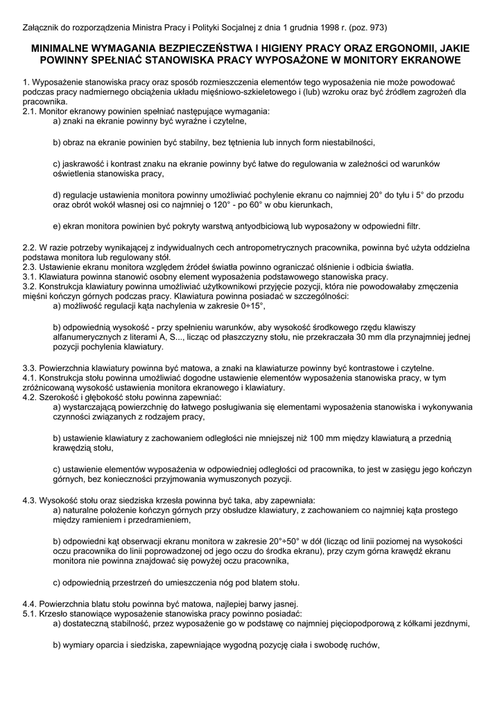 Załącznik do rozporządzenia Ministra Pracy i Polityki Socjalnej z dnia 1 grudnia 1998 r. (poz. 973) MINIMALNE WYMAGANIA BEZPIECZEŃSTWA I HIGIENY PRACY ORAZ ERGONOMII, JAKIE POWINNY SPEŁNIAĆ STANOWISKA PRACY WYPOSAŻONE W MONITORY EKRANOWE 1. Wyposażenie stanowiska pracy oraz sposób rozmieszczenia elementów tego wyposażenia nie może powodować podczas pracy nadmiernego obciążenia układu mięśniowo-szkieletowego i (lub) wzroku oraz być źródłem zagrożeń dla pracownika. 2.1. Monitor ekranowy powinien spełniać następujące wymagania: a) znaki na ekranie powinny być wyraźne i czytelne, b) obraz na ekranie powinien być stabilny, bez tętnienia lub innych form niestabilności, c) jaskrawość i kontrast znaku na ekranie powinny być łatwe do regulowania w zależności od warunków oświetlenia stanowiska pracy, d) regulacje ustawienia monitora powinny umożliwiać pochylenie ekranu co najmniej 20° do tyłu i 5° do przodu oraz obrót wokół własnej osi co najmniej o 120° - po 60° w obu kierunkach, e) ekran monitora powinien być pokryty warstwą antyodbiciową lub wyposażony w odpowiedni filtr. 2.2. W razie potrzeby wynikającej z indywidualnych cech antropometrycznych pracownika, powinna być użyta oddzielna podstawa monitora lub regulowany stół. 2.3. Ustawienie ekranu monitora względem źródeł światła powinno ograniczać olśnienie i odbicia światła. 3.1. Klawiatura powinna stanowić osobny element wyposażenia podstawowego stanowiska pracy. 3.2. Konstrukcja klawiatury powinna umożliwiać użytkownikowi przyjęcie pozycji, która nie powodowałaby zmęczenia mięśni kończyn górnych podczas pracy. Klawiatura powinna posiadać w szczególności: a) możliwość regulacji kąta nachylenia w zakresie 0÷15°, b) odpowiednią wysokość - przy spełnieniu warunków, aby wysokość środkowego rzędu klawiszy alfanumerycznych z literami A, S..., licząc od płaszczyzny stołu, nie przekraczała 30 mm dla przynajmniej jednej pozycji pochylenia klawiatury. 3.3. Powierzchnia klawiatury powinna być matowa, a znaki na klawiaturze powinny być kontrastowe i czytelne. 4.1. Konstrukcja stołu powinna umożliwiać dogodne ustawienie elementów wyposażenia stanowiska pracy, w tym zróżnicowaną wysokość ustawienia monitora ekranowego i klawiatury. 4.2. Szerokość i głębokość stołu powinna zapewniać: a) wystarczającą powierzchnię do łatwego posługiwania się elementami wyposażenia stanowiska i wykonywania czynności związanych z rodzajem pracy, b) ustawienie klawiatury z zachowaniem odległości nie mniejszej niż 100 mm między klawiaturą a przednią krawędzią stołu, c) ustawienie elementów wyposażenia w odpowiedniej odległości od pracownika, to jest w zasięgu jego kończyn górnych, bez konieczności przyjmowania wymuszonych pozycji. 4.3. Wysokość stołu oraz siedziska krzesła powinna być taka, aby zapewniała: a) naturalne położenie kończyn górnych przy obsłudze klawiatury, z zachowaniem co najmniej kąta prostego między ramieniem i przedramieniem, b) odpowiedni kąt obserwacji ekranu monitora w zakresie 20°÷50° w dół (licząc od linii poziomej na wysokości oczu pracownika do linii poprowadzonej od jego oczu do środka ekranu), przy czym górna krawędź ekranu monitora nie powinna znajdować się powyżej oczu pracownika, c) odpowiednią przestrzeń do umieszczenia nóg pod blatem stołu. 4.4. Powierzchnia blatu stołu powinna być matowa, najlepiej barwy jasnej. 5.1. Krzesło stanowiące wyposażenie stanowiska pracy powinno posiadać: a) dostateczną stabilność, przez wyposażenie go w podstawę co najmniej pięciopodporową z kółkami jezdnymi, b) wymiary oparcia i siedziska, zapewniające wygodną pozycję ciała i swobodę ruchów, c) regulację wysokości siedziska w zakresie 400÷500 mm, licząc od podłogi, d) regulację wysokości oparcia oraz regulację pochylenia oparcia w zakresie: 5° do przodu i 30° do tyłu, e) wyprofilowanie płyty siedziska i oparcia odpowiednie do naturalnego wygięcia kręgosłupa i odcinka udowego kończyn dolnych, f) możliwość obrotu wokół osi pionowej o 360°, g) podłokietniki. 5.2. Mechanizmy regulacji wysokości siedziska i pochylenia oparcia powinny być łatwo dostępne i proste w obsłudze oraz tak usytuowane, aby regulację można było wykonywać w pozycji siedzącej. 6.1. Jeśli przy pracy istnieje konieczność korzystania z dokumentów, stanowisko pracy należy wyposażyć w uchwyt na dokument, posiadający regulację ustawienia wysokości, pochylenia oraz odległości od pracownika. 6.2. Uchwyt na dokument powinien znajdować się przed pracownikiem - między ekranem monitora i klawiaturą - lub w innym miejscu - w pozycji minimalizującej uciążliwe ruchy głowy i oczu. 7.1. Na życzenie pracownika, a także gdy wysokość krzesła uniemożliwia pracownikowi płaskie, spoczynkowe ustawienie stóp na podłodze, stanowisko pracy należy wyposażyć w podnóżek. 7.2. Podnóżek powinien mieć kąt pochylenia w zakresie 0°÷15°, a jego wysokość powinna być dostosowana do potrzeb wynikających z cech antropometrycznych pracownika. 7.3. Powierzchnia podnóżka nie powinna być śliska, a sam podnóżek nie powinien przesuwać się po podłodze podczas używania. 8.1. Stanowisko pracy powinno być tak zaprojektowane, aby pracownik miał zapewnioną dostateczną przestrzeń pracy, pozwalającą na umieszczenie wszystkich elementów obsługiwanych ręcznie w zasięgu kończyn górnych. 8.2. Stanowisko pracy wyposażone w monitor ekranowy powinno być tak usytuowane w pomieszczeniu, aby zapewniało pracownikowi swobodny dostęp do tego stanowiska. Odległości między sąsiednimi monitorami powinny wynosić co najmniej 0,6 m, a między pracownikiem i tyłem sąsiedniego monitora - co najmniej 0,8 m. 8.3. Odległość oczu pracownika od ekranu monitora powinna wynosić 400÷750 mm. 9.1. Oświetlenie powinno zapewniać komfort pracy wzrokowej, a szczególnie: a