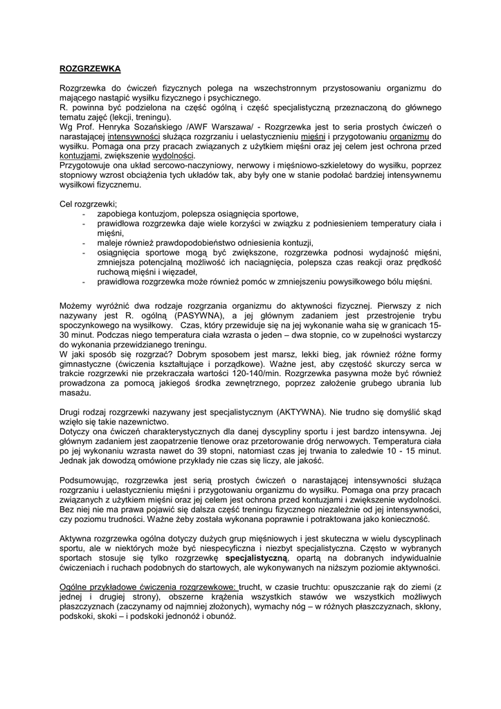 ROZGRZEWKA Rozgrzewka do ćwiczeń fizycznych polega na wszechstronnym przystosowaniu organizmu do mającego nastąpić wysiłku fizycznego i psychicznego. R. powinna być podzielona na część ogólną i część specjalistyczną przeznaczoną do głównego tematu zajęć (lekcji, treningu). Wg Prof. Henryka Sozańskiego /AWF Warszawa/ - Rozgrzewka jest to seria prostych ćwiczeń o narastającej intensywności słuŜąca rozgrzaniu i uelastycznieniu mięśni i przygotowaniu organizmu do wysiłku. Pomaga ona przy pracach związanych z uŜytkiem mięśni oraz jej celem jest ochrona przed kontuzjami, zwiększenie wydolności. Przygotowuje ona układ sercowo-naczyniowy, nerwowy i mięśniowo-szkieletowy do wysiłku, poprzez stopniowy wzrost obciąŜenia tych układów tak, aby były one w stanie podołać bardziej intensywnemu wysiłkowi fizycznemu. Cel rozgrzewki; - zapobiega kontuzjom, polepsza osiągnięcia sportowe, - prawidłowa rozgrzewka daje wiele korzyści w związku z podniesieniem temperatury ciała i mięśni, - maleje równieŜ prawdopodobieństwo odniesienia kontuzji, - osiągnięcia sportowe mogą być zwiększone, rozgrzewka podnosi wydajność mięśni, zmniejsza potencjalną moŜliwość ich naciągnięcia, polepsza czas reakcji oraz prędkość ruchową mięśni i więzadeł, - prawidłowa rozgrzewka moŜe równieŜ pomóc w zmniejszeniu powysiłkowego bólu mięśni. MoŜemy wyróŜnić dwa rodzaje rozgrzania organizmu do aktywności fizycznej. Pierwszy z nich nazywany jest R. ogólną (PASYWNA), a jej głównym zadaniem jest przestrojenie trybu spoczynkowego na wysiłkowy. Czas, który przewiduje się na jej wykonanie waha się w granicach 1530 minut. Podczas niego temperatura ciała wzrasta o jeden – dwa stopnie, co w zupełności wystarczy do wykonania przewidzianego treningu. W jaki sposób się rozgrzać? Dobrym sposobem jest marsz, lekki bieg, jak równieŜ róŜne formy gimnastyczne (ćwiczenia kształtujące i porządkowe). WaŜne jest, aby częstość skurczy serca w trakcie rozgrzewki nie przekraczała wartości 120-140/min. Rozgrzewka pasywna moŜe być równieŜ prowadzona za pomocą jakiegoś środka zewnętrznego, poprzez załoŜenie grubego ubrania lub masaŜu. Drugi rodzaj rozgrzewki nazywany jest specjalistycznym (AKTYWNA). Nie trudno się domyślić skąd wzięło się takie nazewnictwo. Dotyczy ona ćwiczeń charakterystycznych dla danej dyscypliny sportu i jest bardzo intensywna. Jej głównym zadaniem jest zaopatrzenie tlenowe oraz przetorowanie dróg nerwowych. Temperatura ciała po jej wykonaniu wzrasta nawet do 39 stopni, natomiast czas jej trwania to zaledwie 10 - 15 minut. Jednak jak dowodzą omówione przykłady nie czas się liczy, ale jakość. Podsumowując, rozgrzewka jest serią prostych ćwiczeń o narastającej intensywności słuŜąca rozgrzaniu i uelastycznieniu mięśni i przygotowaniu organizmu do wysiłku. Pomaga ona przy pracach związanych z uŜytkiem mięśni oraz jej celem jest ochrona przed kontuzjami i zwiększenie wydolności. Bez niej nie ma prawa pojawić się dalsza część treningu fizycznego niezaleŜnie od jej intensywności, czy poziomu trudności. WaŜne Ŝeby została wykonana poprawnie i potraktowana jako konieczność. Aktywna rozgrzewka ogólna dotyczy duŜych grup mięśniowych i jest skuteczna w wielu dyscyplinach sportu, ale w niektórych moŜe być niespecyficzna i niezbyt specjalistyczna. Często w wybranych sportach stosuje się tylko rozgrzewkę specjalistyczną, opartą na dobranych indywidualnie ćwiczeniach i ruchach podobnych do startowych, ale wykonywanych na niŜszym poziomie aktywności. Ogólne przykładowe ćwiczenia rozgrzewkowe: trucht, w czasie truchtu: opuszczanie rąk do ziemi (z jednej i drugiej strony), obszerne krąŜenia wszystkich stawów we wszystkich moŜliwych płaszczyznach (zaczynamy od najmniej złoŜonych), wymachy nóg – w róŜnych płaszczyznach, skłony, podskoki, skoki – i podskoki jednonóŜ i obunóŜ. Po wykonanym treningu włączamy ćwiczenia wzmacniające, a po ich zakończeniu ćwiczenia rozluźniające mięśnie, wyrównujące oddech i trwają łącznie około 15-20 min. Pomiędzy te ćwiczenia moŜna równieŜ wpleść ćwiczenia rozciągające. Przykładowy zestaw najprostszych ćwiczeń rozgrzewkowych: szybki marsz, trucht, wieloskoki, marsz na czworakach, skipy, krąŜenia ramion w przód, tył, naprzemianstronne; krąŜenia bioder w lewo i prawo krąŜenia kolan do wewnątrz i na zewnątrz krąŜenia nogi w stawie skokowym w L i P zginanie palców, stawanie na palcach nóg, skłony, skrętoskłony, chwyt dłoni za plecami, splecionymi palcami rąk tzw. „karuzela”, podpór przodem z wyrzutem nóg do tyłu, wymachy nogi w płaszczyźnie strzałkowej i czołowej – mocno do góry stanie na jednej nodze ( tzw. jaskółka lub waga ), zwisy, przepychanie "skały", mimiczna gawęda ruchowa – „wycieczka do lasu” - spostrzeŜenia. ćwiczenia gibkościowe i proste ćwiczenia gimnastyczne w parterze (leŜenie, siad, podpory, pół-zwisy na drabinkach). W formie zabawowej np. wykonujemy z siebie literki i cyfry; moŜemy wprowadzić ćwiczenia ze skakankami, woreczkami z grochem, piłkami. Istnieje zasadnicza róŜnica pomiędzy rozgrzewką, a ćwiczeniami rozciągającymi. Wiele osób wykonując ćwiczenia rozciągające, nazywa je rozgrzewką. Jest to błąd. WaŜne jest, aby się rozgrzać przed przystąpieniem do ćwiczeń rozciągających. Jeśli rozciąga się mięśnie bez uprzedniej rozgrzewki są one zimne i bardziej podatne na urazy, takie jak: naderwanie lub naciągnięcie. Nagłe przystąpienie do wytęŜonego wysiłku moŜe spowodować wzrost zapotrzebowania serca na tlen i to w ilości większej niŜ moŜe dostarczyć układ krwionośny, co z kolei moŜe spowodować nadmierne obciąŜenie serca. Rozgrzewka końcowa, czyli uspokajająca część treningu ( lekcji wf ) składa się z ćwiczeń o niskim poziomie wysiłku, jak wolny bieg, po któ