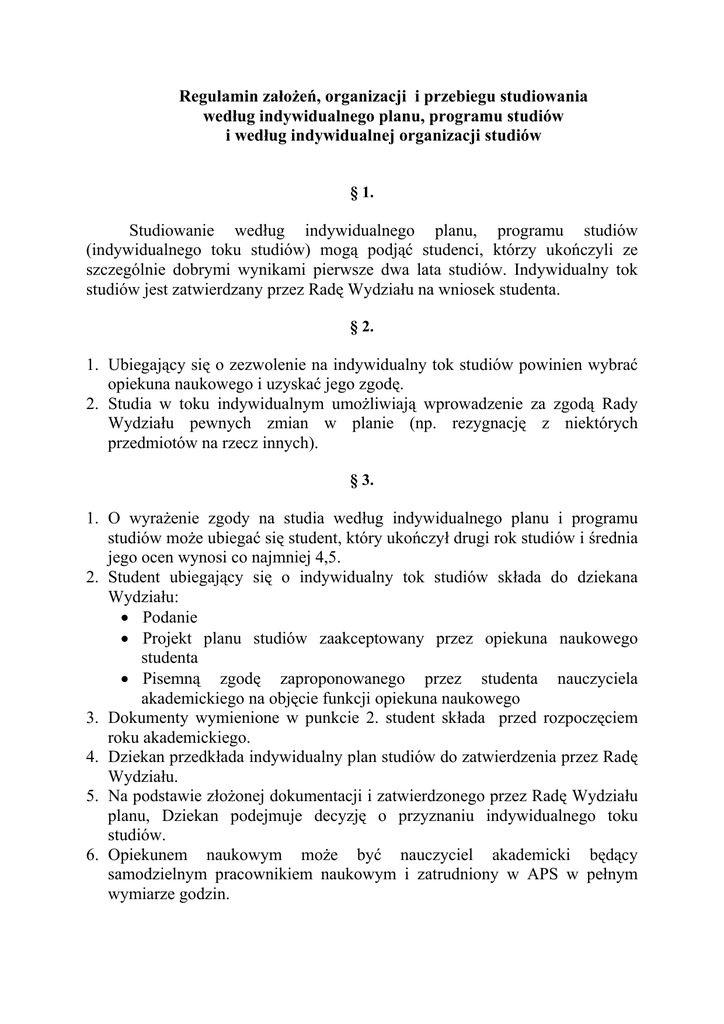 Regulamin założeń, organizacji i przebiegu studiowania według indywidualnego planu, programu studiów i według indywidualnej organizacji studiów § 1. Studiowanie według indywidualnego planu, programu studiów (indywidualnego toku studiów) mogą podjąć studenci, którzy ukończyli ze szczególnie dobrymi wynikami pierwsze dwa lata studiów. Indywidualny tok studiów jest zatwierdzany przez Radę Wydziału na wniosek studenta. § 2. 1. Ubiegający się o zezwolenie na indywidualny tok studiów powinien wybrać opiekuna naukowego i uzyskać jego zgodę. 2. Studia w toku indywidualnym umożliwiają wprowadzenie za zgodą Rady Wydziału pewnych zmian w planie (np. rezygnację z niektórych przedmiotów na rzecz innych). § 3. 1. O wyrażenie zgody na studia według indywidualnego planu i programu studiów może ubiegać się student, który ukończył drugi rok studiów i średnia jego ocen wynosi co najmniej 4,5. 2. Student ubiegający się o indywidualny tok studiów składa do dziekana Wydziału: • Podanie • Projekt planu studiów zaakceptowany przez opiekuna naukowego studenta • Pisemną zgodę zaproponowanego przez studenta nauczyciela akademickiego na objęcie funkcji opiekuna naukowego 3. Dokumenty wymienione w punkcie 2. student składa przed rozpoczęciem roku akademickiego. 4. Dziekan przedkłada indywidualny plan studiów do zatwierdzenia przez Radę Wydziału. 5. Na podstawie złożonej dokumentacji i zatwierdzonego przez Radę Wydziału planu, Dziekan podejmuje decyzję o przyznaniu indywidualnego toku studiów. 6. Opiekunem naukowym może być nauczyciel akademicki będący samodzielnym pracownikiem naukowym i zatrudniony w APS w pełnym wymiarze godzin. 7. Za opiekę nad studentami studiującymi według indywidualnego planu i programu nauczycielowi akademickiemu wlicza się do obowiązującego pensum 5 godzin za każdego studenta, jednak nie więcej niż 20 godzin łącznie. 8. Opiekun naukowy jest promotorem pracy magisterskiej. 9. Opiekun naukowy do końca roku akademickiego przedstawia Dziekanowi, na jego prośbę, informację o postępach w studiowaniu powierzonego jego opiece studenta. 10. Jeżeli student nie osiąga zadowalających wyników kształcenia, Dziekan podejmuje decyzję o cofnięciu zezwolenia na indywidualny tok studiów. § 4. Studiowanie według indywidualnej organizacji studiów przyznawane jest osobom, które z określonych przyczyn nie mogą realizować zajęć na danym roku studiów zgodnie z przewidzianym dla ich grupy planem dziekańskim. § 5. 1. Indywidualna organizacja studiów polega na określeniu indywidualnych terminów i sposobów realizacji obowiązków dydaktycznych wynikających z planu i programu studiów, w tym grupy dziekańskiej, zaliczeń, egzaminów, praktyk itp. 2. Zgodę na realizację studiów na zasadzie indywidualnej organizacji może uzyskać student po zaliczeniu I roku. 3. Student ubiegający się o zgodę na realizację studiów w danym semestrze lub roku akademickim według indywidualnej organizacji studiów, składa podanie wraz z uzasadnieniem do Dziekana Wydziału. 4. Zgodę na realizację studiów według indywidualnej organizacji wyraża Dziekan Wydziału. 5. Indywidualną organizację studiów, w tym uczestnictwo w zajęciach, terminy zaliczeń i egzaminów, ustala student z prowadzącymi przedmioty. 6. Realizacja studiów według indywidualnej organizacji nie zwalnia studenta od zaliczenia wszystkich przedmiotów i terminowego zdania wszystkich egzaminów przewidzianych planem studiów dla danego roku.