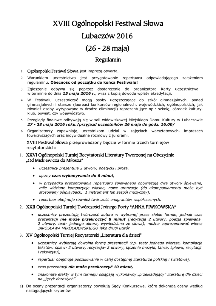XVIII Ogólnopolski Festiwal Słowa Lubaczów 2016 (26 - 28 maja) Regulamin 1. Ogólnopolski Festiwal Słowa jest imprezą otwartą. 2. Warunkiem uczestnictwa jest przygotowanie repertuaru regulaminu. Obecność od początku do końca Festiwalu! 3. Zgłoszenie odbywa się poprzez dostarczenie do organizatora Karty uczestnictwa w terminie do dnia 15 maja 2016 r., wraz z kopią dowodu wpłaty akredytacji. 4. W Festiwalu uczestniczyć mogą osoby uczęszczające do szkół gimnazjalnych, ponad gimnazjalnych i starsze (laureaci konkursów regionalnych, wojewódzkich, ogólnopolskich, jak również osoby wytypowane w drodze eliminacji) reprezentujące np.: szkołę, ośrodek kultury, klub, powiat, czy województwo. 5. Przeglądy finałowe odbywają się w sali widowiskowej Miejskiego Domu Kultury w Lubaczowie 27 - 28 maja 2016 roku./przyjazd uczestników 26 maja do godz. 16.00/ 6. Organizatorzy zapewniają uczestnikom udział w zajęciach towarzyszących oraz indywidualne rozmowy z jurorami. odpowiadającego warsztatowych, założeniom imprezach XVIII Festiwal Słowa przeprowadzony będzie w formie trzech turniejów recytatorskich: 1. XXVI Ogólnopolski Turniej Recytatorski Literatury Tworzonej na Obczyźnie „Od Mickiewicza do Miłosza” uczestnicy prezentują 2 utwory, poetycki i proza, łączny czas wykonywania do 6 minut, w przypadku prezentowania repertuaru śpiewanego obowiązują dwa utwory śpiewane, mile widziane kompozycje własne, nowe aranżacje (do akompaniamentu może być stosowany półplayback, 1 instrument lub zespół muzyczny), repertuar obejmuje również twórczość emigrantów współczesnych. 2. XXII Ogólnopolski Turniej Twórczości Jednego Poety *ANNA PIWKOWSKA* uczestnicy prezentują twórczość autora w wybranej przez siebie formie, jednak czas prezentacji nie może przekroczyć 8 minut (recytacja 2 utwory, poezja śpiewana 2 utwory, teatr jednego aktora, wywiedziona ze słowa), można zaprezentować wiersz JAROSŁAWA MIKOŁAJEWSKIEGO jako drugi utwór 3. XV Ogólnopolski Turniej Recytatorski „Literatura dla dzieci” uczestnicy wybierają dowolna formę prezentacji (np. teatr jednego wiersza, kompilacja tekstów: śpiew- 2 utwory, recytacja- 2 utwory, łączenie muzyki, tańca, śpiewu, recytacji i rekwizytu), repertuar obejmuje poszukiwania w całej dostępnej literaturze polskiej i światowej, czas prezentacji nie może przekroczyć 10 minut, znakomite efekty w tym turnieju osiągają wykonawcy „przekładający” literaturę dla dzieci na „język dorosłych”. a) Do oceny prezentacji organizatorzy powołują Sądy Konkursowe, które dokonują oceny według następujących kryteriów ogólny wyraz artystyczny, dobór repertuaru (do możliwości wykonawczych oraz wartości artystyczne) kultura słowa, interpretacja utworów, zgodność muzyki z charakterem prezentacji, b) Każdy uczestnik może wystąpić we wszystkich trzech Turniejach Festiwalowych, c) W każdym Turnieju jury przyzna nagrody główne (pieniężne i rzeczowe) oraz nagrody specjalne i wyróżnienia, d) Jury przyzna również GRAND PRIX uczestnikowi trzech Turniejów Festiwalowych oraz NAGRODĘ PUBLICZNOŚCI i NAGRODĘ INSTRUKTORSKĄ. ZASADY ORGANIZACYJNE 1.Organizatorem Konkursu jest Miejski Dom Kultury im. Aleksandra Sas-Bandrowskiego w Lubaczowie - Sekretariat Festiwalu - Miejski Dom Kultury w Lubaczowie ul. M. Konopnickiej 2 37-600 Lubaczów tel. 016 632 96 35 fax. 016 632 14 97 mail: [email protected], www.mdklubaczow.pl - Dyrektor Festiwalu - Andrzej Kindrat - dyrektor MDK - Konsultacja programowa - organizator Festiwalu - Grażyna Bielec [email protected] - wykonawcy, instruktorzy, nauczyciele, muzycy, akompaniatorzy pokrywają częściowe koszty pobytu w wysokości 110 zł od osoby. Wpłat należy dokonywać na konto Miejskiego Domu Kultury w Lubaczowie: 83 9101 0003 2001 0011 8747 0001 - organizatorzy zapewniają pełne wyżywienie i zakwaterowanie w internacie Zespołu Szkół w Lubaczowie, oraz bezpłatny udział w imprezach festiwalowych, - uczestnicy przyjeżdżają na własny koszt, - uczestnicy zgłaszają na karcie potrzeby techniczne dla prawidłowego przebiegu prezentacji, - organizator dysponuje pełnym oświetleniem sceny, fortepianem Bechstein, nagłośnieniem. Celem Festiwalu jest: • Popularyzacja i poznanie twórczości wybitnych autorów. • Inspirowanie do poszukiwań repertuarowych. • Utrwalanie piękna polskiego języka i kultury żywego słowa. • Doskonalenie umiejętności warsztatowych wykonawców. • Stworzenie okazji do prezentacji autorskich pomysłów scenicznych. • Umożliwienie spotkania i rozmów wokół istotnych wartości współczesnego człowieka, wyrażanych poprzez sztukę recytatorską.