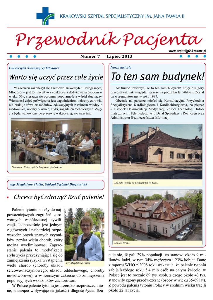KRAKOWSKI SZPITAL SPECJALISTYCZNY IM. JANA PAWŁA II Przewodnik Pacjenta www.szpitaljp2.krakow.pl Numer 7 O, MAMMO ! Warto się uczyć przez całe życie Uniwersytet Niegasnącej Młodości Zadbaj o zdrowie swoich piersi! W czerwcu się I semestr Uniwersytetunowotworem Niegasnącej u Rak piersi jestzakończył obecnie najczĊĞciej wystĊpującym Młodości – jest to inicjatywa edukacyjna dedykowana osobom w kobiet z krajów rozwiniĊtych. NaleĪy pamiĊtaü Īe nowotwory sutka wieku 60+, ciesząca się ogromna popularnością wśród słuchaczy. mogą wystĊpowaü równieĪ u mĊĪczyzn, są jednak bardzo rzadkie. Większość poświęcona zagadnieniom ochrony zdrowia, Wczesnezajęć wykrycie zmianjest nowotworowych i podjĊcie odponie brakuje również modułów edukacyjnych z zakresu wiedzy o wiedniego leczenia zwiĊksza szanse wyleczenia raka piersi! środowisku, wiedzy o sztuce, etyki, zagadnień technicznych. ZajęW diagnostyce schorzeĔ piersi wykorzystuje siĊ róĪne techniki cia będą wznowione po przerwie wakacyjnej, we wrześniu. obrazowania: 1/ Sonomammograa - czyli USG piersi – badanie z uĪyciem ultradĨwiĊków. Badanie to powinna wykonywaü kaĪda kobieta najlepiej w odstĊpach 1 roku. Badanie to jest caákowicie niebolesne i nieszkodliwe, dedykowane róĪnicowaniu zmian guzkowych, niewydolne w wykrywaniu wczesnych postaci raka. 2/ Badanie mammograczne - badanie z uĪyciem promieniowania rentgenowskiego. Nie moĪe byü wykonywane jako badanie przesiewowe u máodych kobiet. W badaniu pierĞ Ğciska siĊ miĊdzy dwoma páytkami. StopieĔ odczuwania ucisku zaleĪny jest od indywidualnej wraĪliwoĞci piersi. Badanie trwa bardzo krótko. 3/ Badanie piersi metoda rezonansu Słuchacze Uniwersytetu Niegasnącej Młodości magnetycznego - badaniem z uĪyciem pola elekromagnetycznego i gadolinowego Ğrodka kontrastowego. Badanie najbardziej czuáe i swoiste, jednak ze wzglĊdu na wysoki koszt badania i maáą dostĊpnoĞü (w dyspozycji wyspecjalizowanych poradni Tlałka, chorób sutka) dla wybranej grupy mgr Magdalena Oddziałzarezerwowane Szybkiej Diagnostyki pacjentek. Mammograa i usg to dwa róĪne, uzupeániające siĊ badania, nie naleĪy wiĊc zastanawiaü siĊ, które jest „lepsze”. KaĪde z nich ma swoje zalety i wady – na przykáad ultrasonograa nie wykrywa mikrozwapnieĔ, które mogą byü objawem wczesnej postaci raka. Palenie tytoniu należy Badania mammogra czne do to najwciąĪ najskuteczniejsza metoda poważniejszych zagrożeń zdro- Z doĞwiadczeĔ krajów skanwczesnego diagnozowania raka piersi. Chcesz być zdrowy? Rzuć palenie! Lipiec 2013 Nasza historiaRadiologii Zakład i Diagnostyki Obrazowej Rejestracja na badania: (012) 614 3333, w godz. 7:30-18:00 To ten sam budynek! Aż trudno uwierzyć, ze to ten sam budynek! Zdjęcie u góry dynawskich wynika Īe badania przesiewowe piersi pozwoliáy zreduprzedstawia, jak wyglądał jeszcze początku Zostałw kowaü umieralnoĞü z powodu raka na piersi o ok. lat 30 90-tych. proc. Zmiany on wyremontowany w roku 1997. piersi czĊsto wykrywane są przez same kobiety – jest to jednak na nazaawansowana parterze mieści się Konsultacyjna Przychodnia ogóá Obecnie juĪ zmiana Specjalistyczna Kardiologiczna i Kardiochirurgiczna, na wykonypiętrze Pierwsza mammograa w Īyciu kobiety powinna byü – Ośrodek Dokumentacji Medycznej, Zespół Technologii Inforwana w 40-tym roku Īycia, bez wzglĊdu na wielkoĞü i typ utkania matycznych i Telemedycznych, Dział Sprzedaży i Rozliczeń oraz piersi. Administrator Bezpieczeństwa Szpital im. Jana Pawáa II w Informacji. Krakowie bierze udziaá w licznych programach prolaktycznych dedykowanych dla kobiet mieszkanek województwa maáopolskiego nansowanych przez róĪne podmioty, umoĪliwiając wykonanie bezpáatnych badan piersi, bez wymaganego skierowania. Stale od kilku realizowany jest program NFZ - screening mammograczny raka piersi dla kobiet w wieku 50-69. Dodatkowo wykonywane są równieĪ bezpáatnie badania prolaktyczne dla paĔ z innych grup wiekowych od 40-tego roku Īycia. O dostĊpnoĞü programów naleĪy pytaü w rejestracji Zakáadu Radiologii i Diagnostyki Obrazowej w budynku diagnostyki. MoĪna równieĪ skorzystaü z badaĔ samonansowanych przez pacjentki. Szpital im. Jana Pawáa II pacjentki dysponuje nowoczesnym cyfrowym aparatem mammogracznym. Technika cyfrowa gwarantuje: - wysoką rozdzielczoĞü obrazu - bardzo dobry kontrast było jeszcze powiĊkszenia na początku lat 90-tych... -Tak moĪliwoĞü zdjĊcia na ekranie monitora, co znacznie uáatwia lekarzowi postawienie diagnozy - duĪo niĪszą niĪ w aparatach analogowych dawkĊ promieniowania - moĪliwoĞü rejestrowania badania na noĞniku elektronicznym - archiwizacjĊ wykonanych badaĔ w bazie danych Konsultacja: dr Maágorzata UrbaĔczyk-Zawadzka wotnych współczesnej cywilizacji. Jednocześnie jest jednymUrbańczyk – Zawadzką, Kierownik Zakładu Radiologii i Diagnostyki Obrazowej Rozmowa z dr Małgorzatą z głównych i najbardziej rozpowszechnionych znanych czynniCzyryzyka badanie wielu mammograficzne nej pierwszej miesiączki, późnej menopauzy, u pań stosujących anków chorób, należy który do standardowych, takich, o którym panie powinny pamiętać, czy Tak jest teraz... tykoncepcję hormonalną lub hormonoterapię. Mówiąc o podwyższomożna sięwyeliminować. Zaprzeudajemy na nie wtedy, jeśli inne badania – np. usg nym ryzyku trzeba również brać pod uwagę obecne inne schorzenia –stanie wskazująpalenia na sytuacjętoniepokojącą? narządu rodnego : endometriozę, torbiele jajnika, mięśniaki. modyfikacja Badanie mammograficzne piersi powinniśmy traktować jako Czy badanie mammograficzne jest skuteczne? cuje się, iż pali 29% populacji, co stanowi około 9 mistylu życia przyczyniająca się do stałą pozycję w harmonogramie badan profilaktycznych u kobiet Jest ono najskuteczniejszą ogólnie dostępną metodą w wykrylionów ludzi, w tym 34% mężczyzn i 