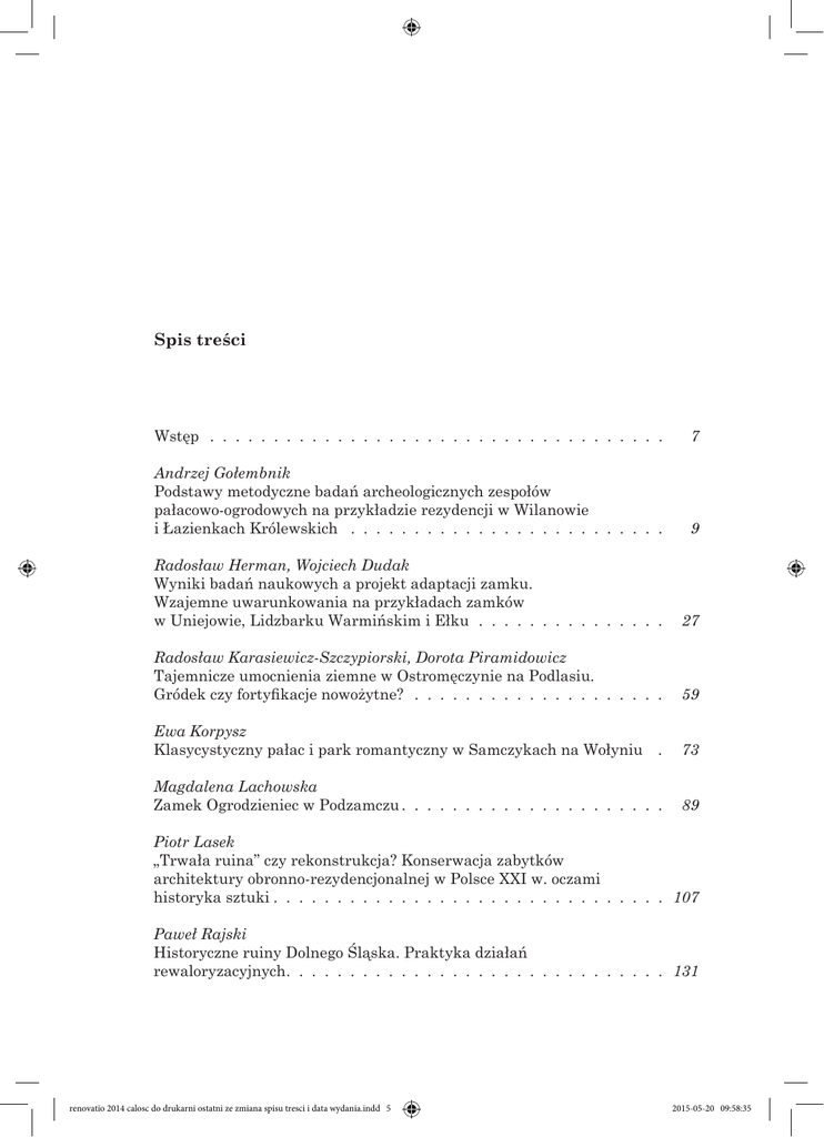 Spis treści Wstęp . . . . . . . . . . . . . . . . . . . . . . . . . . . . . . . . . . . . . 7 Andrzej Gołembnik Podstawy metodyczne badań archeologicznych zespołów pałacowo-ogrodowych na przykładzie rezydencji w Wilanowie i Łazienkach Królewskich . . . . . . . . . . . . . . . . . . . . . . . . . . 9 Radosław Herman, Wojciech Dudak Wyniki badań naukowych a projekt adaptacji zamku. Wzajemne uwarunkowania na przykładach zamków w Uniejowie, Lidzbarku Warmińskim i Ełku . . . . . . . . . . . . . . . 27 Radosław Karasiewicz-Szczypiorski, Dorota Piramidowicz Tajemnicze umocnienia ziemne w Ostromęczynie na Podlasiu. Gródek czy fortyfikacje nowożytne? . . . . . . . . . . . . . . . . . . . . 59 Ewa Korpysz Klasycystyczny pałac i park romantyczny w Samczykach na Wołyniu . 73 Magdalena Lachowska Zamek Ogrodzieniec w Podzamczu . . . . . . . . . . . . . . . . . . . . 89 Piotr Lasek „Trwała ruina” czy rekonstrukcja? Konserwacja zabytków architektury obronno-rezydencjonalnej w Polsce XXI w. oczami historyka sztuki . . . . . . . . . . . . . . . . . . . . . . . . . . . . . . 107 Paweł Rajski Historyczne ruiny Dolnego Śląska. Praktyka działań rewaloryzacyjnych . . . . . . . . . . . . . . . . . . . . . . . . . . . . . 131 renovatio 2014 calosc do drukarni ostatni ze zmiana spisu tresci i data wydania.indd 5 2015-05-20 09:58:35 6 Spis treści Piotr Sypczuk Gaj w Gucinie. Powojenna dewastacja, fenomen recepcji i postulaty restytucji parku-pomnika . . . . . . . . . . . . . . . . . . . 151 Małgorzata Szafrańska Ogrody i polityka. Sto lat odnawiania ogrodów Zamku Królewskiego w Warszawie . . . . . . . . . . . . . . . . . . . . . . . . 181 Tadeusz J. Żuchowski Zamek zrekonstruowany. Problemy ochrony zabytków – problemy z zabytkami . . . . . . . . . . . . . . . . . . . . . . . . . . . 199 Bibliografia . . . . . . . . . . . . . . . . . . . . . . . . . . . . . . . . . 223 Indeks osób . . . . . . . . . . . . . . . . . . . . . . . . . . . . . . . . . 235 Indeks miejscowości . . . . . . . . . . . . . . . . . . . . . . . . . . . . renovatio 2014 calosc do drukarni ostatni ze zmiana spisu tresci i data wydania.indd 6 241 2015-05-20 09:58:35