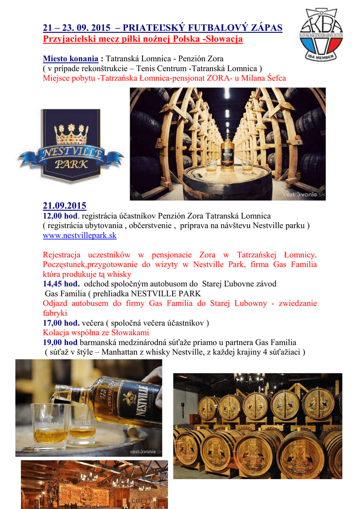 21 – 23. 09. 2015 – PRIATEĽSKÝ FUTBALOVÝ ZÁPAS Przyjacielski mecz piłki nożnej Polska -Słowacja Miesto konania : Tatranská Lomnica - Penzión Zora ( v prípade rekonštrukcie – Tenis Centrum -Tatranská Lomnica ) Miejsce pobytu -Tatrzańska Łomnica-pensjonat ZORA- u Milana Śefca 21.09.2015 12,00 hod. registrácia účastníkov Penzión Zora Tatranská Lomnica ( registrácia ubytovania , občerstvenie , príprava na návštevu Nestville parku ) www.nestvillepark.sk Rejestracja uczestników w pensjonacie Zora w Tatrzańskej Łomnicy. Poczęstunek,przygotowanie do wizyty w Nestville Park, firma Gas Familia która produkuje tą whisky 14,45 hod. odchod spoločným autobusom do Starej Ľubovne závod Gas Familia ( prehliadka NESTVILLE PARK Odjazd autobusem do firmy Gas Familia do Starej Lubowny - zwiedzanie fabryki 17,00 hod. večera ( spoločná večera účastníkov ) Kolacja wspólna ze Słowakami 19,00 hod barmanská medzinárodná súťaže priamo u partnera Gas Familia ( súťaž v štýle – Manhattan z whisky Nestville, z každej krajiny 4 súťažiaci ) Konkurs barmański w stylu „Manhattan“ Po 4 uczestników z kazdego kraju ,przygotowanie drinków na bazie whisky Nestville 22,00 hod spoločný odchod autobusom do Tatranskej Lomnice Odjazd do Tatrzańskiej Łomnicy 22.09.2015 08,00 - 09,30 hod. raňajky -śniadanie 10,30 hod spoločný odchod na futbalové ihrisko v Tatranskej Lomnici ( rozdelenie hráčov, rozhodcov ) Wspólny wyjazd na mecz piłkarski 11,30 hod Slávnostný výkop ( začiatok priateľského futbalového zápasu ) Rozpoczęcie meczu Polska -Słowacja 12,45 hod ukončenie priateľského futbalového zápasu Zakończenie przyjacielskiego meczu 13,00 hod spoločný odchod späť Powrót 14,00 hod spoločný obed Obiad wspólny (15,00 – 17,30 hod. ind. oddych príprava na večer ) Odpoczynek , przygotowanie do wieczornej imprezy 17,30 hod SPOLOČNÁ VEČERA Wspólna kolacja ( hudba , jelení guláš, grilované špeciality ) do neskorých večerných hodín Impreza, gulasz z jelenia ,grilowane specjały słowackiej kuchni - zabawa do białego rana....... 23.09.2015 08,00 - 09,30 hod. raňajky –śniadanie Individuálny odchod. – indywidualne odjazdy Koszt całej imprezy ze wszystkimi atrakcjami - 60 EUR ( prosze zabrać ze soba) Zgłoszenia prosimy kierować do kol. Bartłomieja Gawlaka - Kubika do 15 września 2015. ( tel. 605 057 077 ) Zapraszamy barmanów i barmanki z całej Polski. Po 15 września nie będzie możliwosci uczestnictwa ze względów organizacyjnych po stronie słowackiej . Z barmańskim pozdrowieniem Bartłomiej Gawlak-Kubik