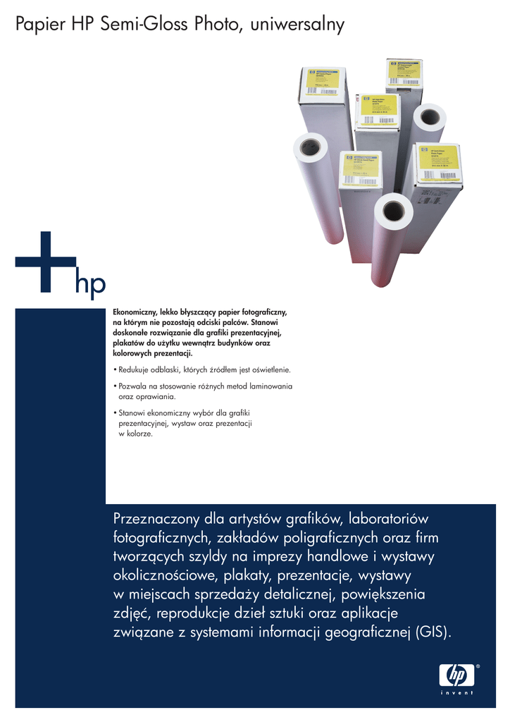 Papier HP Semi-Gloss Photo, uniwersalny Ekonomiczny, lekko błyszczcy papier fotograficzny, na którym nie pozostaj odciski palców. Stanowi doskonałe rozwizanie dla grafiki prezentacyjnej, plakatów do uytku wewntrz budynków oraz kolorowych prezentacji. • Redukuje odblaski, których *ródłem jest owietlenie. • Pozwala na stosowanie rónych metod laminowania oraz oprawiania. • Stanowi ekonomiczny wybór dla grafiki prezentacyjnej, wystaw oraz prezentacji w kolorze. Przeznaczony dla artystów grafików, laboratoriów fotograficznych, zakładów poligraficznych oraz firm tworzcych szyldy na imprezy handlowe i wystawy okolicznociowe, plakaty, prezentacje, wystawy w miejscach sprzeday detalicznej, powikszenia zdjć, reprodukcje dzieł sztuki oraz aplikacje zwizane z systemami informacji geograficznej (GIS). Papier HP Semi-Gloss Photo, uniwersalny Pełna zgodno"ć Drukarki HP Designjet HP Designjet seria 5500 HP Designjet seria 5000 HP Designjet seria 3000 HP Designjet seria 2000 HP Designjet seria 1000 HP Designjet seria 800 HP Designjet seria 700 HP Designjet seria 400 HP Designjet seria 500 Systemy atramentowe HP Barwnikowy system atramentowy HP nr 81, zgodny równie z pigmentowym systemem atramentowym (UV) HP nr 83 (DJ 5500) Pigmentowy system atramentowy (UV) HP nr 83, zgodny równie z barwnikowym systemem atramentowym HP nr 81 (DJ 5000) System atramentowy HP CP Ink barwnikowy/UV System atramentowy HP CP Ink barwnikowy/UV System atramentowy HP nr 80 Systemy atramentowe HP nr 10, 11 i 82 System atramentowy HP nr 45 Systemy atramentowe HP nr 40 i 44 Systemy atramentowe HP nr 10, 11 i 82 Drukarki wielkoformatowe innych producentów EnCad NovaJet 500 + 700, Pro E Epson Stylus PRO 7000 (24-calowe rolki) + 9000 Zapraszamy do odwiedzenia strony www.hp.com/go/designjet/supplies/support w celu pobrania najnowszych profili ICC/Media (naley kliknć profile ICC i wybrać odpowiedni drukark). W przypadku drukarek nieobsługujcych PostScriptu prosimy skontaktować si ze swoim lokalnym sprzedawc procesorów obrazu (RIP). Gramatura 190 g/m2 Grubo"ć 6 milów/168 mikronów Nieprzejrzysto"ć 95% zgodnie z metod testow TAPPI T-452 Jaskrawo"ć 89% zgodnie z metod testow TAPPI T-452 Biel 105 Laminowanie Na gorco i na zimno Oprawianie Tak Temperatura eksploatacji Od 15 do 30°C Eksploatacyjna wilgotno"ć wzgl-dna Od 30 do 70% Odporno"ć na działanie "wiatła 3 miesice w pomieszczeniach zamknitych (gdy delta E < 10) Odporno"ć na działanie wody Delta OD < 0,5 Zgodno"ć atramentów Systemy atramentowe: barwnikowe oraz pigmentowe UV Czas wysychania Poniej 10 minut 0ywotno"ć rynkowa 2 lata (zamknite) Temperatura składowania Od 5 do 40°C Wilgotno"ć wzgl-dna składowania Od 10 do 80% Kraj pochodzenia Stany Zjednoczone Numery katalogowe HP Numer produktu Q1420A Q1421A Q1422A Q5466A Q1423A Q1424A Gwarancja HP gwarantuje, e wielkoformatowe materiały drukarskie HP s wolne od defektów i wad produkcyjnych, i s tak zaprojektowane, by przy właciwym uytkowaniu nie powodować zacić drukarki. Jeli z jakiegokolwiek powodu uytkownik jest niezadowolony z wielkoformatowego materiału drukarskiego HP, powinien skontaktować si ze swoim sprzedawc. Wymiary no"nika w roli 610 mm x 30 m 914 mm x 30 m 1067 mm x 30 m 1270 mm x 30 m 1372 mm x 30 m 1524 mm x 30 m ©2003 Hewlett-Packard Development Company, L.P. Specyfikacje zawarte w tym dokumencie mog bez uprzedzenia ulec zmianie. Wszystkie gwarancje udzielane w odniesieniu do Produktów i Usług HP okrelone zostały w owiadczeniach gwarancyjnych załczanych do kadego produktu i usługi. ?aden zapis niniejszego dokumentu nie moe być uwaany za dodatkow gwarancj. HP nie ponosi odpowiedzialnoci za błdy techniczne lub drukarskie w niniejszym dokumencie. Wicej informacji na temat wielkoformatowych materiałów drukarskich HP znale*ć mona na stronach internetowych www.hp.com/go/designjet/supplies. 5982-3712PLE, 02/2004 Kody upc 7 25184 66032 0 7 25184 66033 7 7 25184 66034 4 8 29160 03185 9 NOWO3Ć! 7 25184 66035 1 7 25184 66036 8