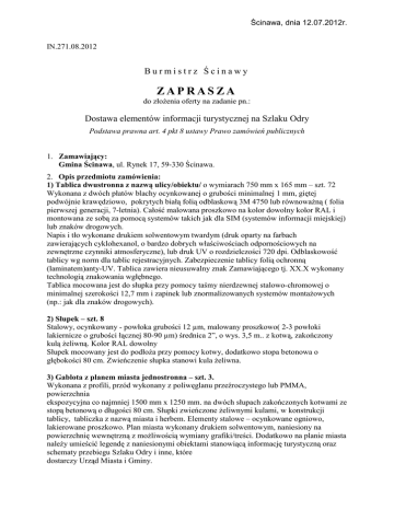 Ścinawa, dnia 12.07.2012r. IN.271.08.2012 Burmistrz Ścinawy ZAPRASZA do złoŜenia oferty na zadanie pn.: Dostawa elementów informacji turystycznej na Szlaku Odry Podstawa prawna art. 4 pkt 8 ustawy Prawo zamówień publicznych 1. Zamawiający: Gmina Ścinawa, ul. Rynek 17, 59-330 Ścinawa. 2. Opis przedmiotu zamówienia: 1) Tablica dwustronna z nazwą ulicy/obiektu/ o wymiarach 750 mm x 165 mm – szt. 72 Wykonana z dwóch płatów blachy ocynkowanej o grubości minimalnej 1 mm, giętej podwójnie krawędziowo, pokrytych białą folią odblaskową 3M 4750 lub równowaŜną ( folia pierwszej generacji, 7-letnia). Całość malowana proszkowo na kolor dowolny kolor RAL i montowana ze sobą za pomocą systemów takich jak dla SIM (systemów informacji miejskiej) lub znaków drogowych. Napis i tło wykonane drukiem solwentowym twardym (druk oparty na farbach zawierających cyklohexanol, o bardzo dobrych właściwościach odpornościowych na zewnętrzne czynniki atmosferyczne), lub druk UV o rozdzielczości 720 dpi. Odblaskowość tablicy wg norm dla tablic rejestracyjnych. Zabezpieczenie tablicy folią ochronną (laminatem)anty-UV. Tablica zawiera nieusuwalny znak Zamawiającego tj. XX.X wykonany technologią znakowania wgłębnego. Tablica mocowana jest do słupka przy pomocy taśmy nierdzewnej stalowo-chromowej o minimalnej szerokości 12,7 mm i zapinek lub znormalizowanych systemów montaŜowych (np.: jak dla znaków drogowych). 2) Słupek – szt. 8 Stalowy, ocynkowany - powłoka grubości 12 µm, malowany proszkowo( 2-3 powłoki lakiernicze o grubości łącznej 80-90 µm) średnica 2”, o wys. 3,5 m.. z kotwą, zakończony kulą Ŝeliwną. Kolor RAL dowolny Słupek mocowany jest do podłoŜa przy pomocy kotwy, dodatkowo stopa betonowa o głębokości 80 cm. Zwieńczenie słupka stanowi kula Ŝeliwna. 3) Gablota z planem miasta jednostronna – szt. 3. Wykonana z profili, przód wykonany z poliwęglanu przeźroczystego lub PMMA, powierzchnia ekspozycyjna co najmniej 1500 mm x 1250 mm. na dwóch słupach zakończonych kotwami ze stopą betonową o długości 80 cm. Słupki zwieńczone Ŝeliwnymi kulami, w konstrukcji tablicy, tabliczka z nazwą miasta i herbem. Elementy stalowe – ocynkowane ogniowo, lakierowane proszkowo. Plan miasta wykonany drukiem solwentowym, naniesiony na powierzchnię wewnętrzną z moŜliwością wymiany grafiki/treści. Dodatkowo na planie miasta naleŜy umieścić legendę z naniesionymi obiektami stanowiącą informację turystyczną oraz schematy przebiegu Szlaku Odry i inne, które dostarczy Urząd Miasta i Gminy. Dostawa i montaŜ wszystkich elementów przedmiotu zamówienia po uzgodnieniu i w miejscach wskazanych przez Zamawiającego. 3. Wymagany termin realizacji zamówienia: do 30 sierpnia 2012 roku. 4. Zamawiający przy wyborze oferty najkorzystniejszej będzie stosował wyłącznie kryterium ceny – waga 100%. 5. Wykonawca składający ofertę dołącza następujące dokumenty: 1) Wypełniony i podpisany formularz ofertowy – zał. nr 1; 2) Kserokopię aktualnego wpisu do właściwego rejestru, uprawniającego Wykonawcę do występowania w obrocie prawnym oraz zaświadczenie o nadaniu numeru NIP, potwierdzone za zgodność z oryginałem przez Wykonawcę. 6. Opis sposobu obliczenia ceny. 1) Cena oferty powinna zawierać wszelkie koszty niezbędne do wykonania całego przedmiotu Zamówienia określonego w niniejszej zaproszeniu; 2) Cenę naleŜy podać w złotych polskich brutto; 3) Za wykonanie całego przedmiotu zamówienia ustala się wynagrodzenie ryczałtowe, niezmienne przez cały okres trwania umowy; 4) Rozliczenia między Zamawiającym a Wykonawcą prowadzone będą w polskich złotych (PLN). Nie przewiduje się rozliczeń w walutach obcych; 5) Zamawiający nie dopuszcza przedstawiania ceny ryczałtowej w kilku wariantach, w zaleŜności od zastosowanych rozwiązań. W przypadku przedstawiania ceny w taki sposób oferta będzie niewaŜna; 6) Prawidłowe ustalenie stawki podatku VAT leŜy po stronie Wykonawcy. NaleŜy przyjąć obowiązującą stawkę podatku VAT 7. Sposób przygotowania oferty cenowej: 1) Ofertę cenową naleŜy złoŜyć w zamkniętej kopercie, na której naleŜy umieścić nazwę i adres Zamawiającego, nazwę i adres Zleceniobiorcy oraz nazwę zadania: „Dostawa elementów informacji turystycznej na Szlaku Odry” wraz z zapisem nie otwierać przed dniem 16.07.2012r. godz. 13:30. 2) Ceny podane w ofercie powinny być wyraŜone cyfrowo i słownie; 3) Oferta ma być napisana w języku polskim, czytelną i trwałą techniką; 4) Ofertę naleŜy przygotować na załączonym do niniejszego zaproszenia wzorze dla propozycji cenowej – zał. nr 1; 5) Wykonawca moŜe wprowadzić zmiany lub wycofać złoŜoną przez siebie ofertę przed ostatecznym terminem składania ofert. 8. Miejsce i termin składania ofert. 1) Oferty naleŜy składać w siedzibie zamawiającego: Ścinawa ul. Rynek 17 pok. nr 21 sekretariat do dnia 16.07.2012r. do godz. 13.00. 2) Oferty złoŜone po tym terminie będą niezwłocznie zwrócone Wykonawcom bez otwierania. 9. Wybór oferty najkorzystniejszej. 1) O wyniku postępowania zostaną powiadomieni wszyscy Wykonawcy, którzy złoŜyli oferty. Informacja ta zostanie zamieszczona na stronie internetowej i na tablicy ogłoszeń w siedzibie Zamawiającego; 2) W przypadku, gdy w określonym terminie nie wpłynie Ŝadna oferta lub wpłynie/wpłyną mniej niŜ dwie waŜne oferty, Zamawiający uniewaŜnia to postępowanie i przeprowadza ponowne. 10. Informacje dotyczące zawarcia umowy. Umowa (zał. nr 2) z wybranym Wykonawcą zostanie podpisana w terminie do siedmiu dni od daty powiadomienia o wyborze oferty. 11. Osobami uprawnionymi do porozumiewania się z Wykonawcami są: Jarosław Paczkowski – tel.: 076-841-26-15, Artur Szponarski – tel.: 076-841-26-18. ZAŁĄCZNIKI: Zał. nr 1 – Formularz ofertowy Zał. nr 2 – Wzór umowy